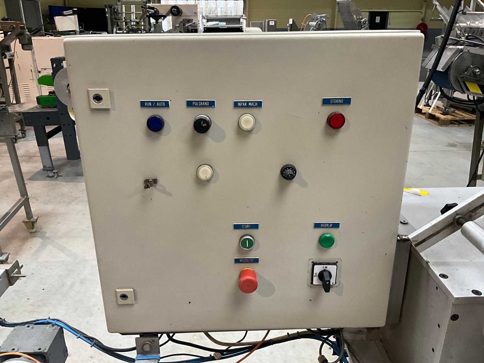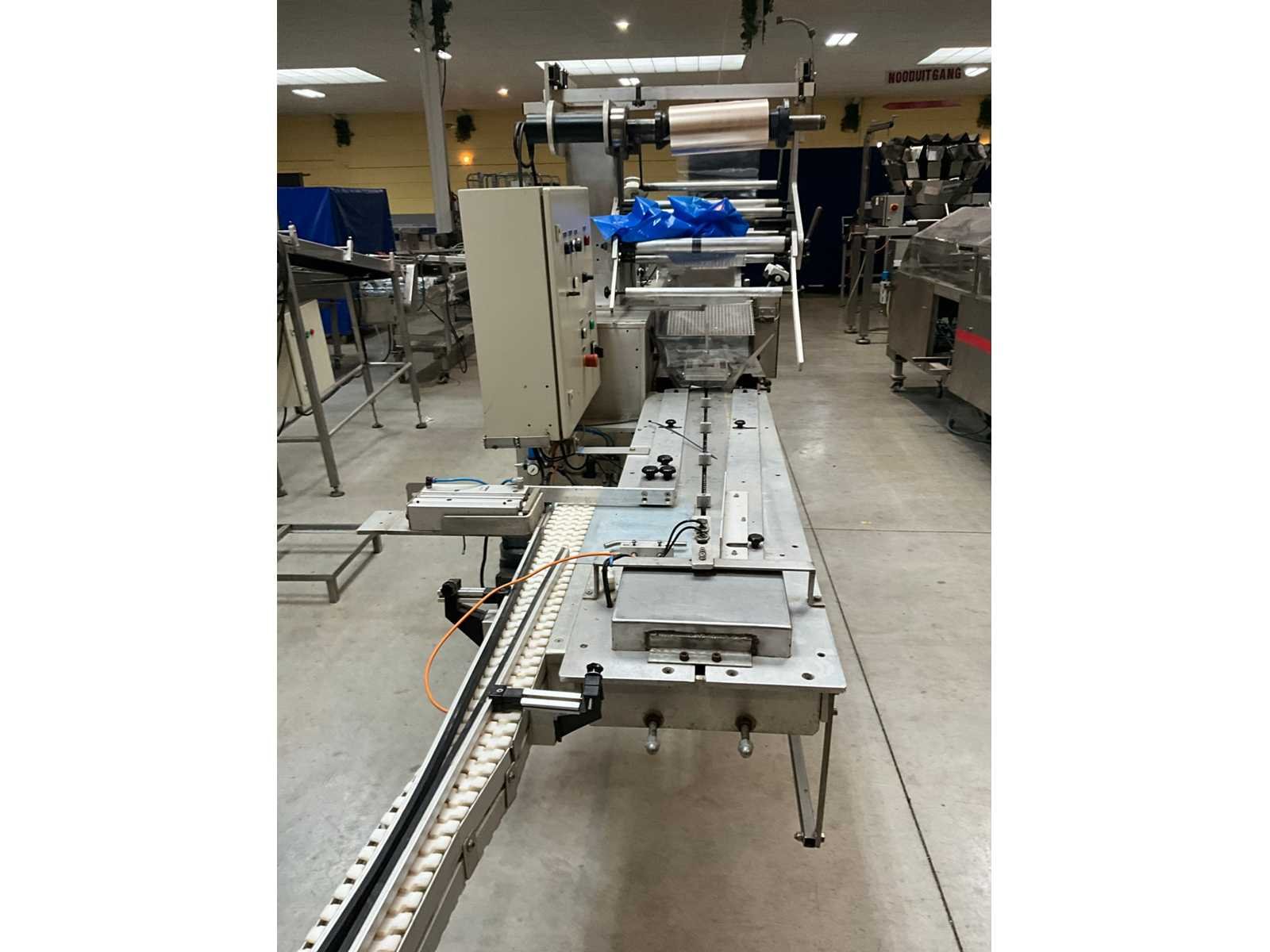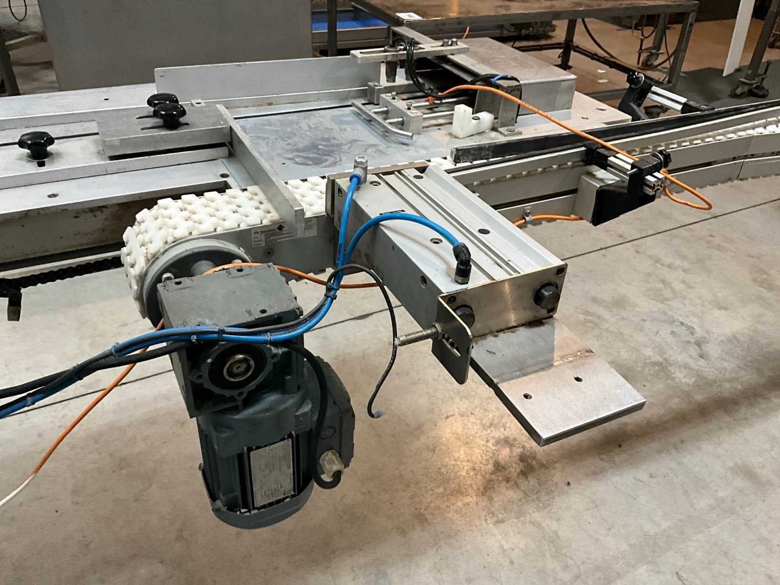 Merk: Tevopharm Type: Pack V Transportband afm. b: 190mm Totale afmeting L: 4800mm Totale afmeting Breedte: 1100mm Totale afmeting Hoogte: 2100mm