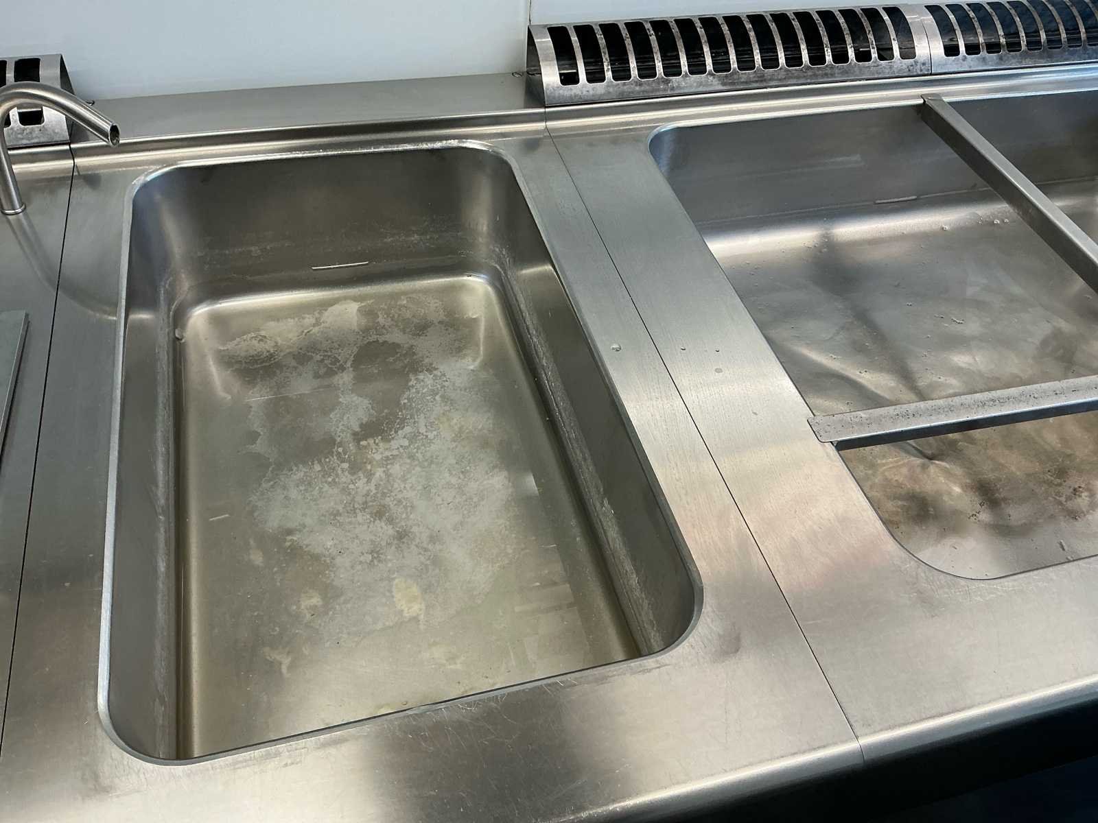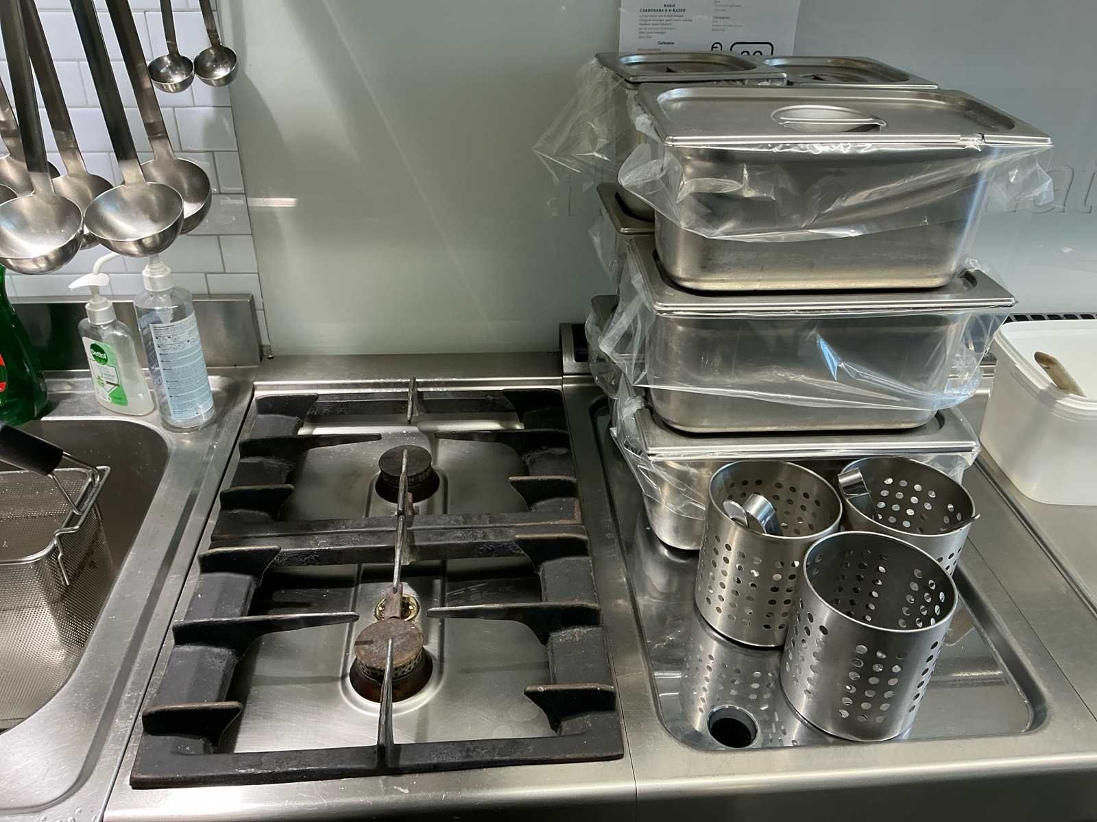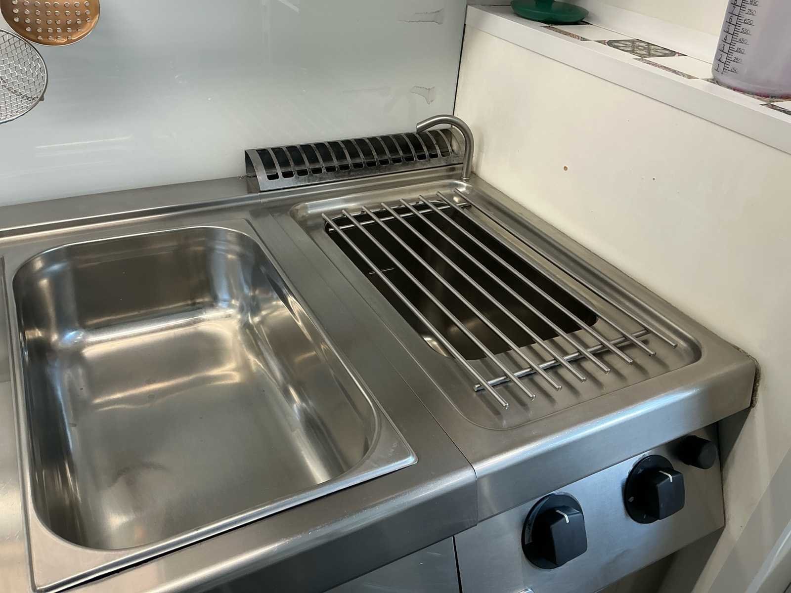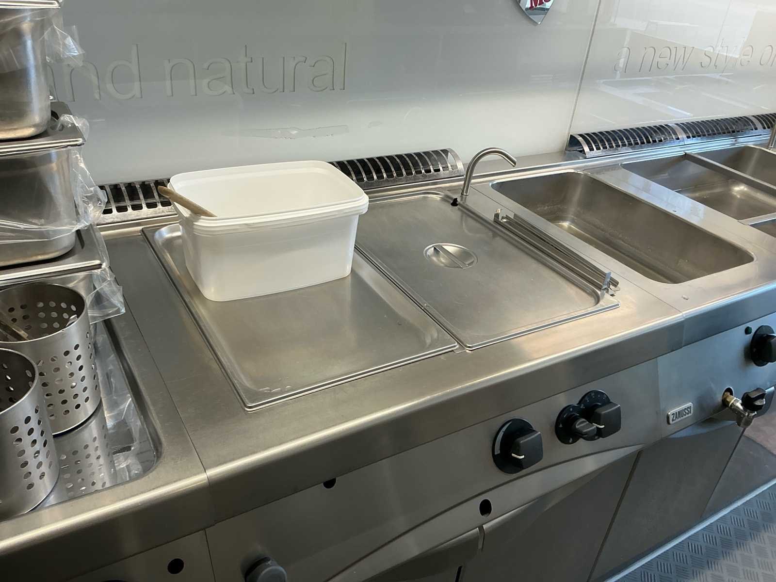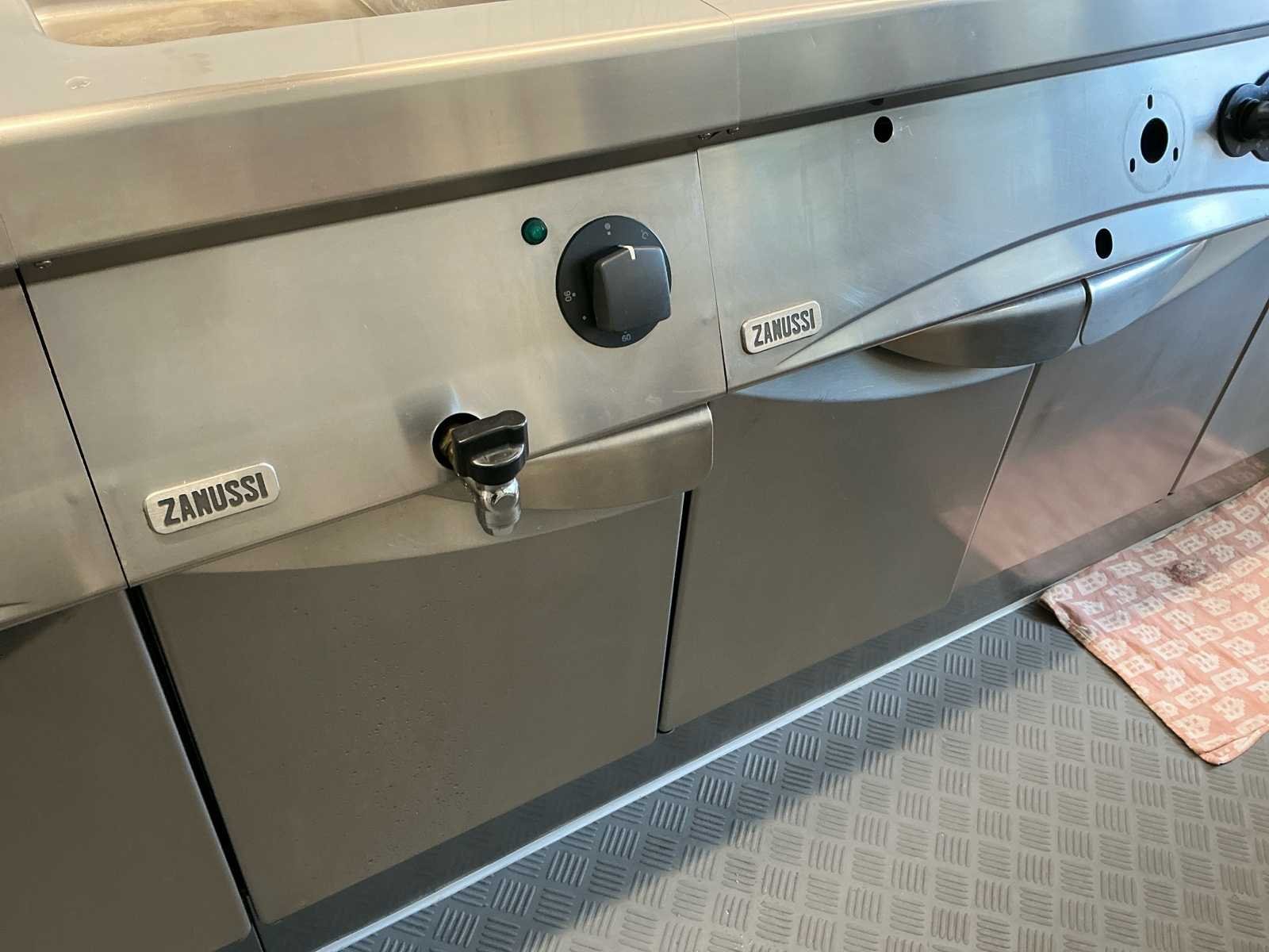 Volledige inox keuken bestaande uit: GGMGASTRO vaatwasser (2024), spoeltafel met kranen, Zanussi 2-pits gasvuur + bakplaat, Zanussi elektrische bain-marie, 2 Zanussi bain-marie op gas, 2 pastakokers op gas. Inox wandrek over de gehele lengte. Inox dampkap met buiten motor. Alles in perfect werkende staat. Alle elementen zijn maximum 10 jaar oud en steeds goed onderhouden. Inclusief alle zichtbare keukenaccessoires. Zelf te demonteren. Dit werd steeds gebruikt in een pasta zaak maar kan ook voor andere concepten dienen. Merk: Zanussi Materiaal: Inox