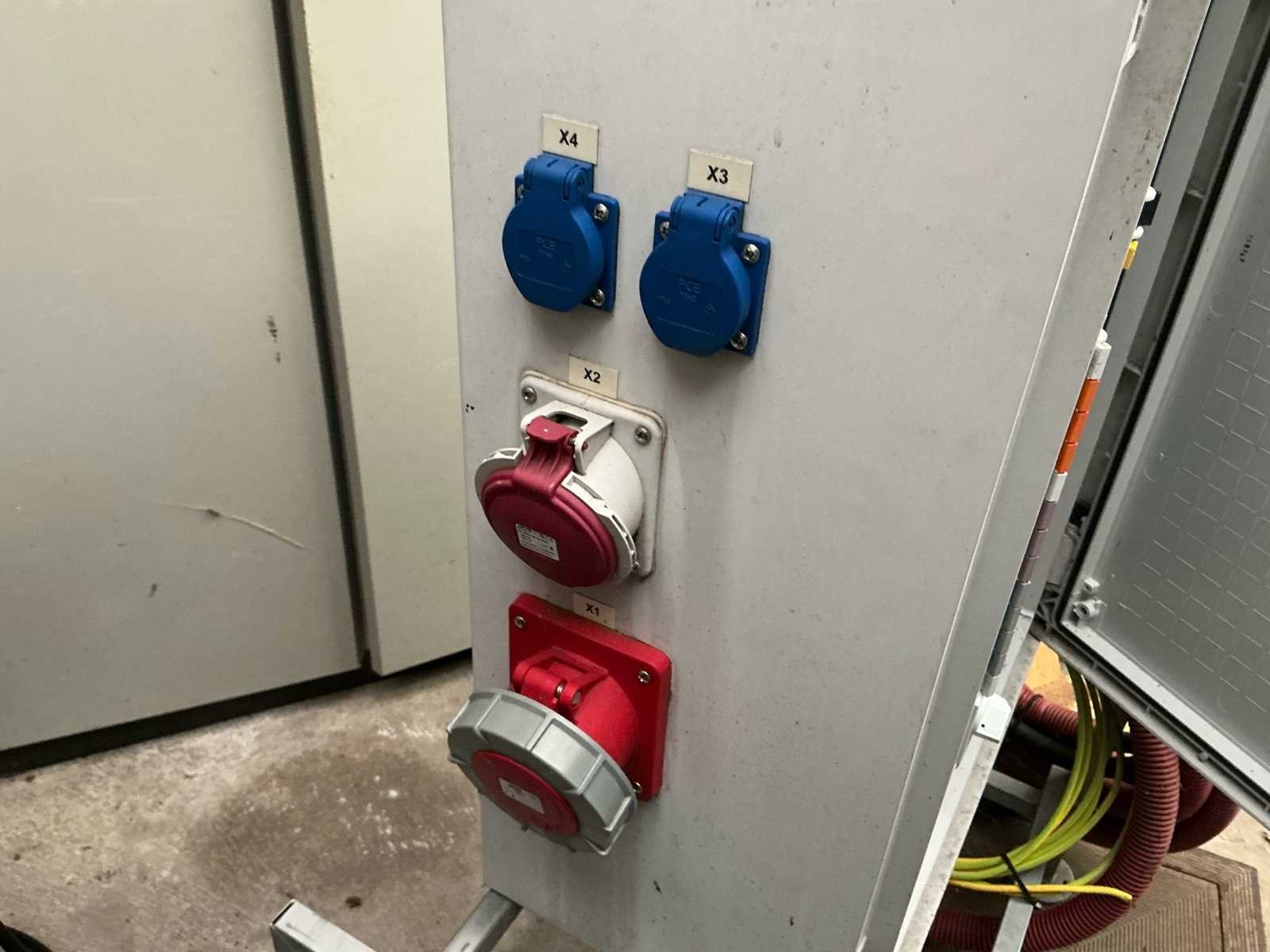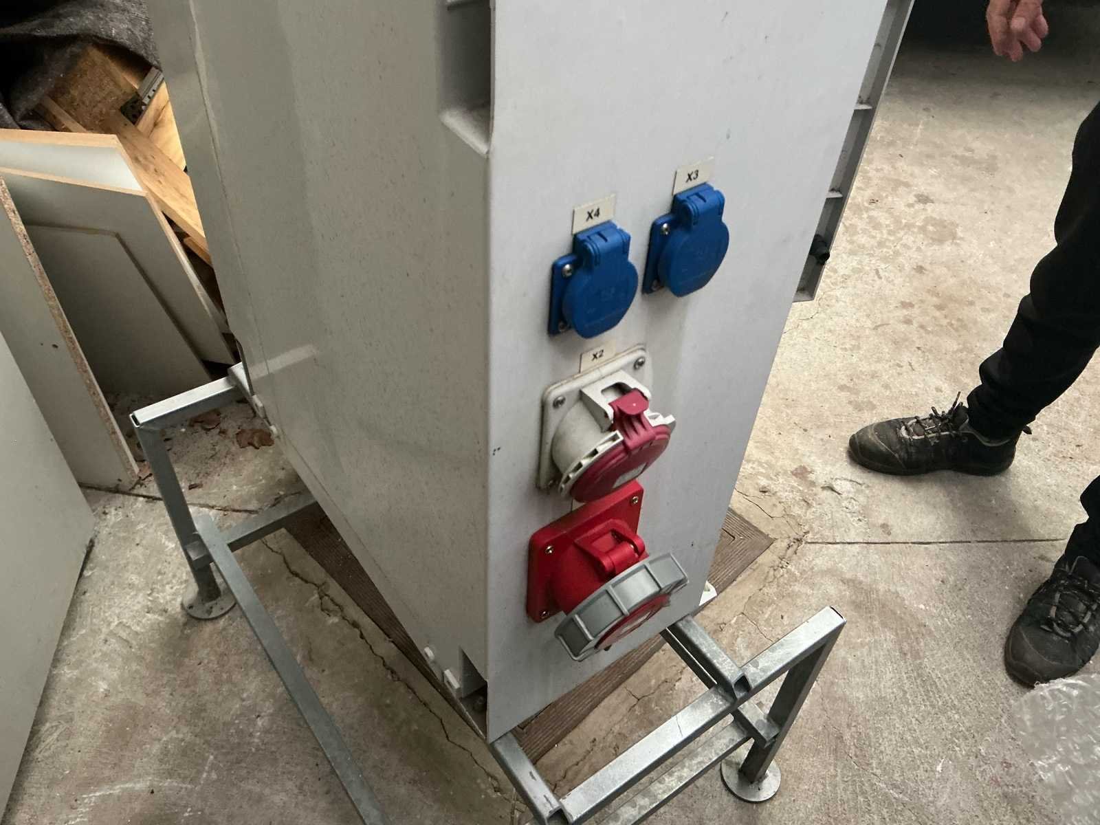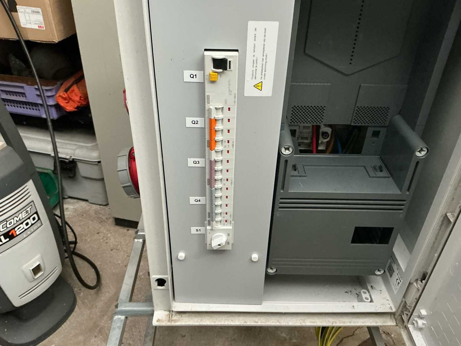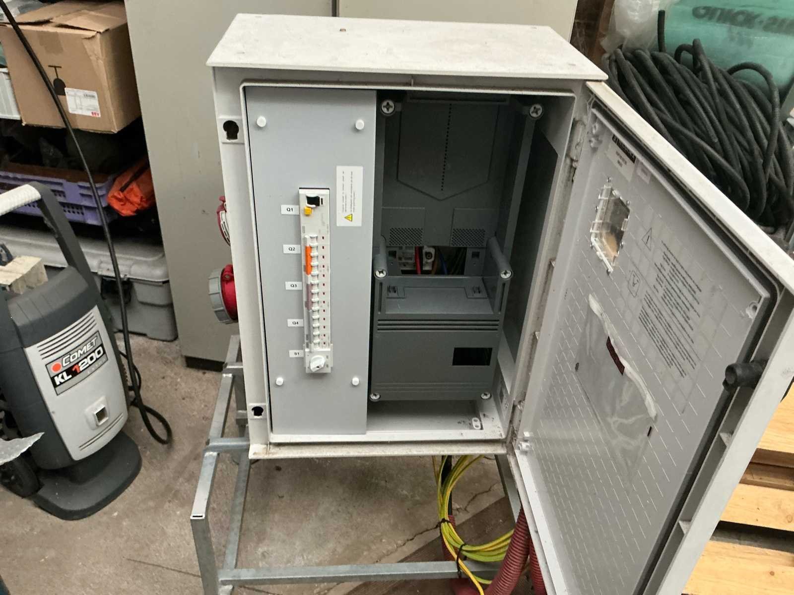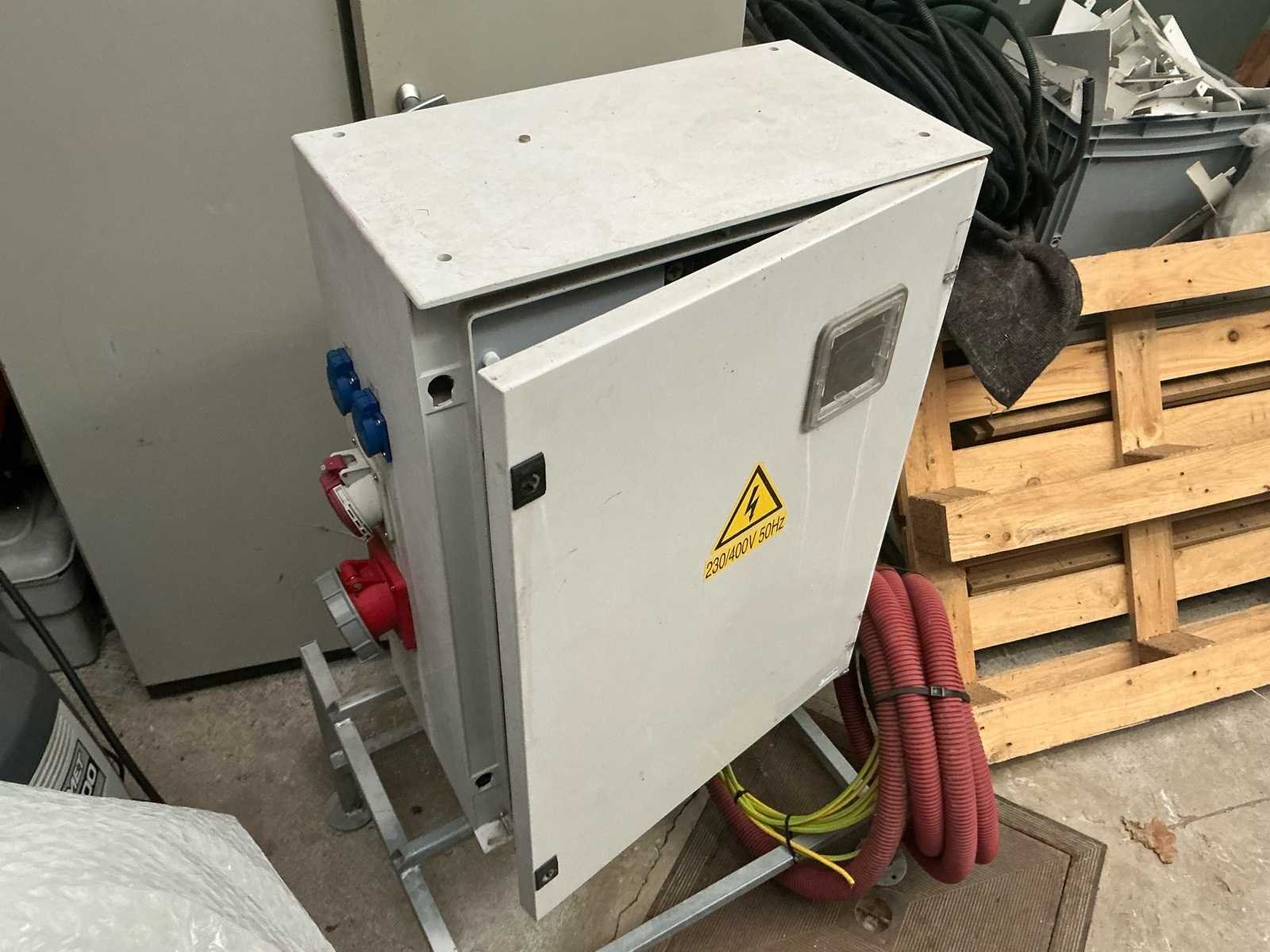 Professionele 400V bouwstroomverdeler / verdeelkast in Tecotex industriële behuizing, gemonteerd op stevig gegalvaniseerd vloerframe. Uitgerust met zowel 32A als 16A CEE-aansluitingen en twee 230V stopcontacten. De kast bevat een interne modulaire zekeringstrip (Q1–Q4, S1) en is geschikt voor distributie van zowel driefasen als éénfase verbruikers. Ideaal voor bouwplaatsen, werkplaatsen, industriële installaties of tijdelijke stroomvoorziening. Merk: Tecotex Type: 0DF76S10/120 – MKL5 Aansluiting: 32A Aantal uitgangen 230v: 2 Aantal uitgangen 380 v / 16 a: 1 Aantal uitgangen 380 v / 32 a: 1