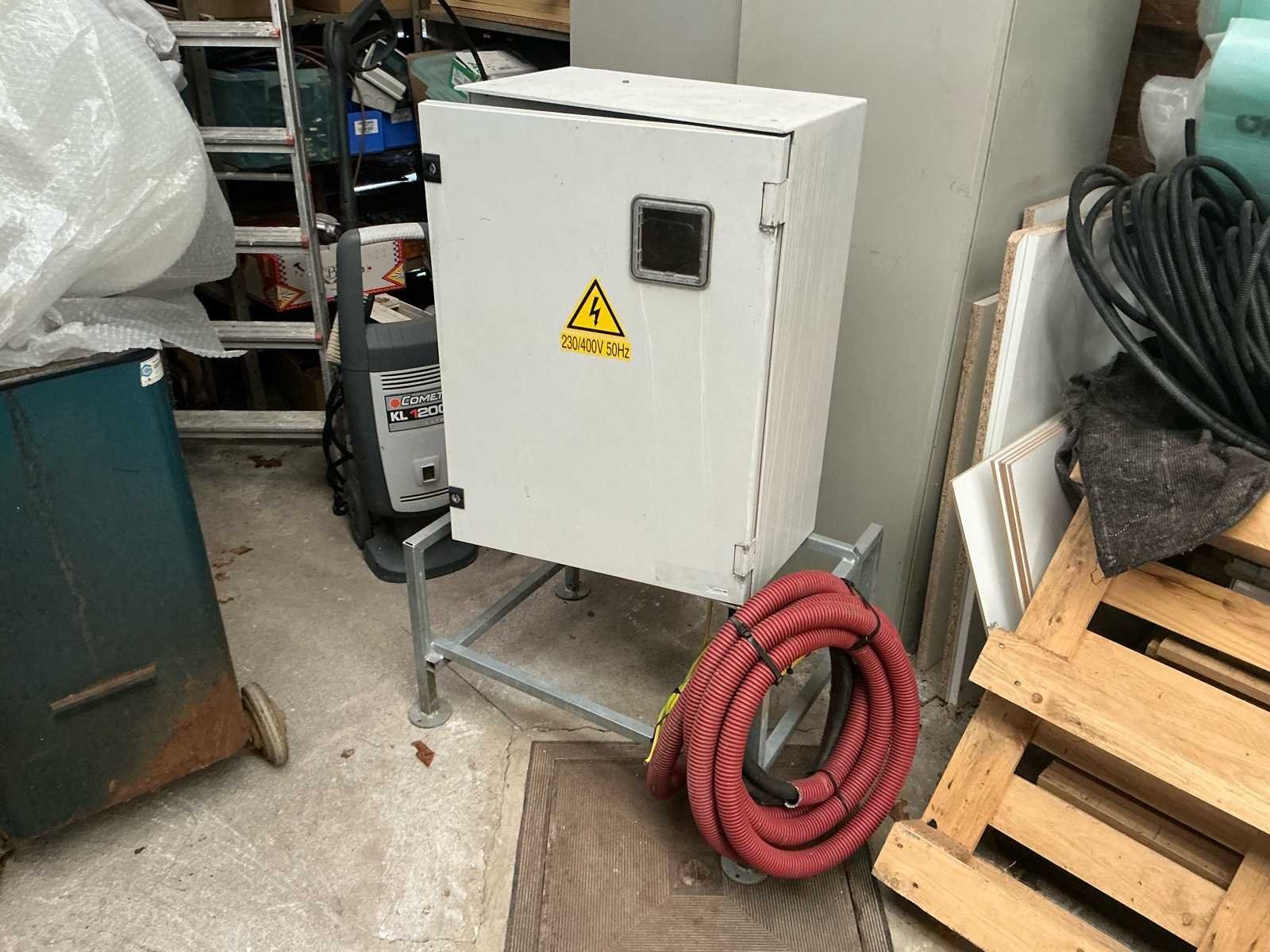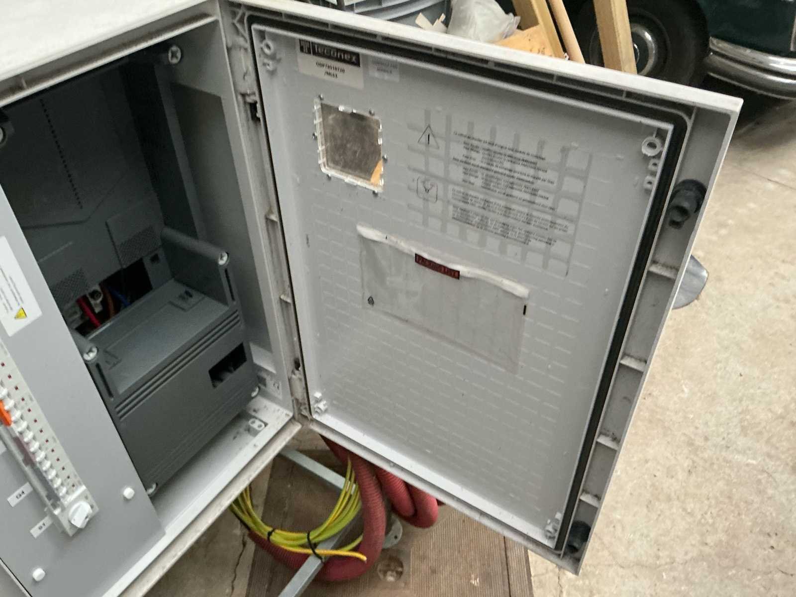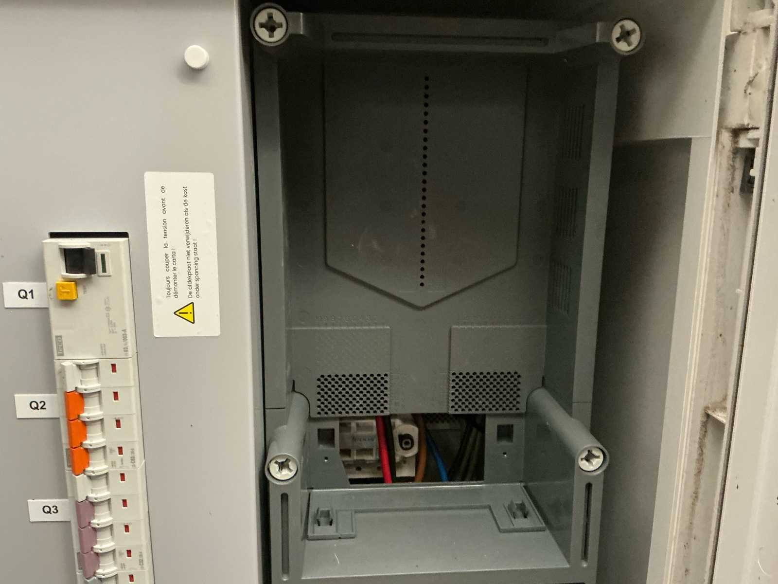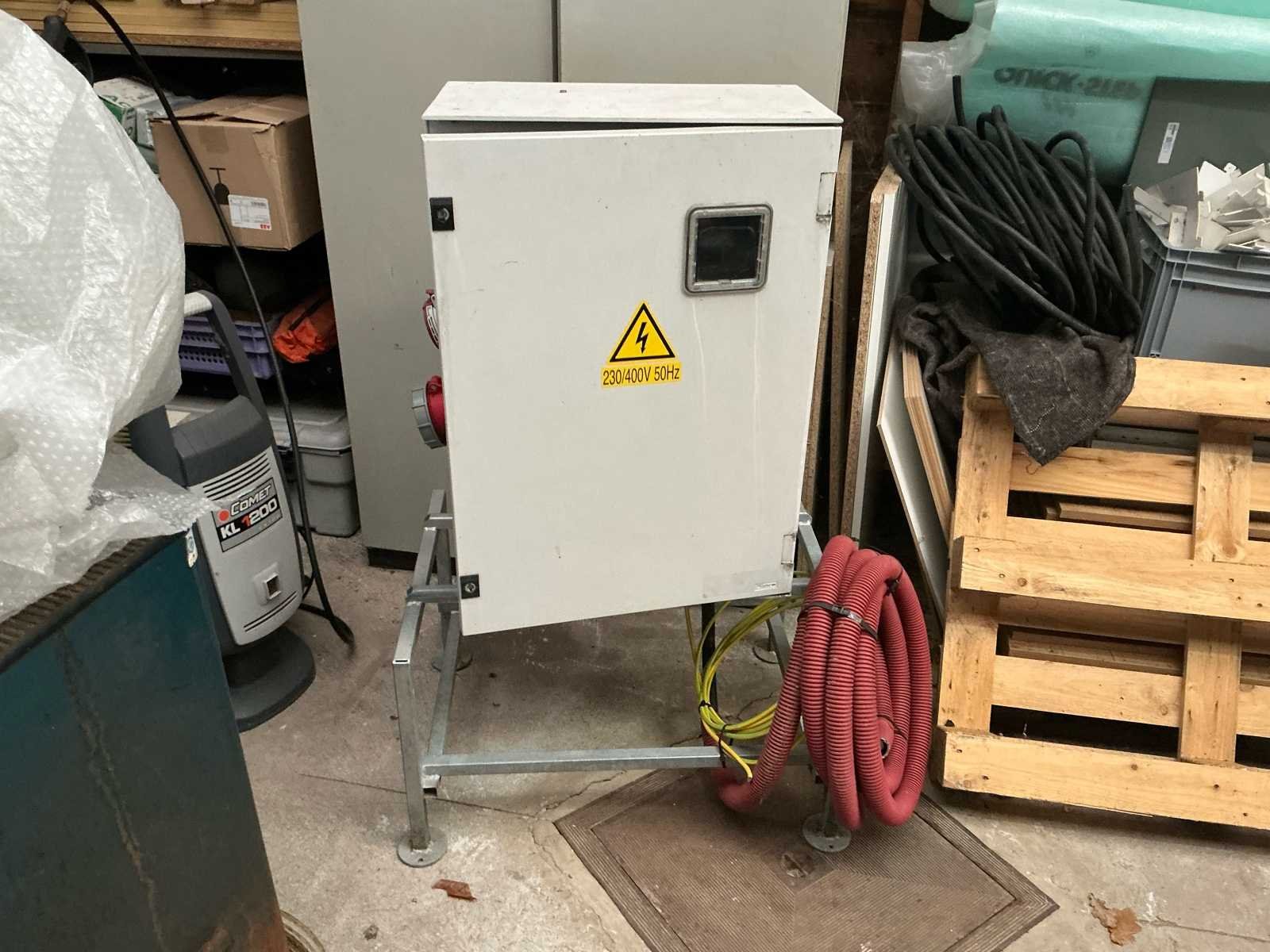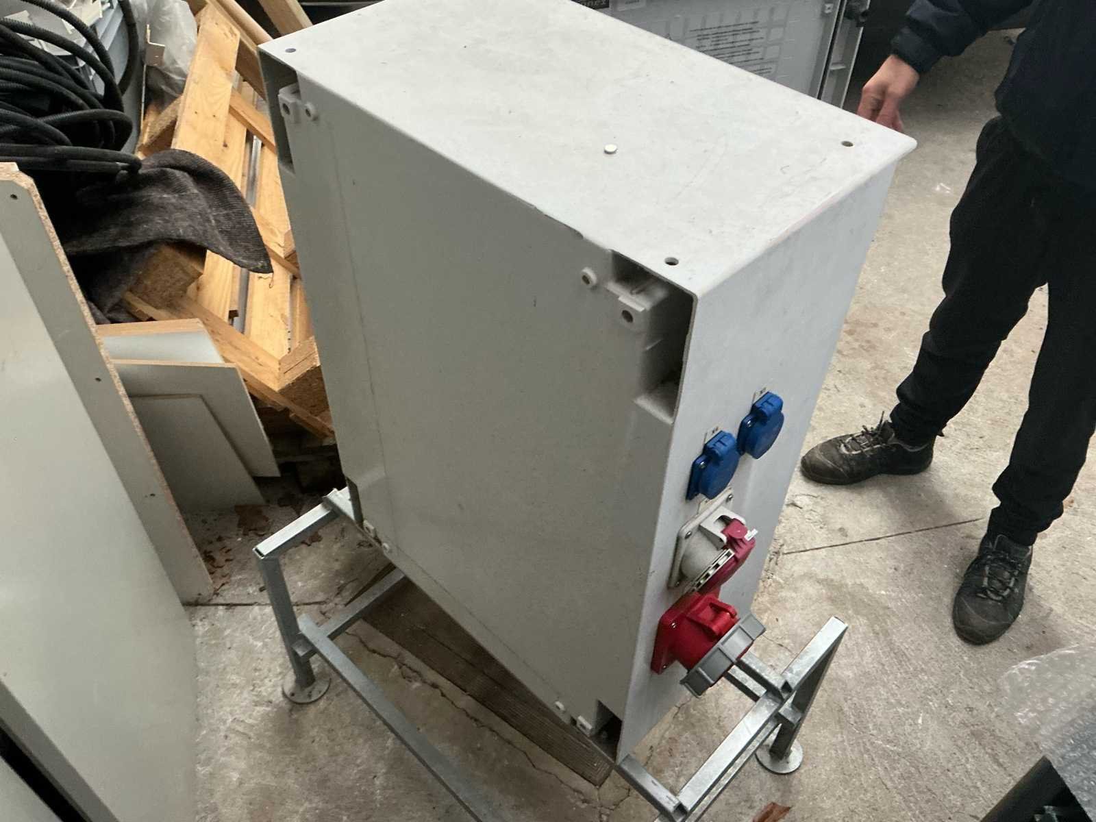 Professionele 400V bouwstroomverdeler / verdeelkast in Tecotex industriële behuizing, gemonteerd op stevig gegalvaniseerd vloerframe. Uitgerust met zowel 32A als 16A CEE-aansluitingen en twee 230V stopcontacten. De kast bevat een interne modulaire zekeringstrip (Q1–Q4, S1) en is geschikt voor distributie van zowel driefasen als éénfase verbruikers. Ideaal voor bouwplaatsen, werkplaatsen, industriële installaties of tijdelijke stroomvoorziening. Merk: Tecotex Type: 0DF76S10/120 – MKL5 Aansluiting: 32A Aantal uitgangen 230v: 2 Aantal uitgangen 380 v / 16 a: 1 Aantal uitgangen 380 v / 32 a: 1