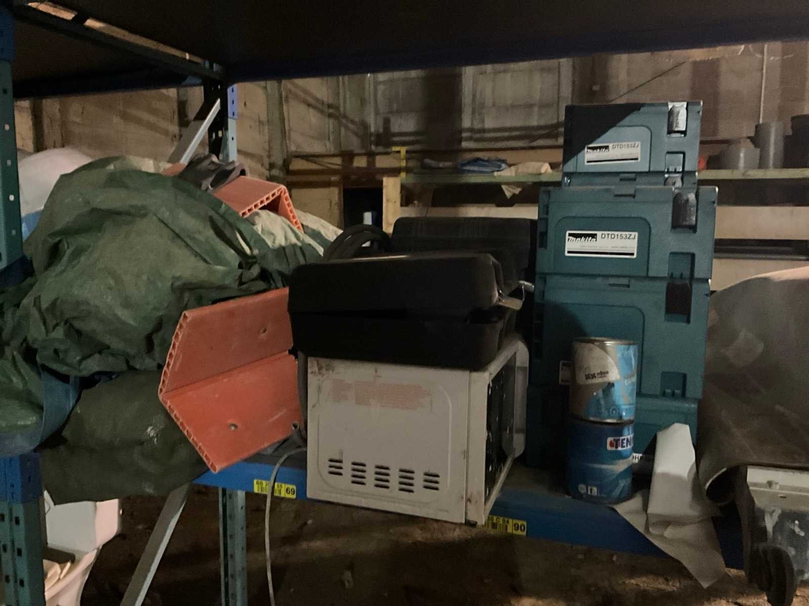 Inhoud bestaande uit circa 15 lege machine opbergboxen, afdekzeilen, garagekrik, 2x toilet, enz.. Sectie afm. b: 2700mm Sectie diepte: 900mm Aantal staanders: 3 Aantal liggers: 16 Aantal legborden: 4 Demontabel: true Totale afmeting Hoogte: 3500cm