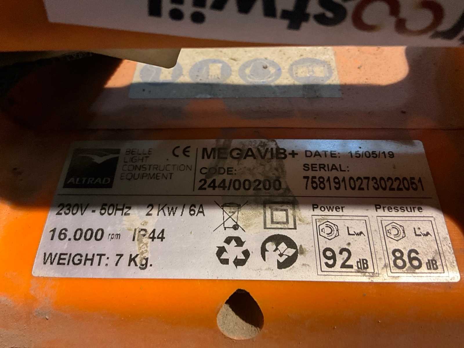 Voorzien van trilnaald diameter 35 mm met aandrijving lengte circa 3 meter Merk: Altrad Model: Megavib+ Spanning: 220V Vermogen (kW): 2kW Gewicht: 7kg