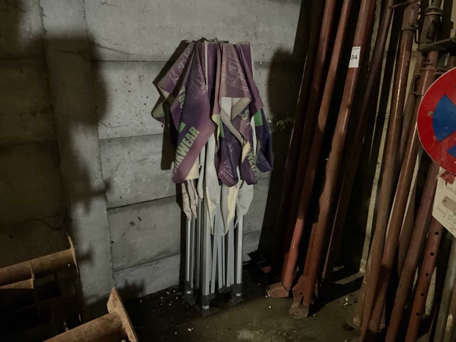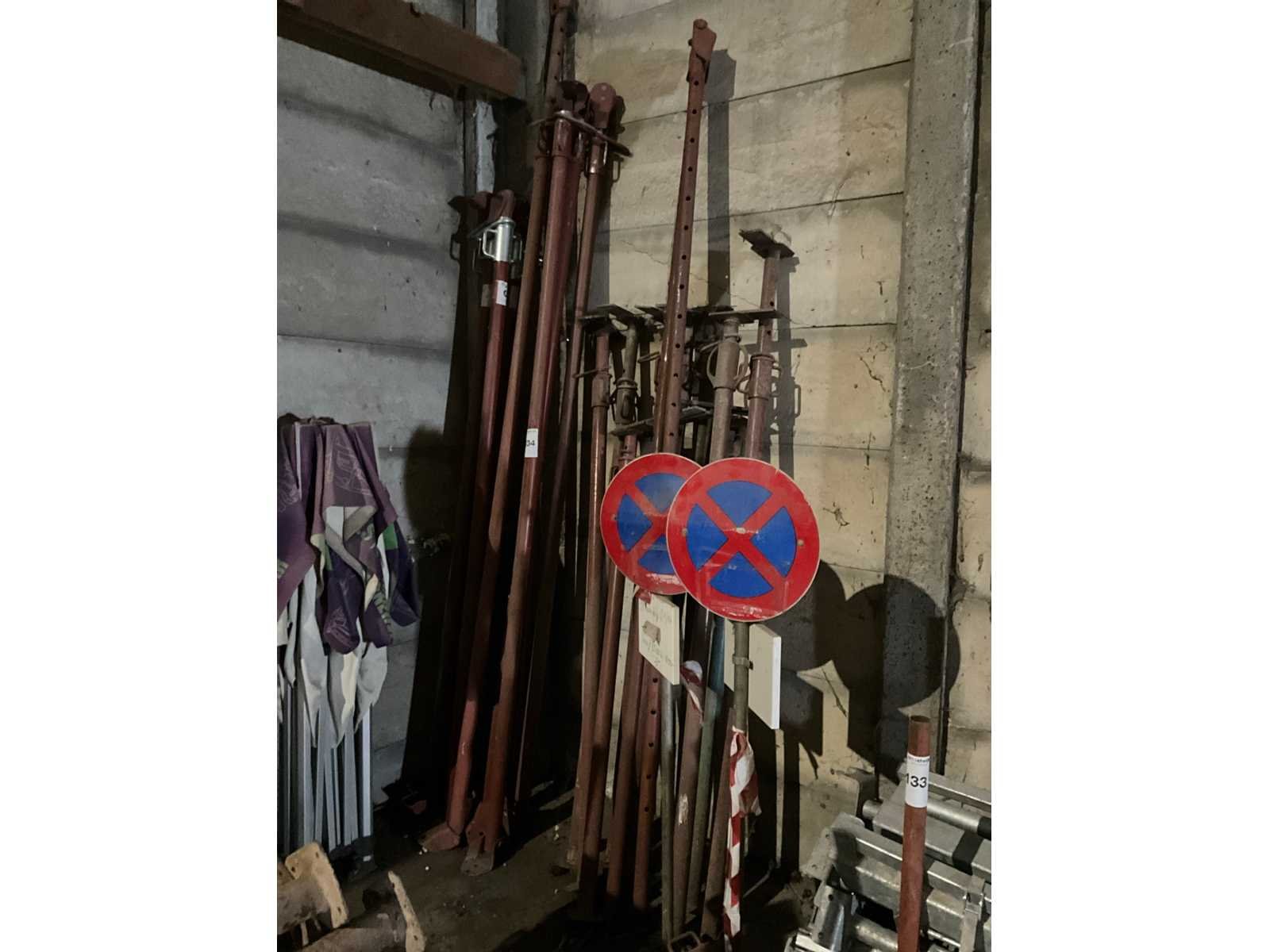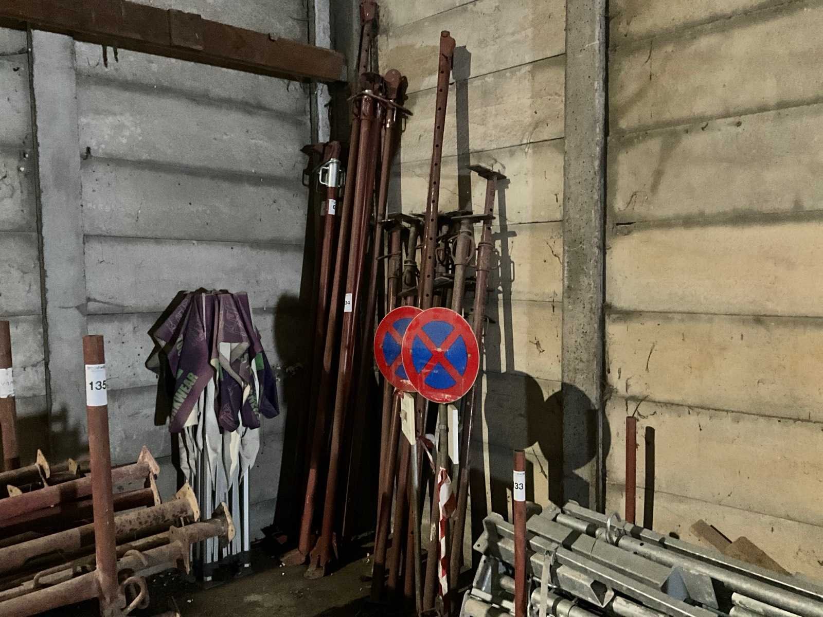 Bestaande uit circa 17 stuks galva met lengte in rust tss 160-280 cm waaronder de helft zijschoren zijn, + 2x verkeersbord op voet, +1x party tent