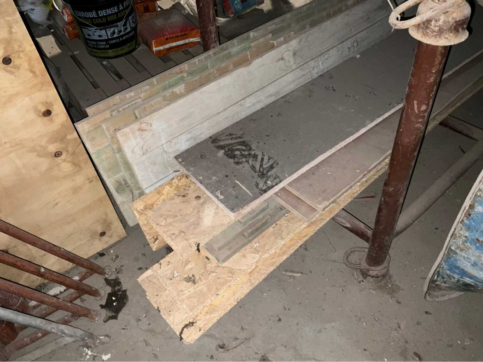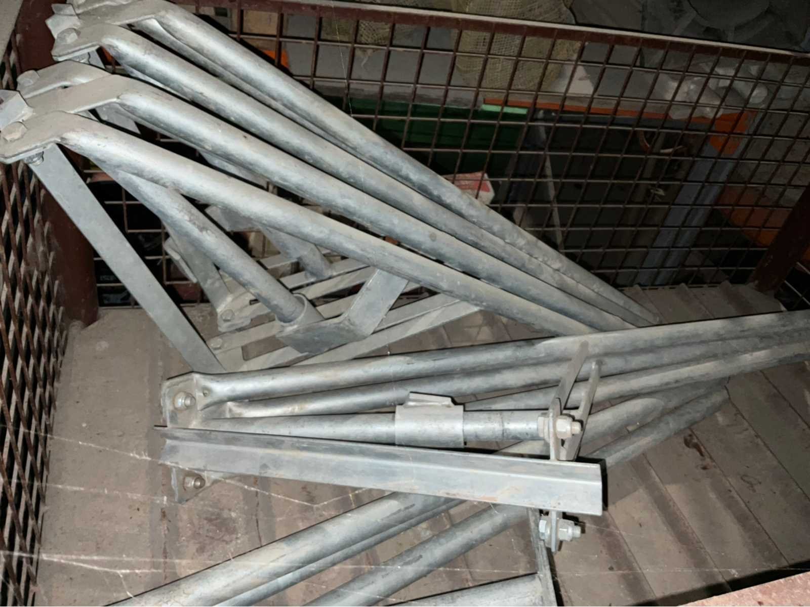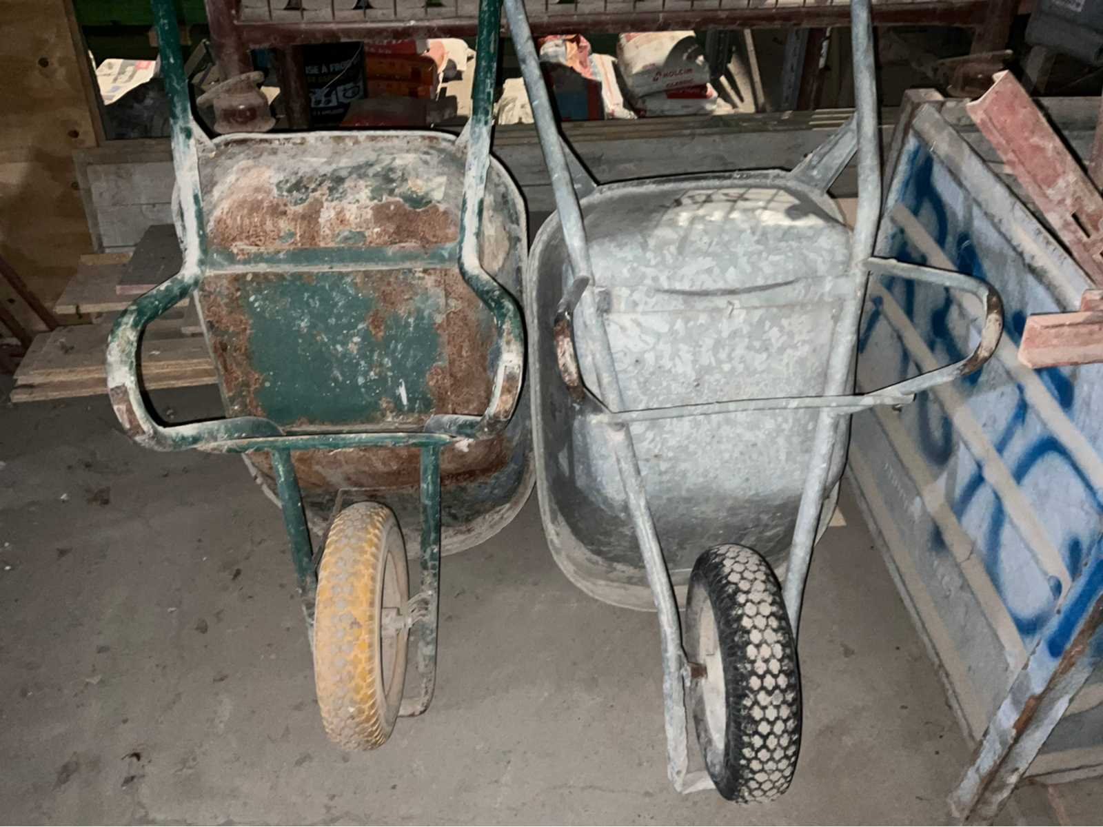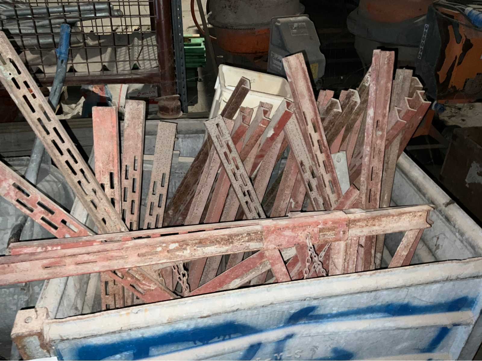 Bestaand uit 1x palletbox met circa 30 bekistingsklemmen lengte 100 cm, +2x kruiwagen, + 2x stapelkooi met inhoud circa 6x 3-pikkel steunen + constructie hout