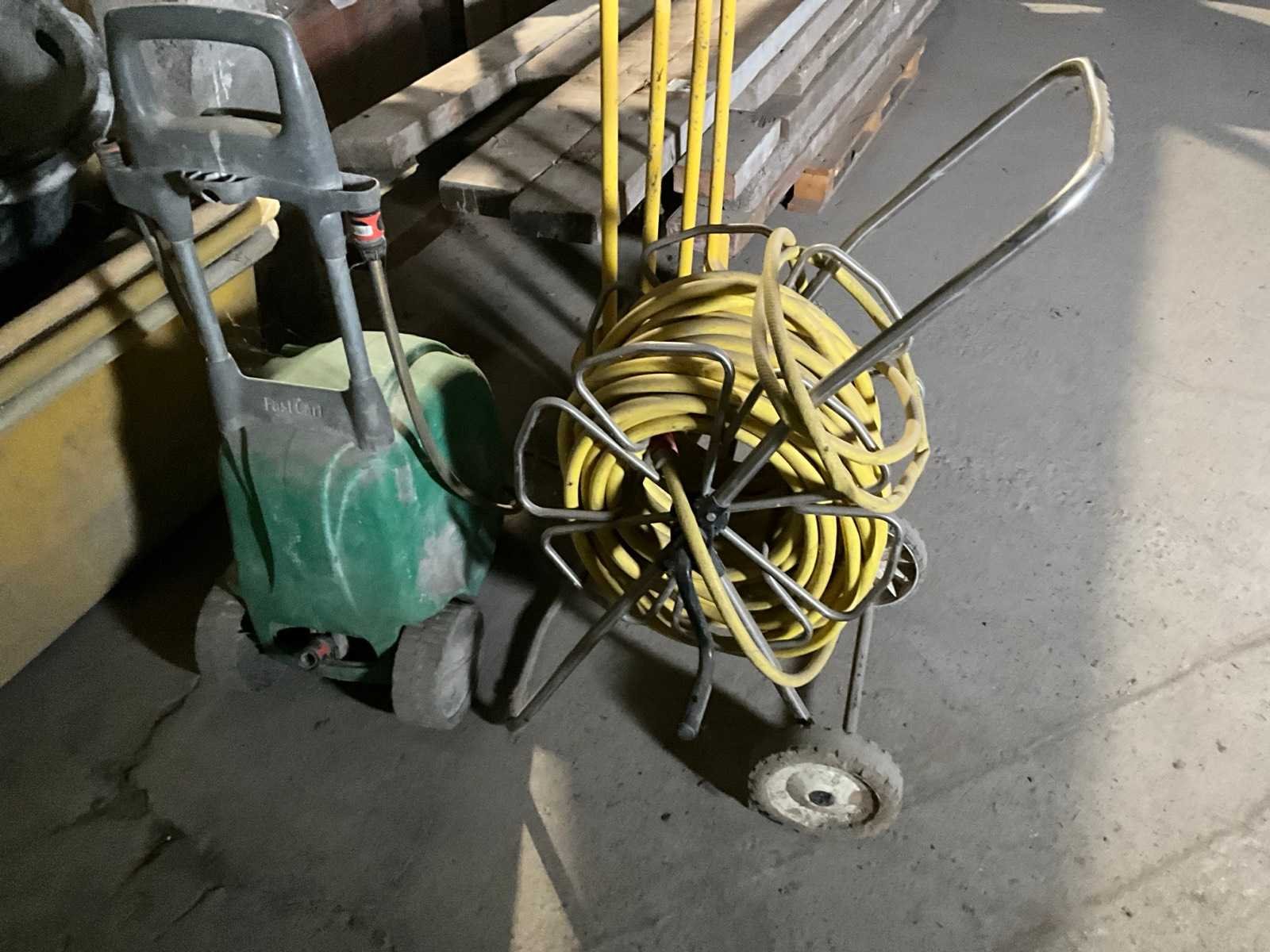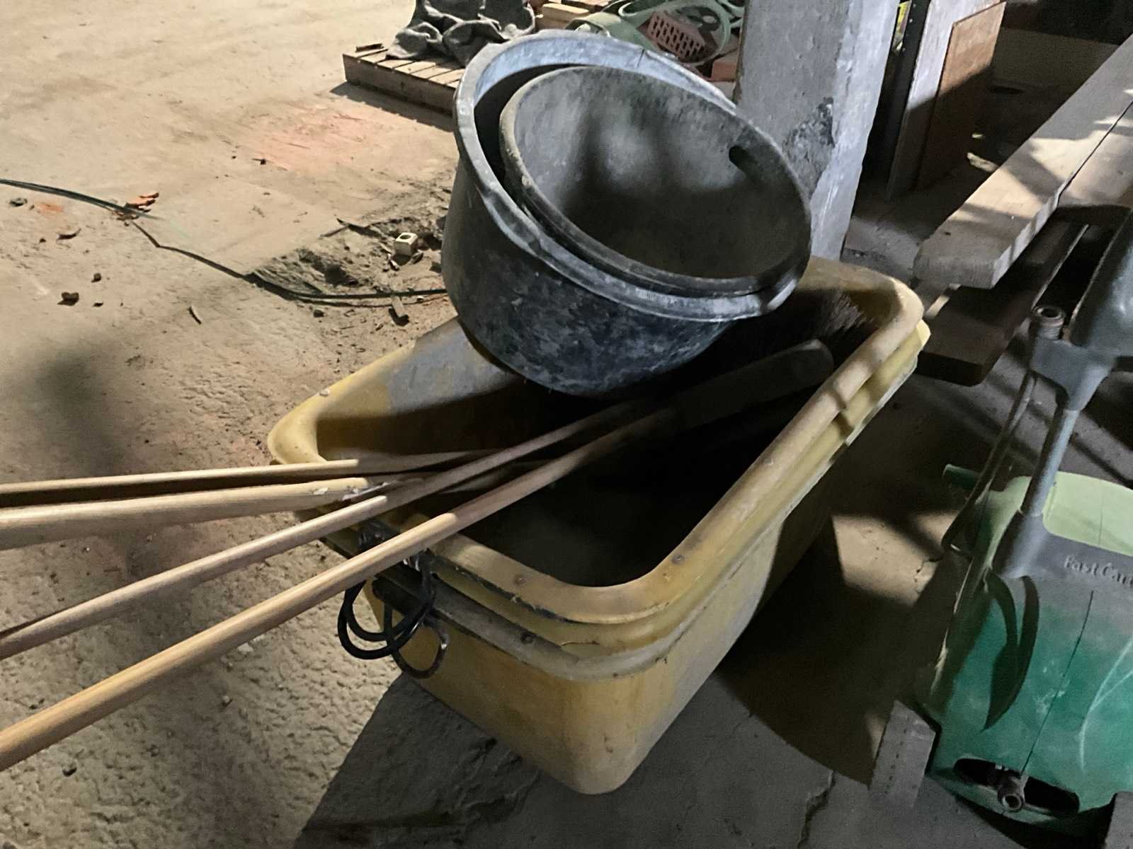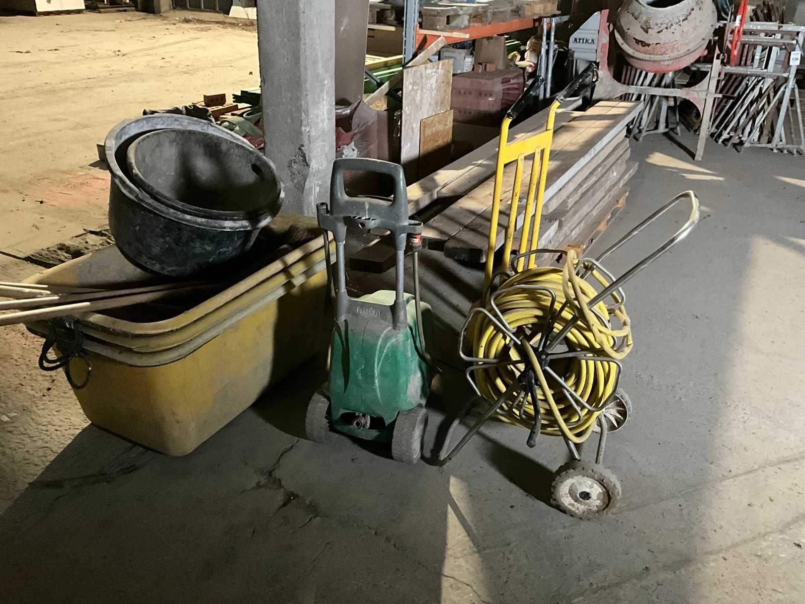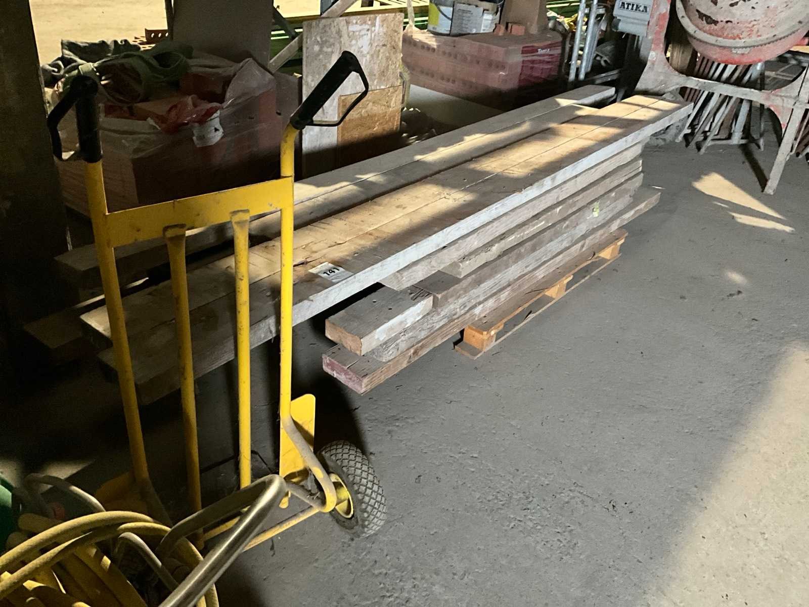 Bestaand uit pallet met circa 24 houten balken met lengtes tss 2-4 meter, +2x oproller met tuinslang, + transportwagen, + 4x metserskuip, + circa 4 x borstels en schoppen