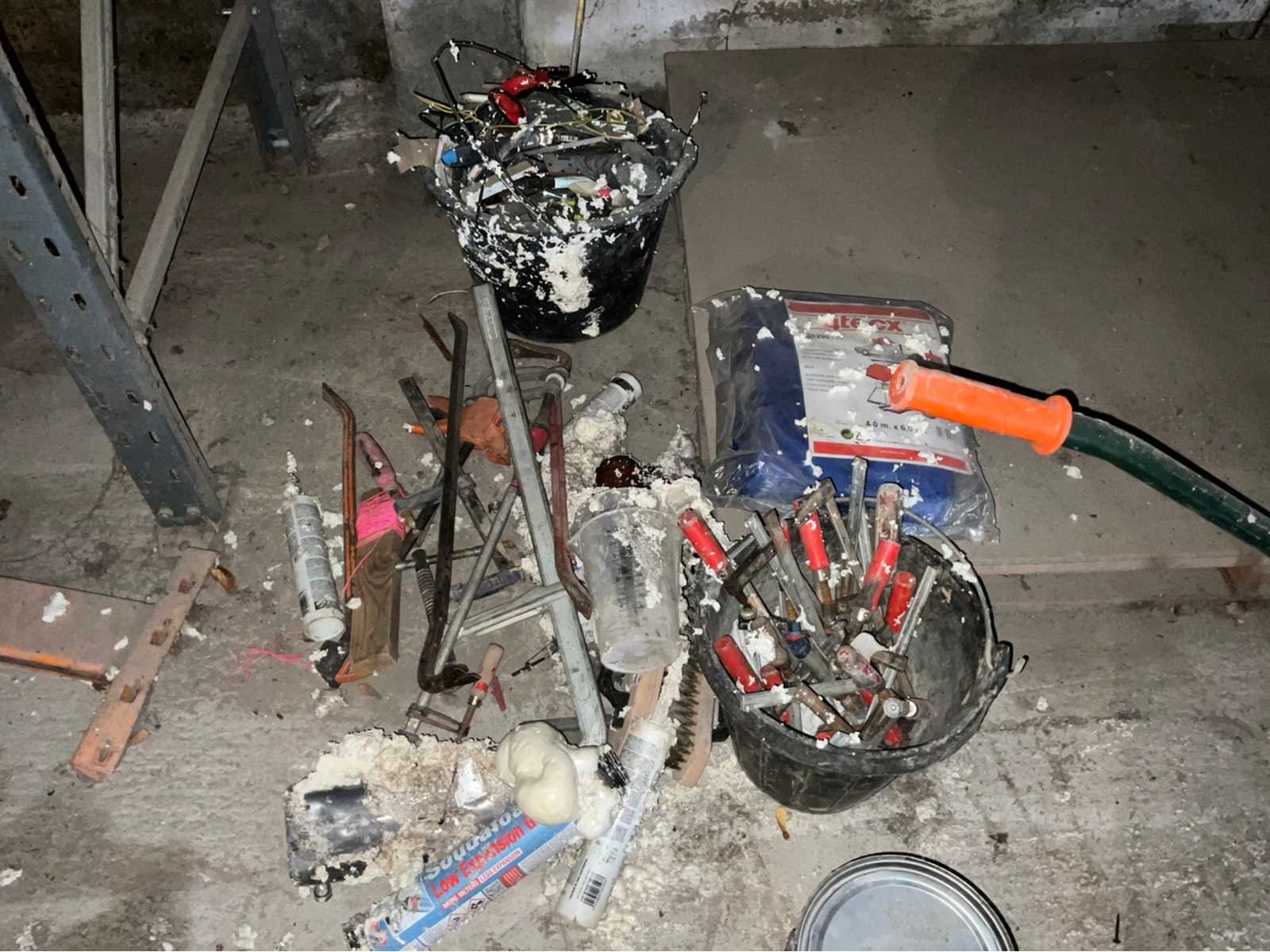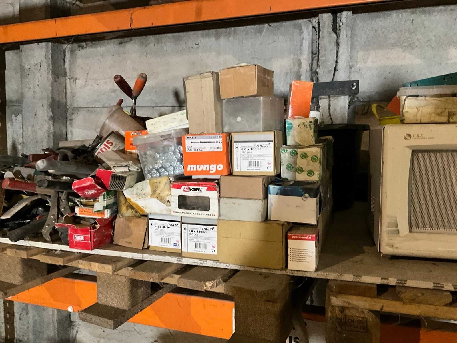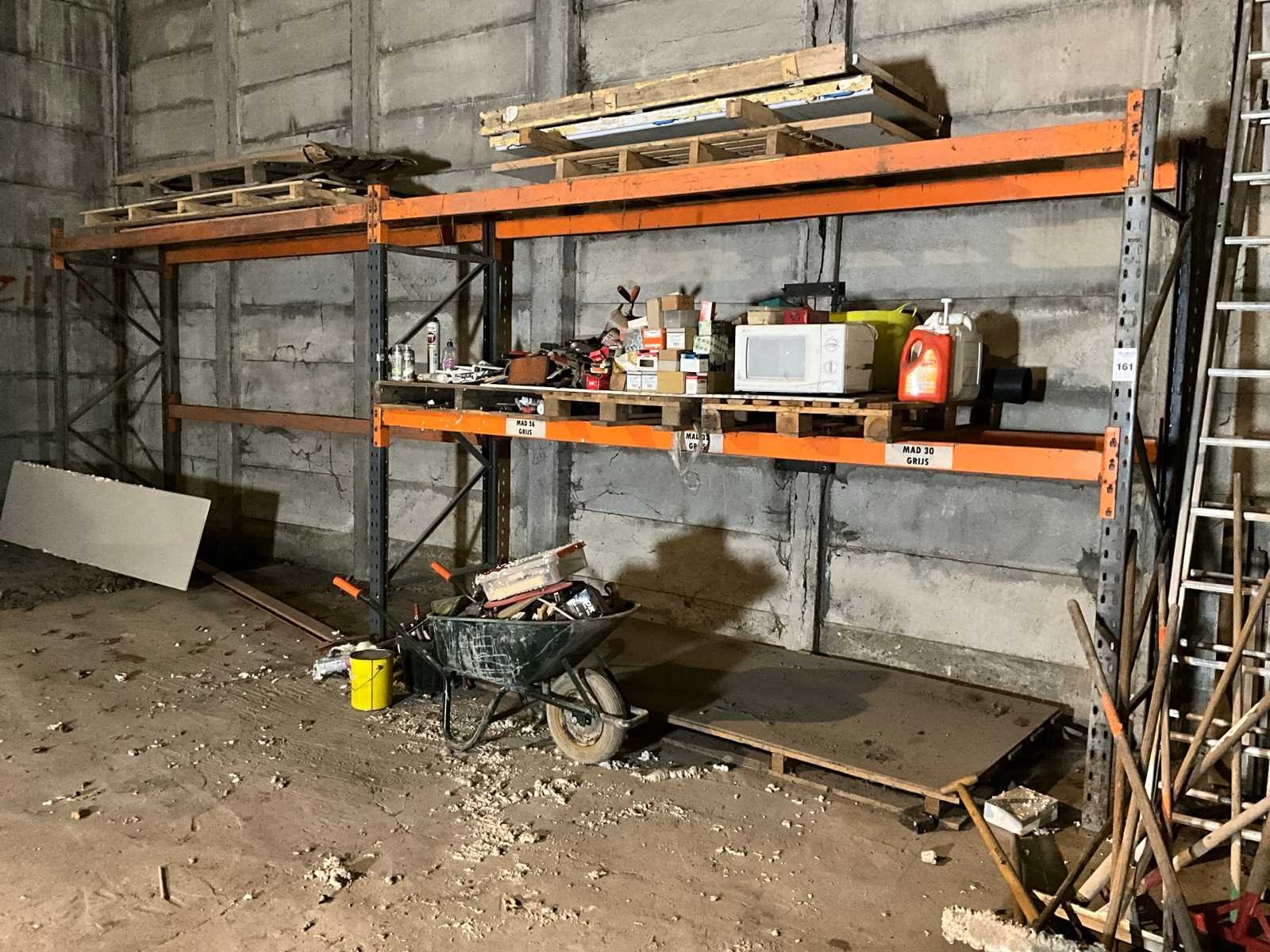 Inhoud bestaande uit grote partij bevestigingsmaterialen , selicone, 3x binnendeur, kruiwagen met klein handgereedschap enz.. Sectie afm. b: 3600mm Sectie diepte: 1000mm Aantal staanders: 3 Aantal liggers: 8 Demontabel: true Totale afmeting L: 100cm Hoogte: 220cm