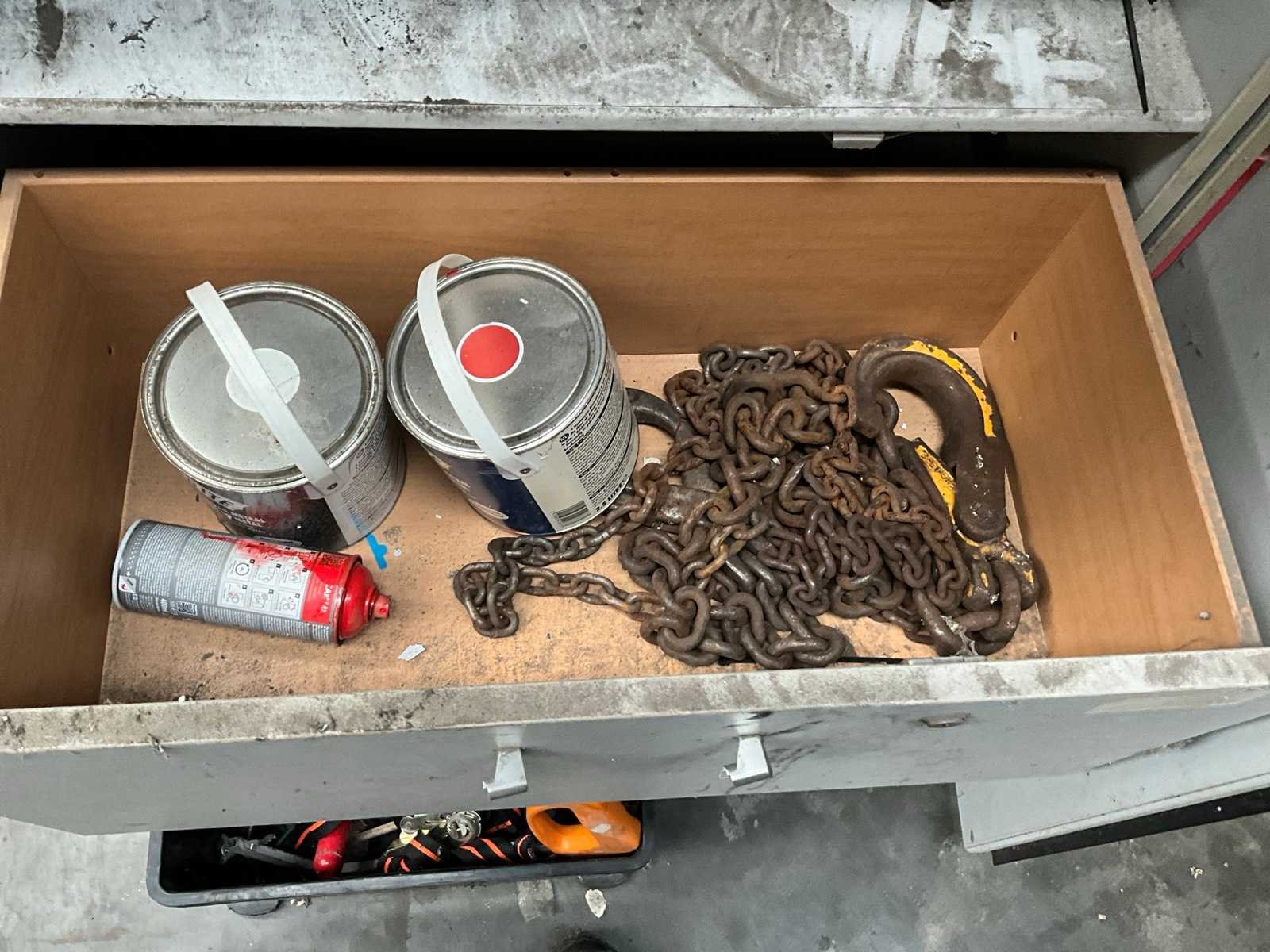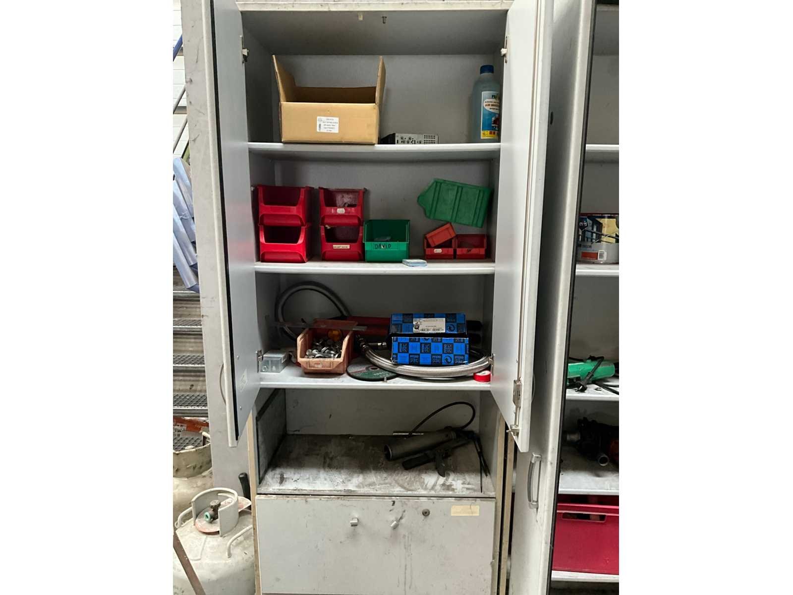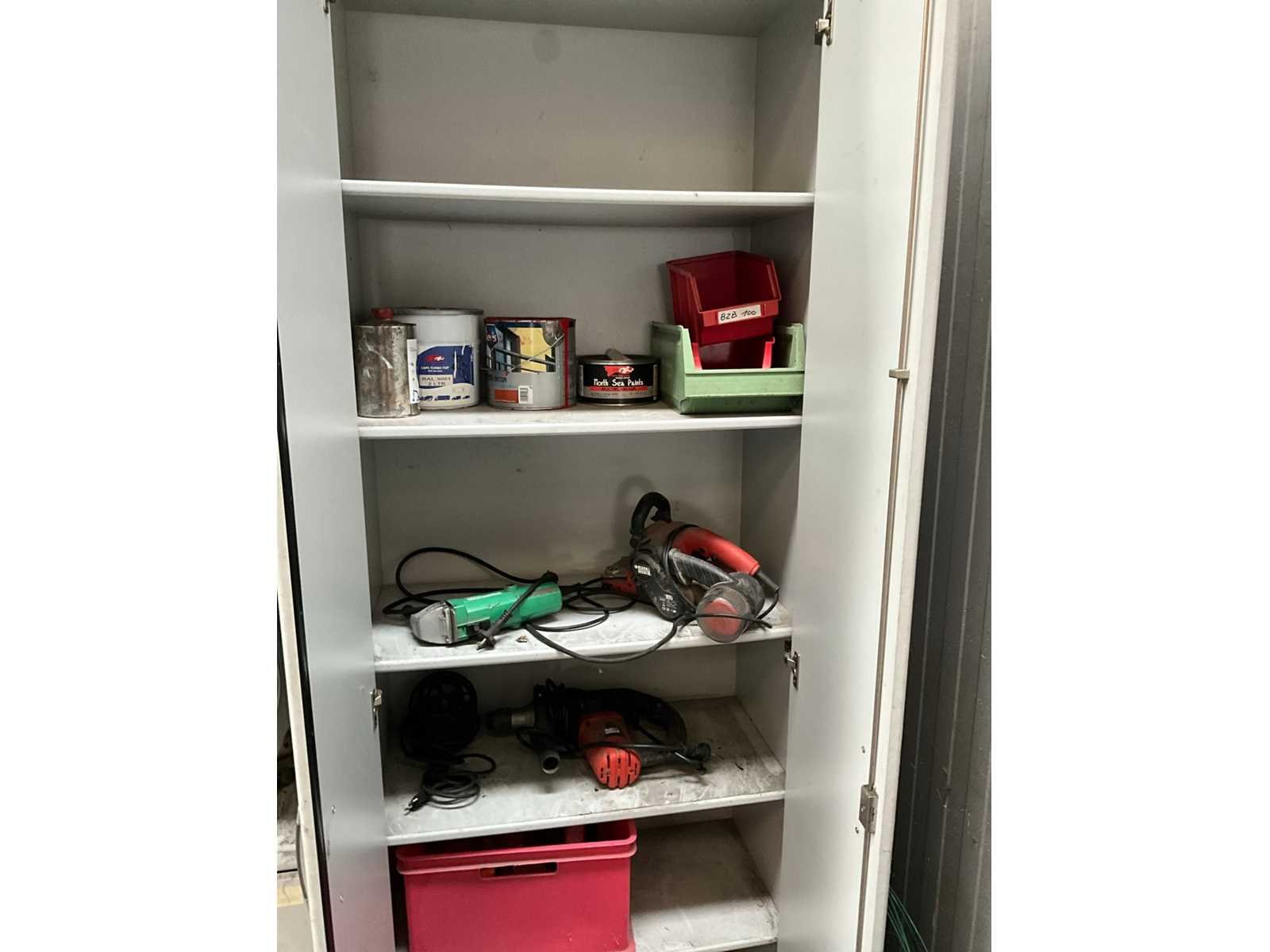 Bestaand uit 2x magazijnkast met inhoud snijschijven, bevestigingsmaterialen, verf, boor breekhamer + bandschuurmachine Black & Decker op 220 volt, knabbelschaar Hitachi CN16, materiaalkast met diverse steek ringsleutels en doppen enz..
