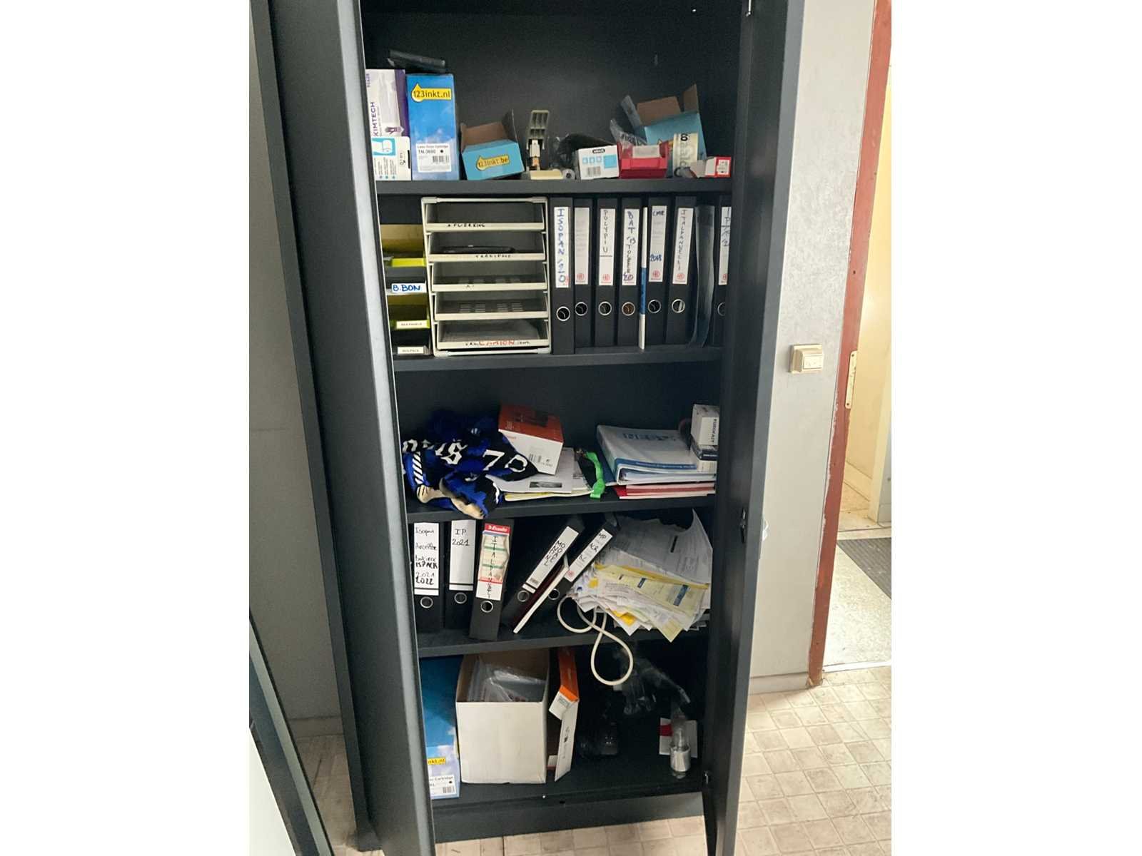 Bestaand uit tweedelig bureautafel 230x165 cm, pc scherm + klavier, printer kopieerapparaat Brother MFX, 1x bureaustoel, 1x electrische heater, 1x plaatstalen dossierkast met inhoud, BOEKHOUDING BLIJFT TER PLAATSE!!