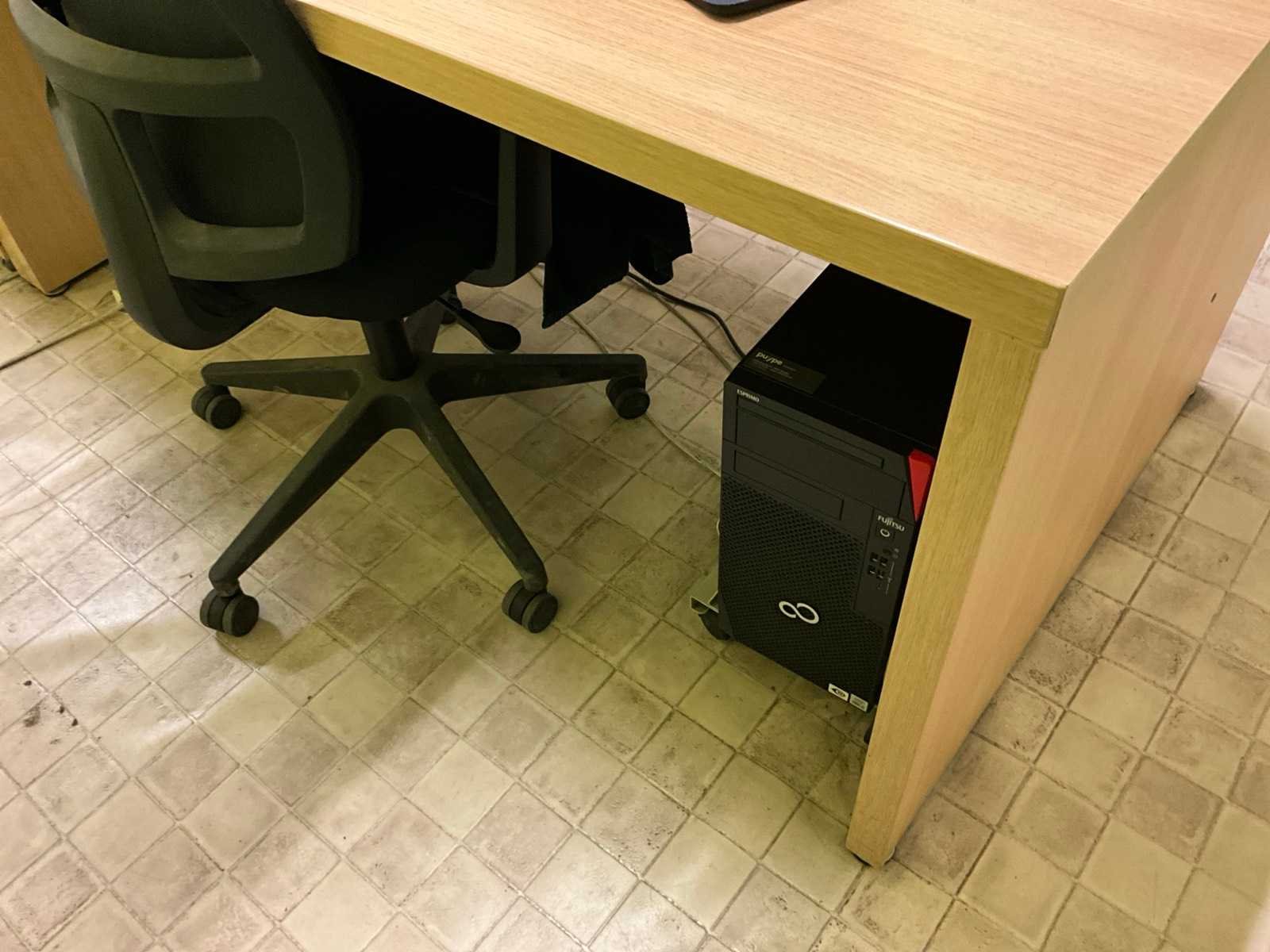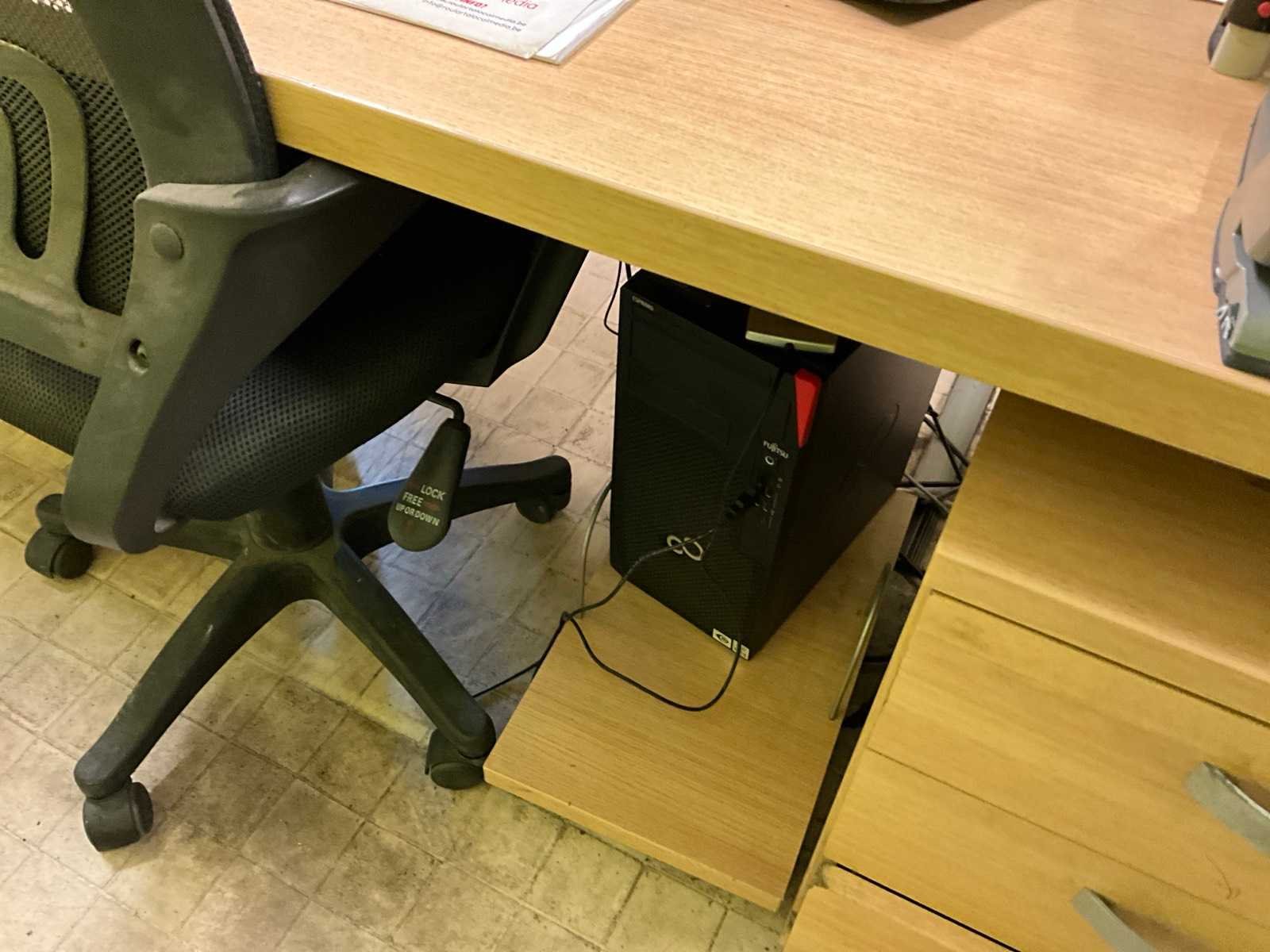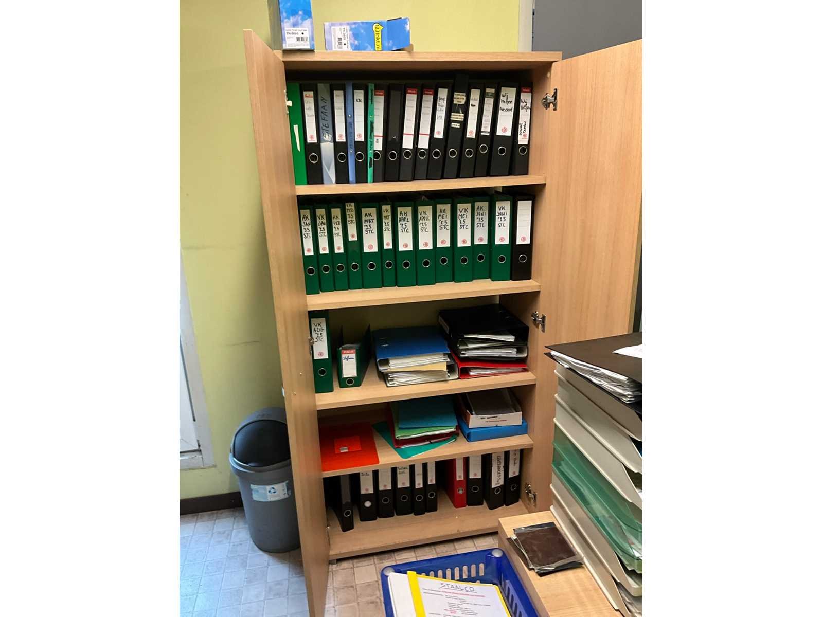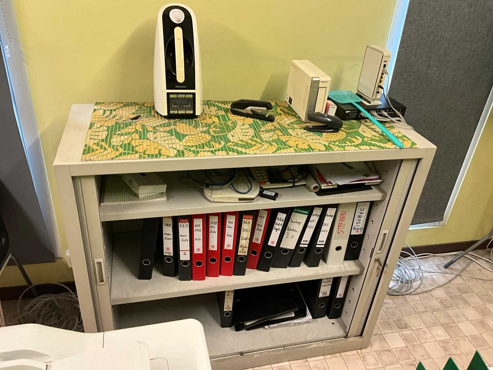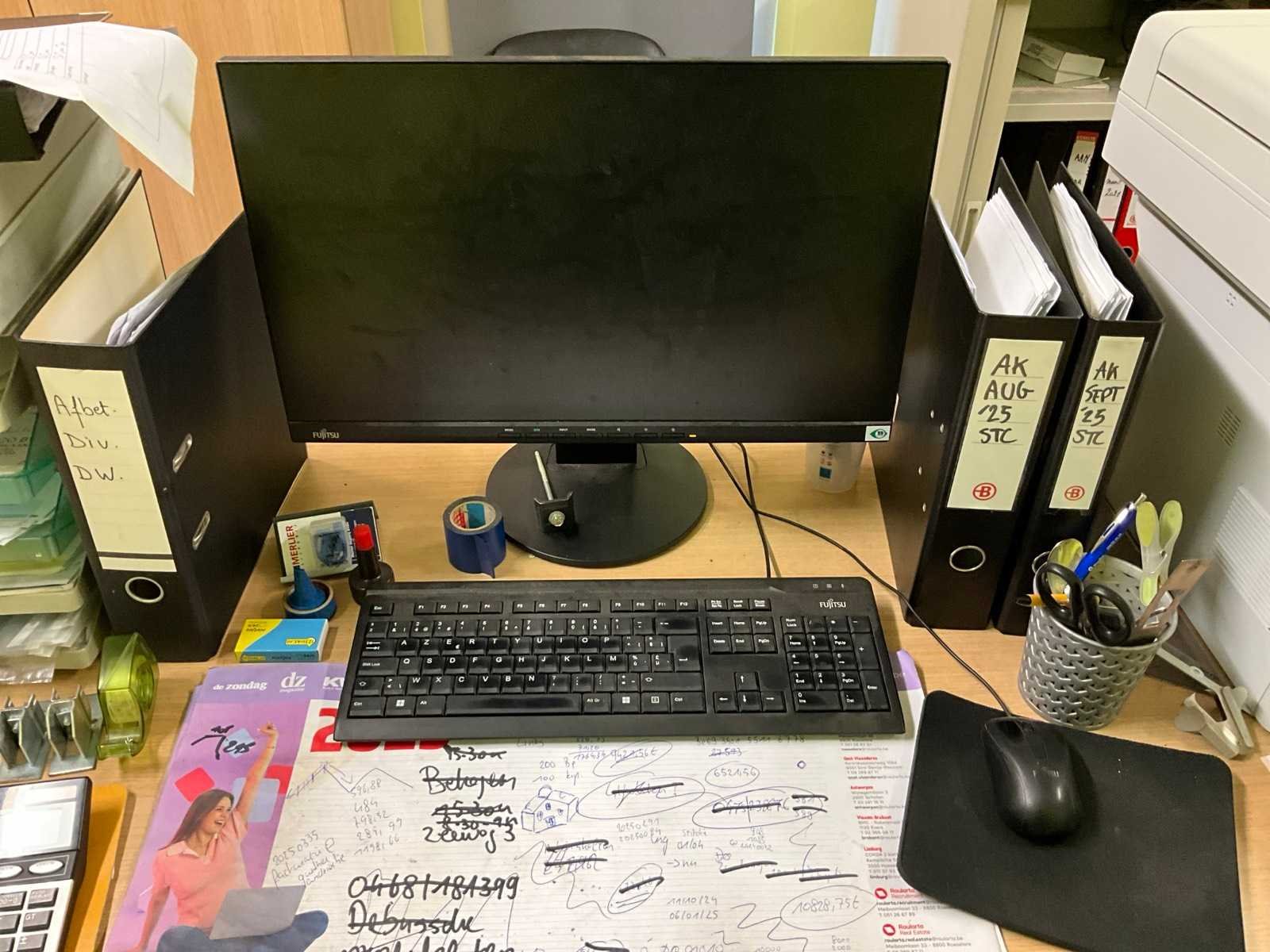Bestaand uit 2x bureautafel 180x85 cm, 2x pc + 2x scherm + klavier, printer kopieerapparaat Brother DCP, 2x bureaustoel, 1x plaatstalen dossierkast met inhoud, +2x houten 2-deurs dossierkast met inhoud, mini airco Rowenta, ladekast, BOEKHOUDING BLIJFT TER PLAATSE!!