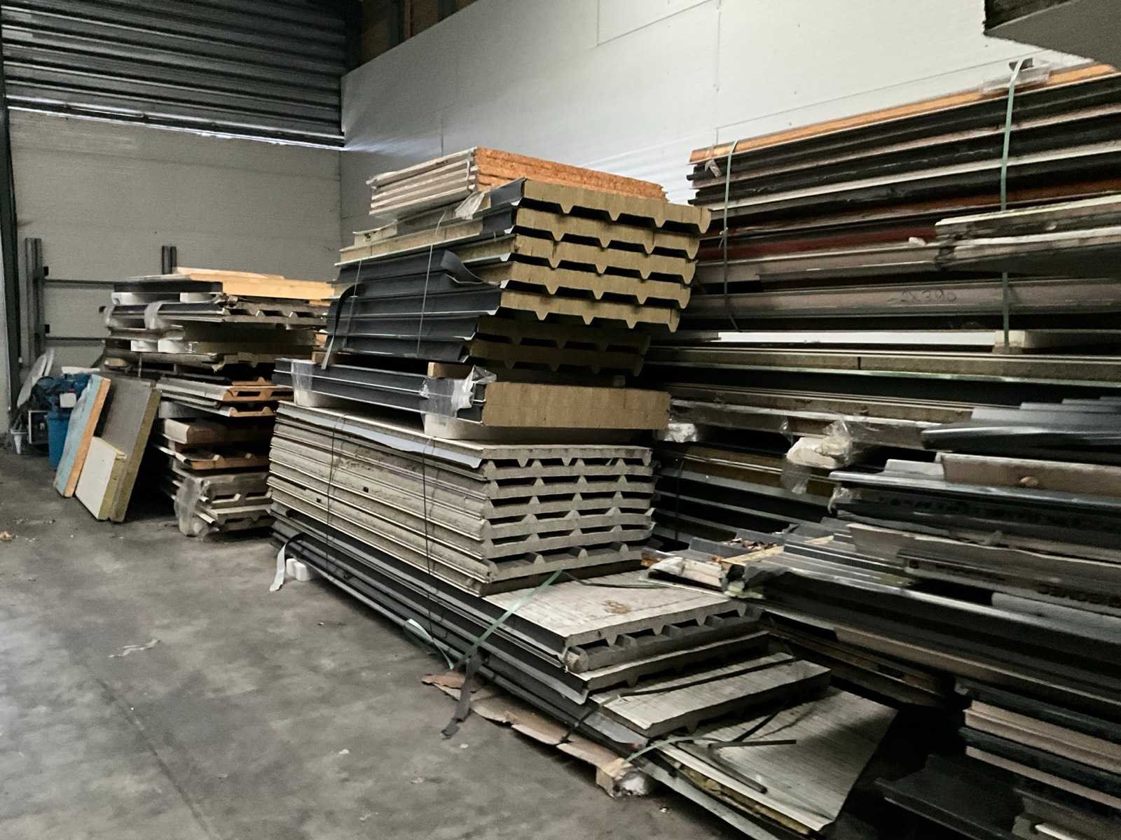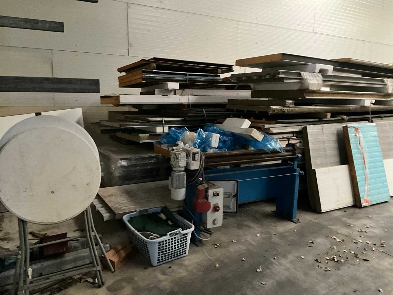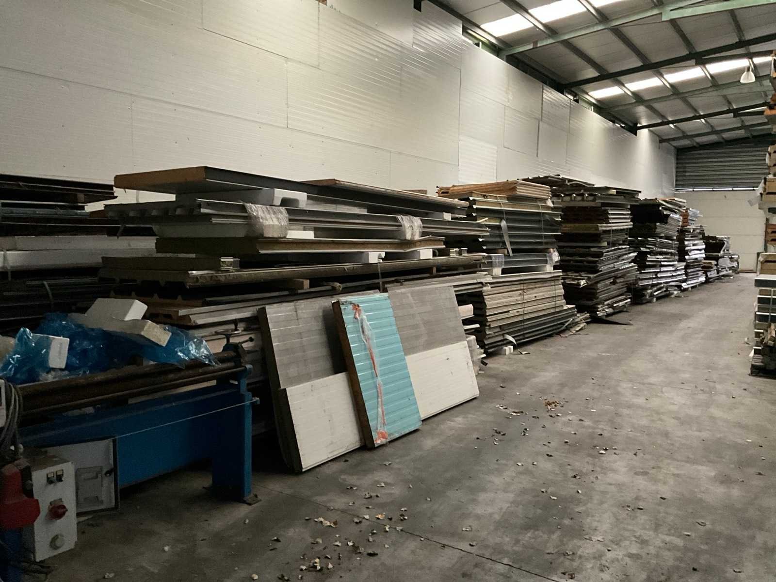 Bestaand uit grote partij diverse geïsoleerde en niet geïsoleerde dakpanelen, geïsoleerde wanden, mobiele werkbank, electrische platronde Prinzing Type RME527128, draagarmstelling met 2 staanders hoogte 3 meter en 6 liggers (demonteerbaar), 2x receptietafel enz…, alles gesitueerd op de grond, gesitueerd in gebouw achteraan nr 4 rechterkant