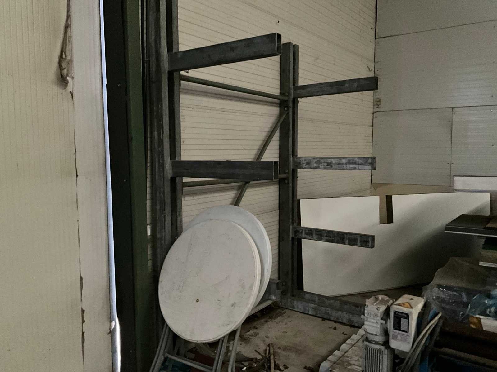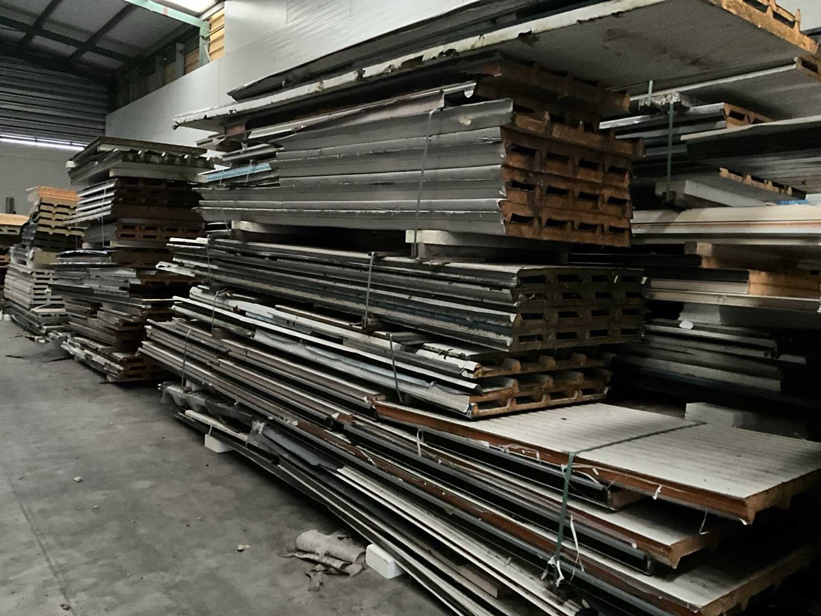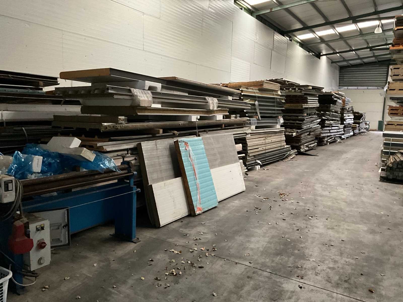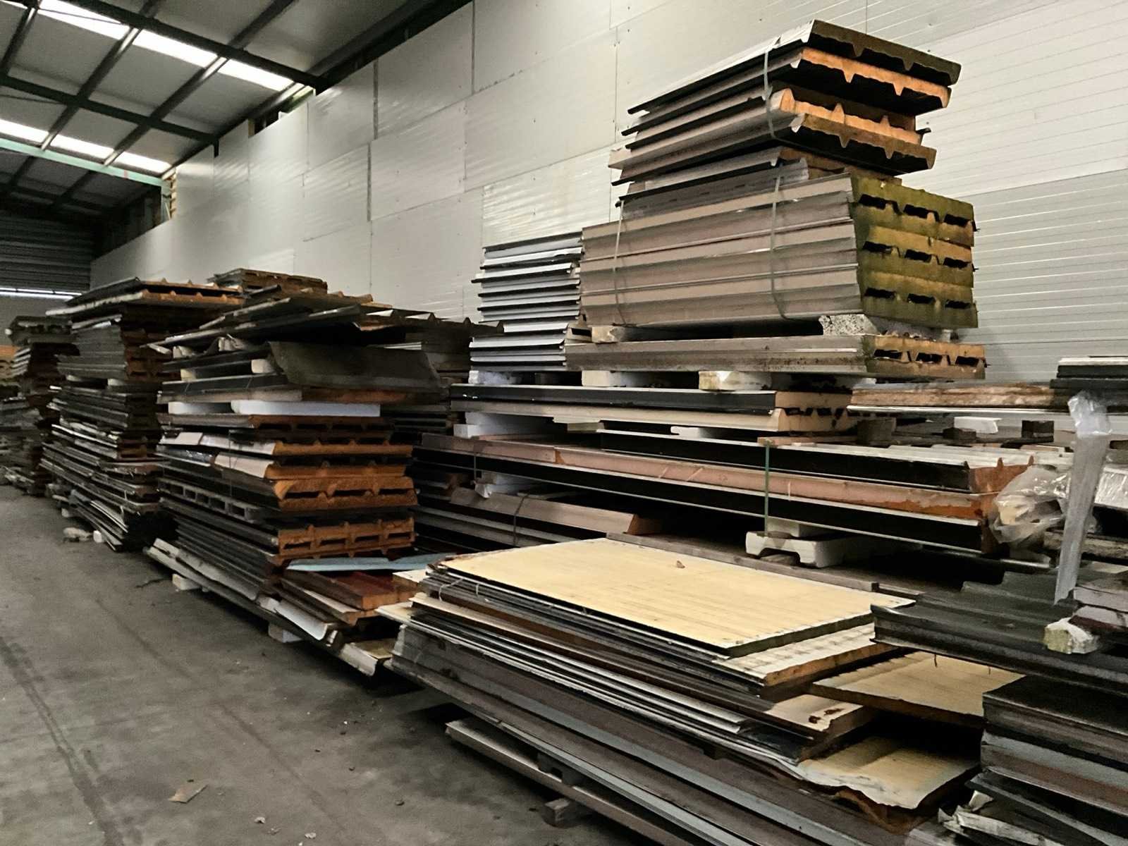 Bestaand uit grote partij diverse geïsoleerde en niet geïsoleerde dakpanelen, geïsoleerde wanden, mobiele werkbank, electrische platronde Prinzing Type RME527128, draagarmstelling met 2 staanders hoogte 3 meter en 6 liggers (demonteerbaar), 2x receptietafel enz…, alles gesitueerd op de grond, gesitueerd in gebouw achteraan nr 4 rechterkant