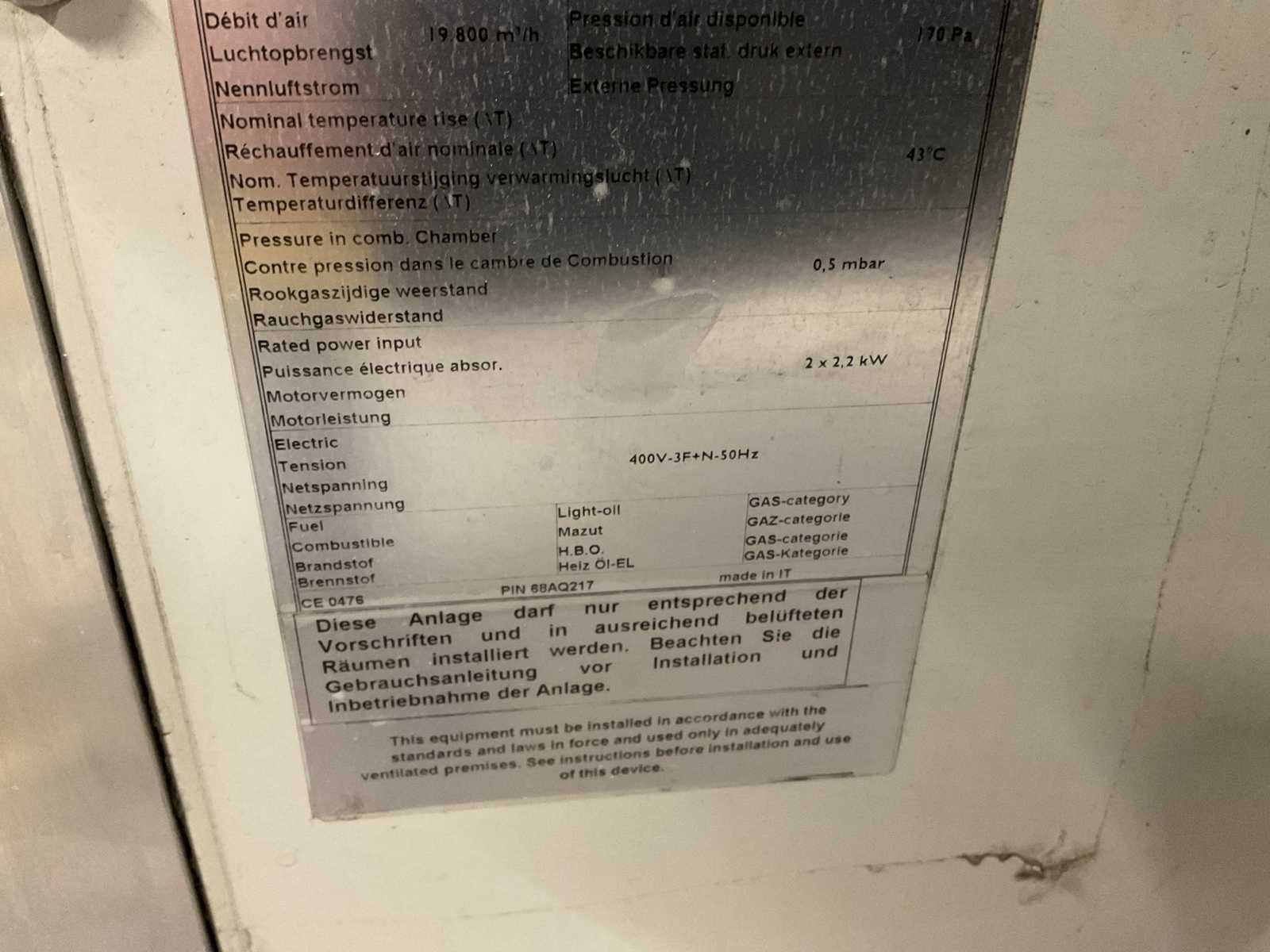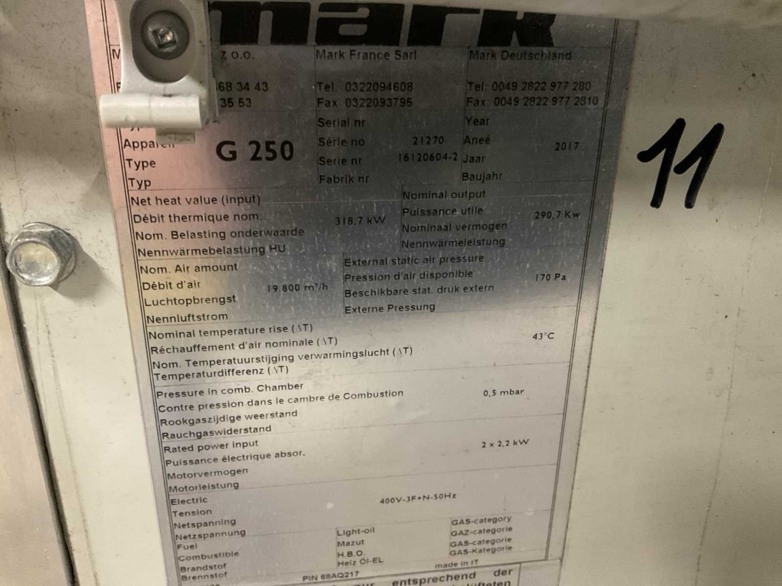 19800m3/h, met Weishaupt WG30N brander Merk: MARK Type: G250 Bouwjaar: 2017 Verwarmingscapaciteit: 290.7kW Gasgestookt: true Totale afmeting L: 2800mm Totale afmeting Breedte: 1300mm Totale afmeting Hoogte: 2750mm