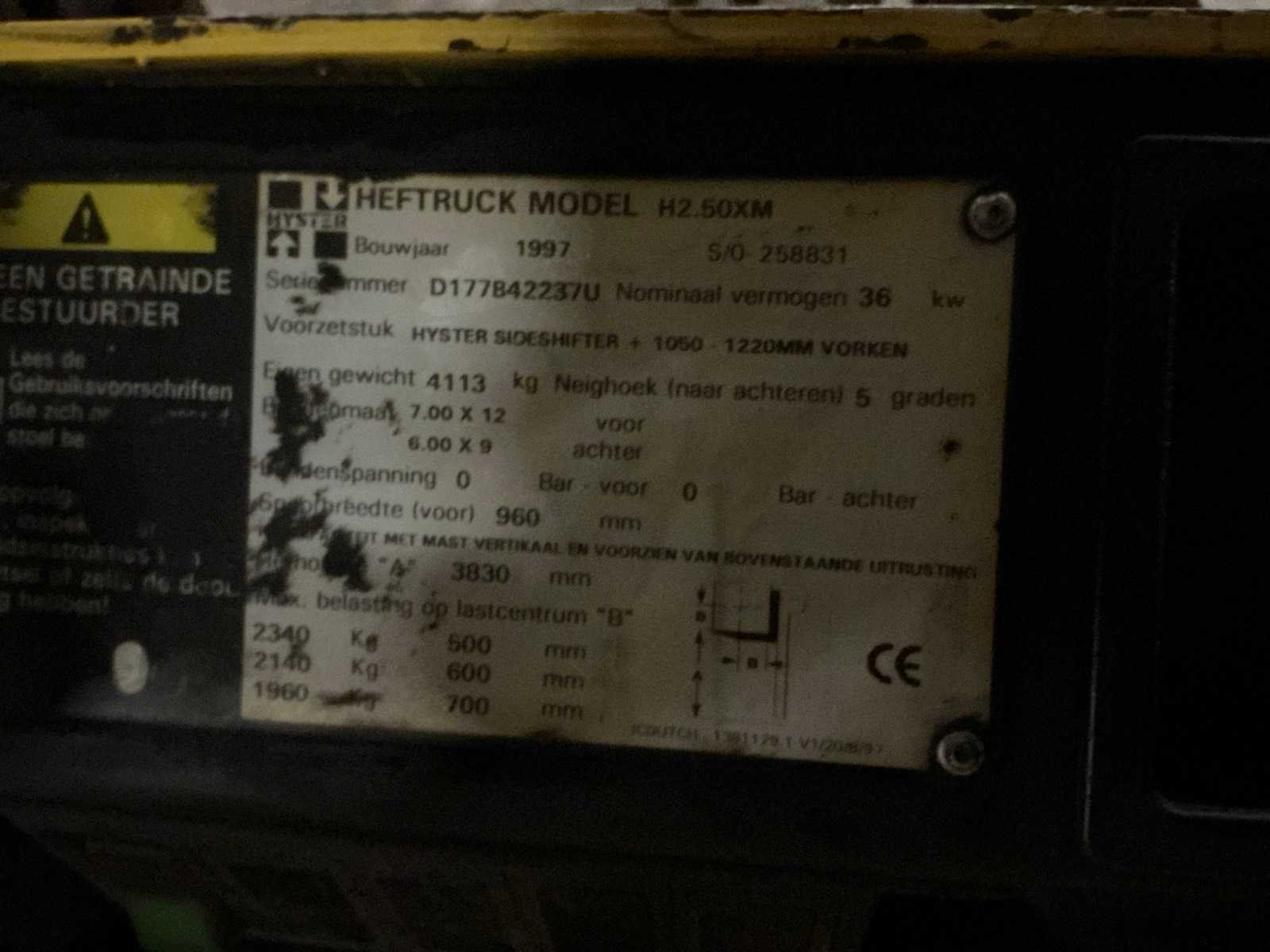 Merk: Hyster Type: H2.50XM Aantal wielen: 4 Side-shift: true Duplex mast: true Hefvermogen: 2500kg Lepellengte: 1100mm Max. hefhoogte: 3830mm Vol rubber banden: true Minimale doorrijhoogte: 2140mm Diesel: true