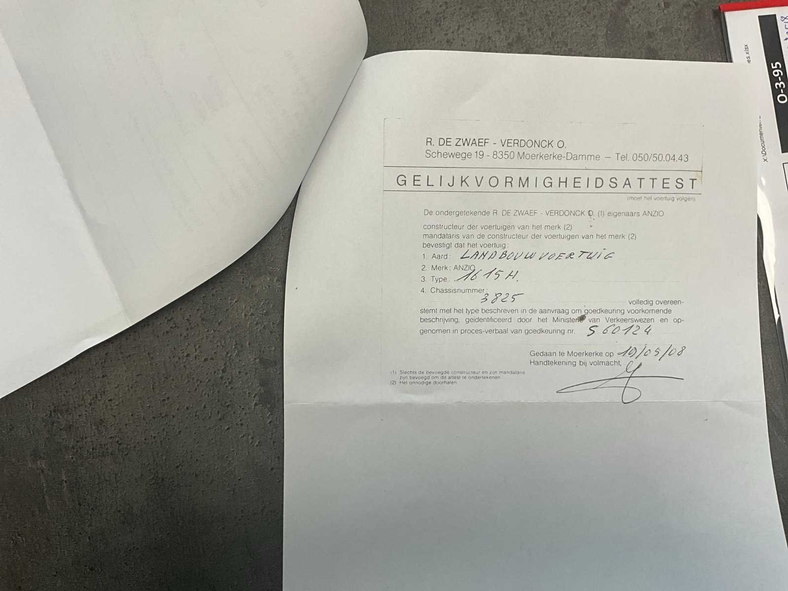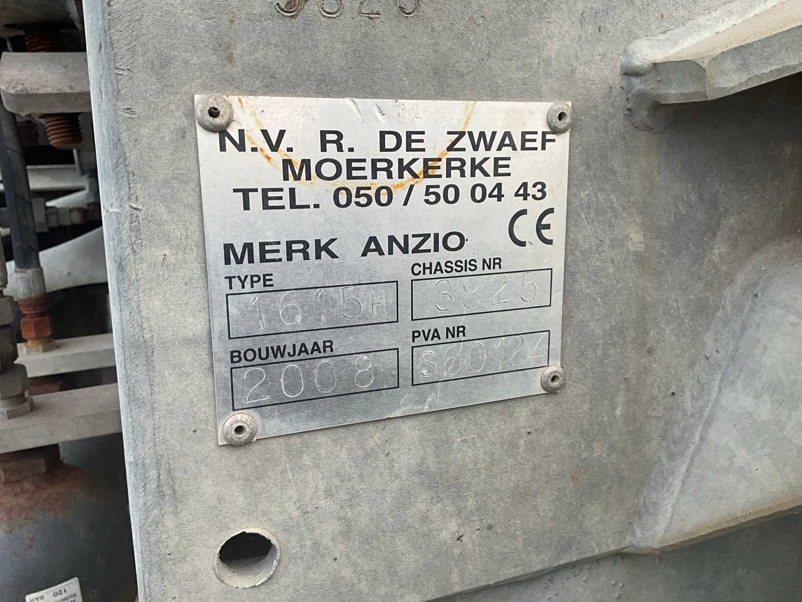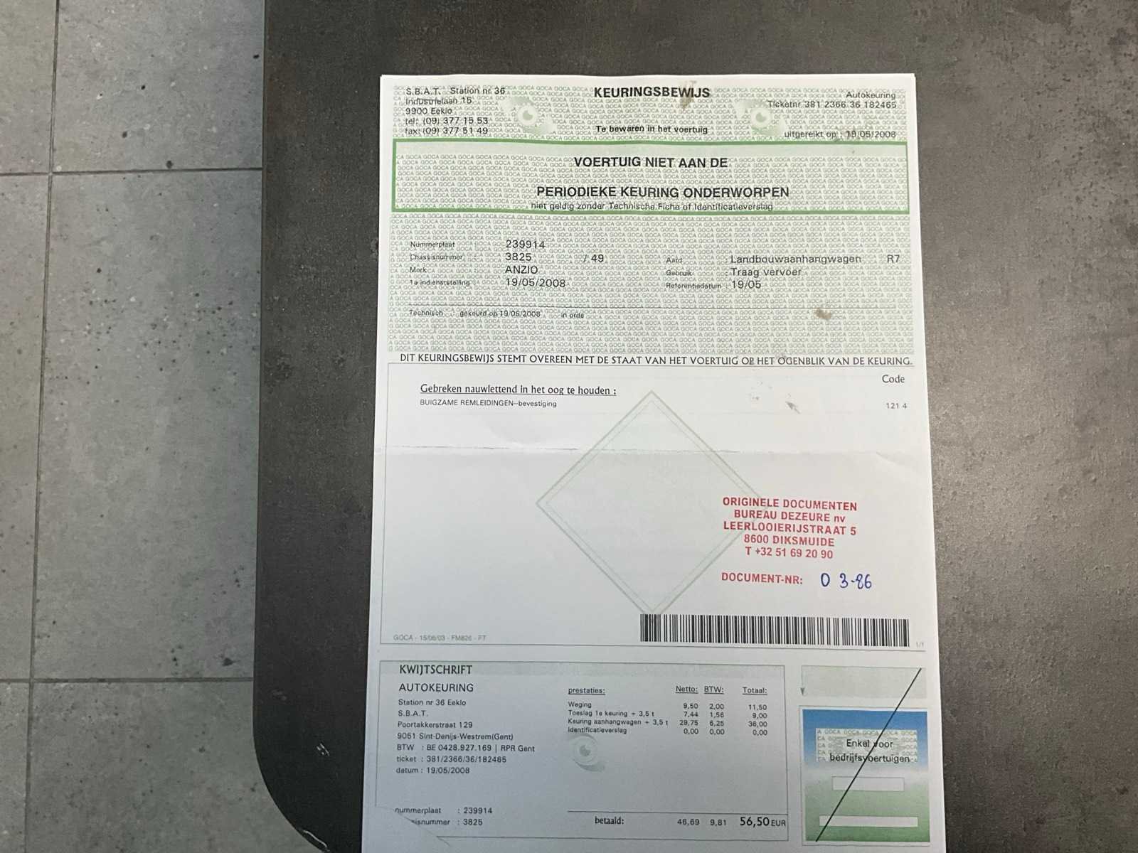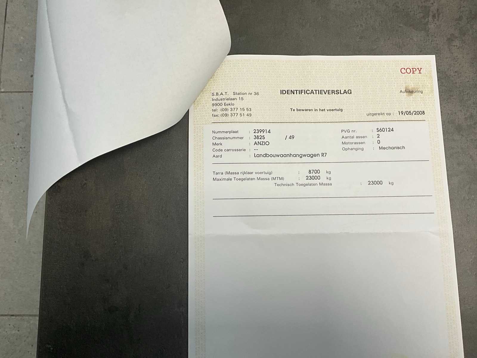Merk: ANZIO Type: 1615H Serienummer / Chassisnummer: 3825 Bouwjaar: 2008 PVA-nummer: S60124 Aard: Landbouwaanhangwagen R7 Aantal assen: 2 Ophanging: Mechanisch Eigen gewicht (tarragewicht): 8.700 kg Maximaal toegelaten massa (MTM): 23.000 kg Technisch toegelaten massa: 23.000 kg Motorassen: 0 (geen aangedreven as) Inclusief onderstel: Ja Luchtdrukwisselsysteem: Ja Merk: ANZIO Type: 1615H Bouwjaar: 2008 Serienummer: 3825 Met onderstel: true Luchtdrukwisselsysteem: true Eigen gewicht: 8700kg