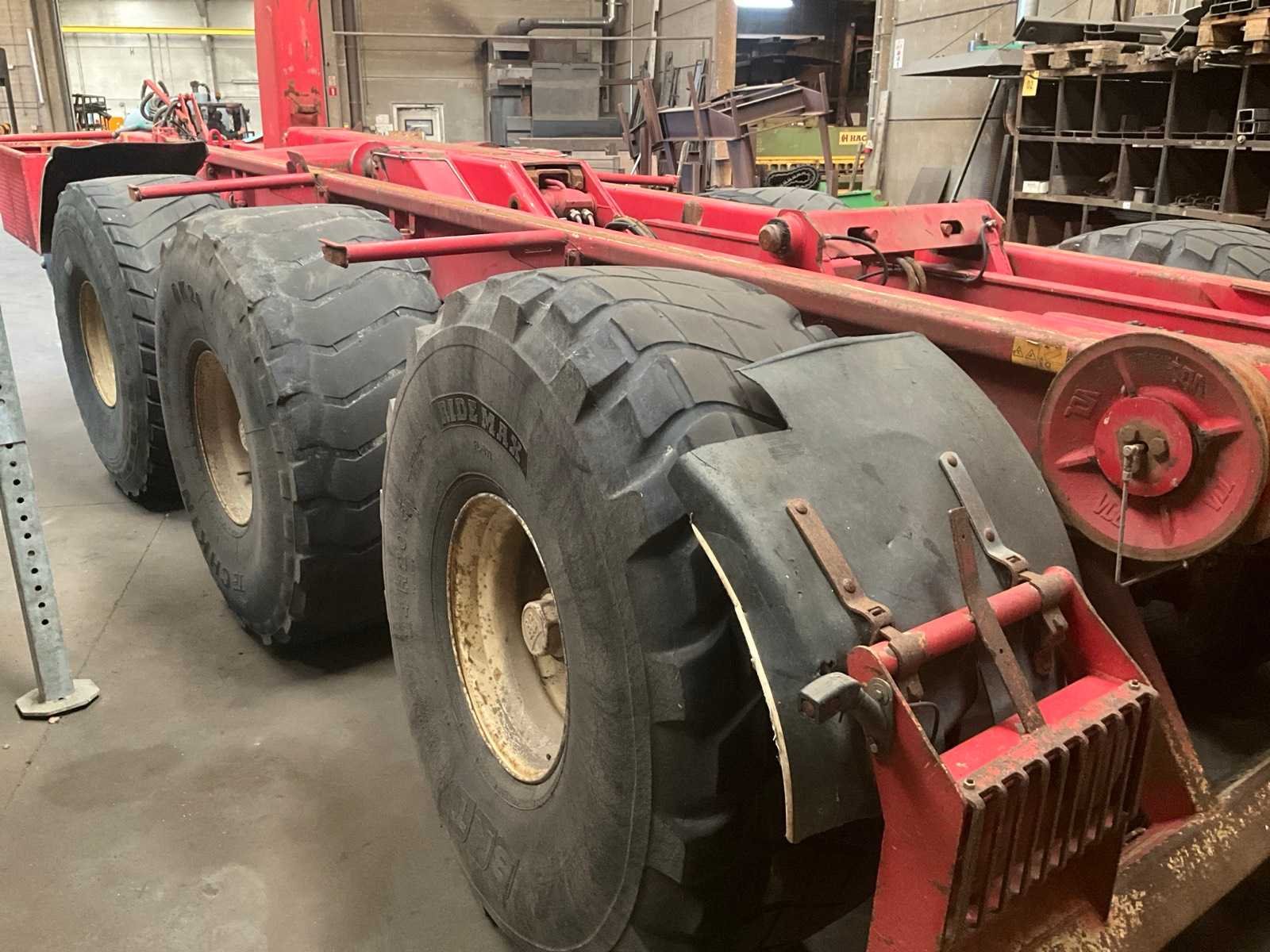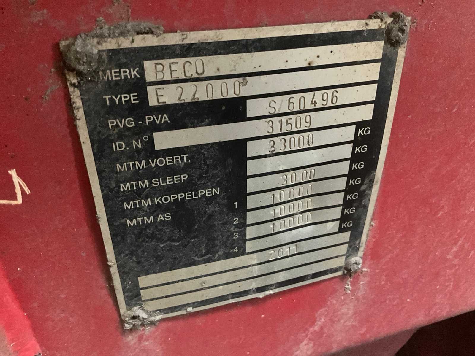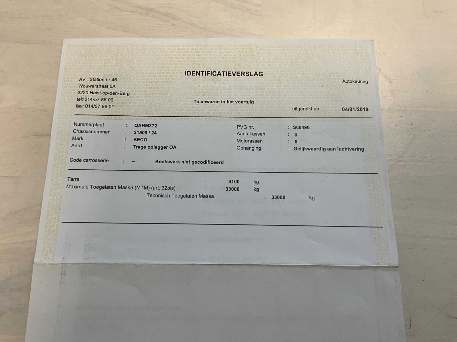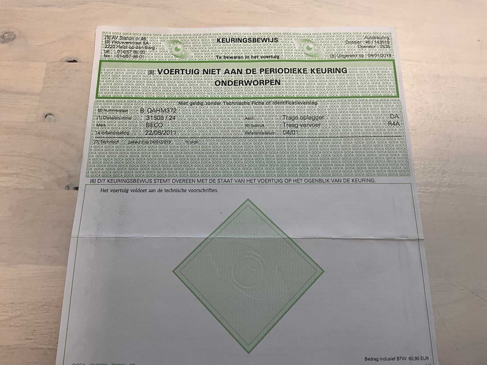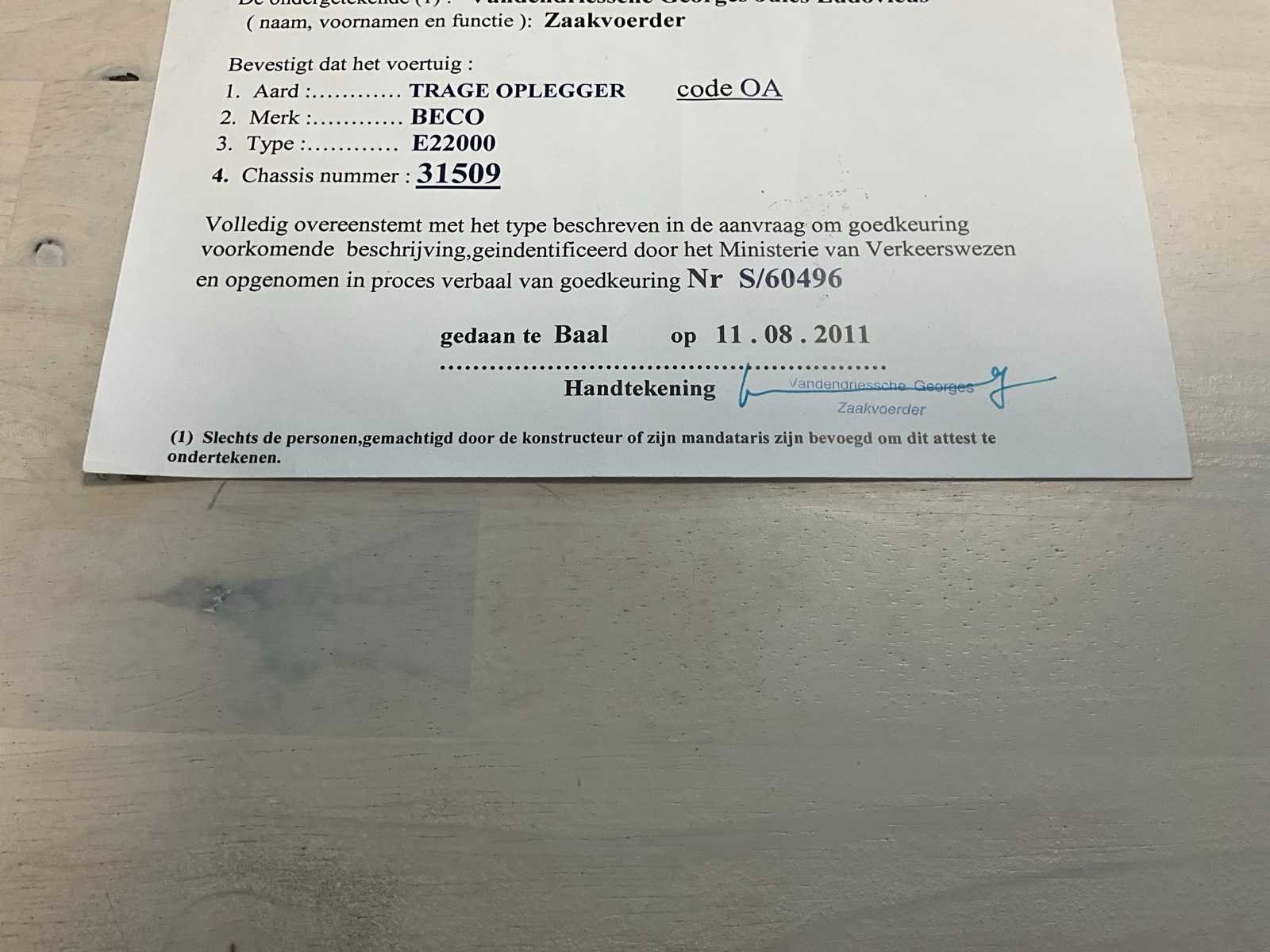 Merk: BECO Type: E22000 (Conoform 30000 – vermeld op plaat) Chassisnummer: 31509 / 24 Bouwjaar: 2011 PVA / PVG-nummer: S60496 Aard: Trage oplegger OA (landbouw/agrarisch transport) Aantal assen: 3 Motorassen: 0 (niet aangedreven, getrokken oplegger) Ophanging: Gelijkwaardig aan luchtvering Tarragewicht: 9.100 kg Maximaal toegelaten massa (MTM): 33.000 kg Technisch toegelaten massa: 33.000 kg MTM sleep: 30.000 kg MTM koppelpen: 10.000 kg MTM per as: 10.000 kg Kenteken: QAHM372 Identificatierapport: Uitgereikt op 04/01/2019 Goedkeuringsnummer: S/60496 Keuringsbewijs: vrijgesteld van periodieke keuring (traag vervoer) Fabrikant: B.V. BECO, De Limiet 18, Vianen, Nederland Staat: Gebruikt, rode uitvoering, geschikt voor zwaar agrarisch transport Merk: BECO Type: E22000 Bouwjaar: 2011 Serienummer: 31509 / 24 Bouwjaar: 2011
