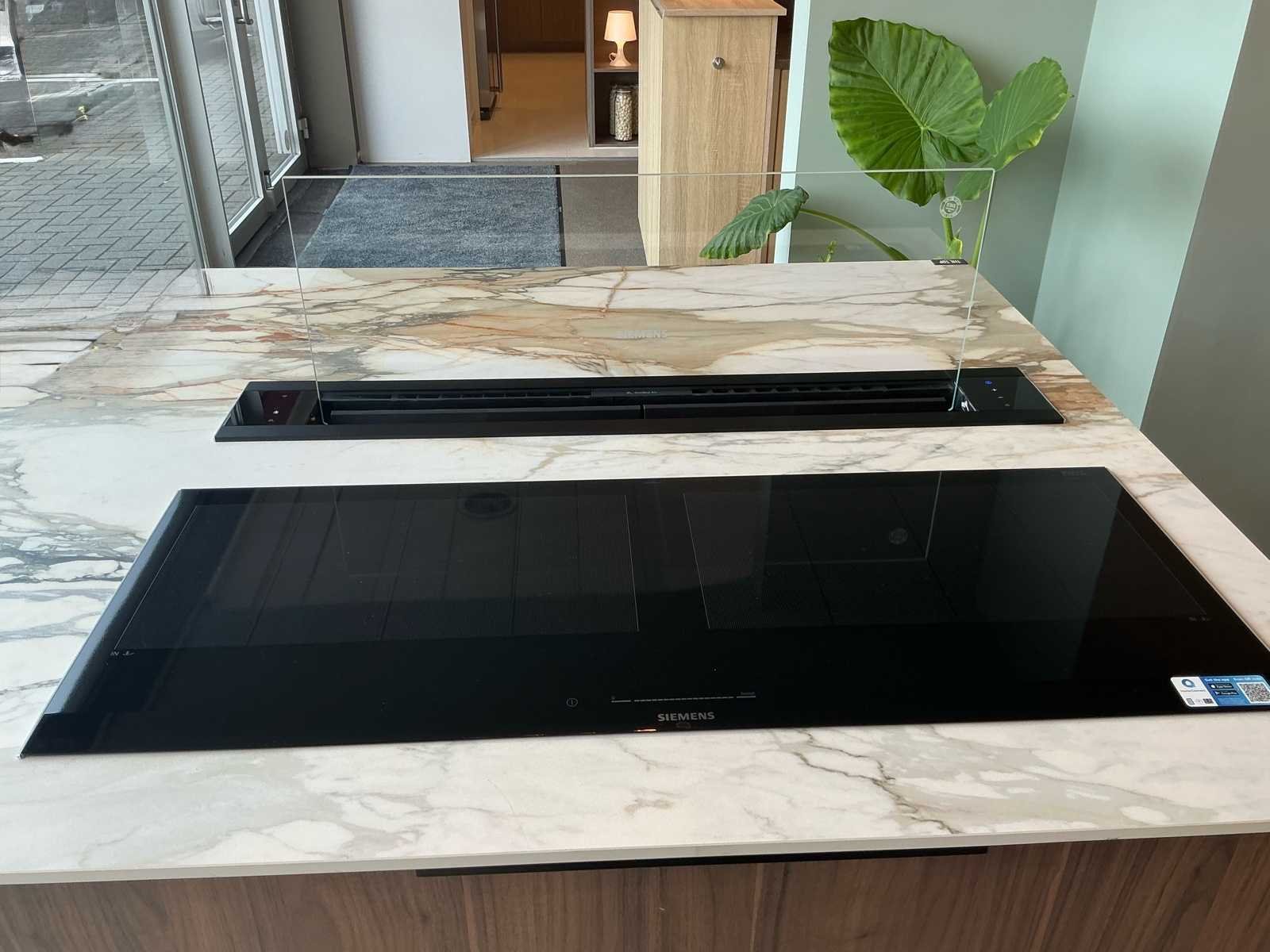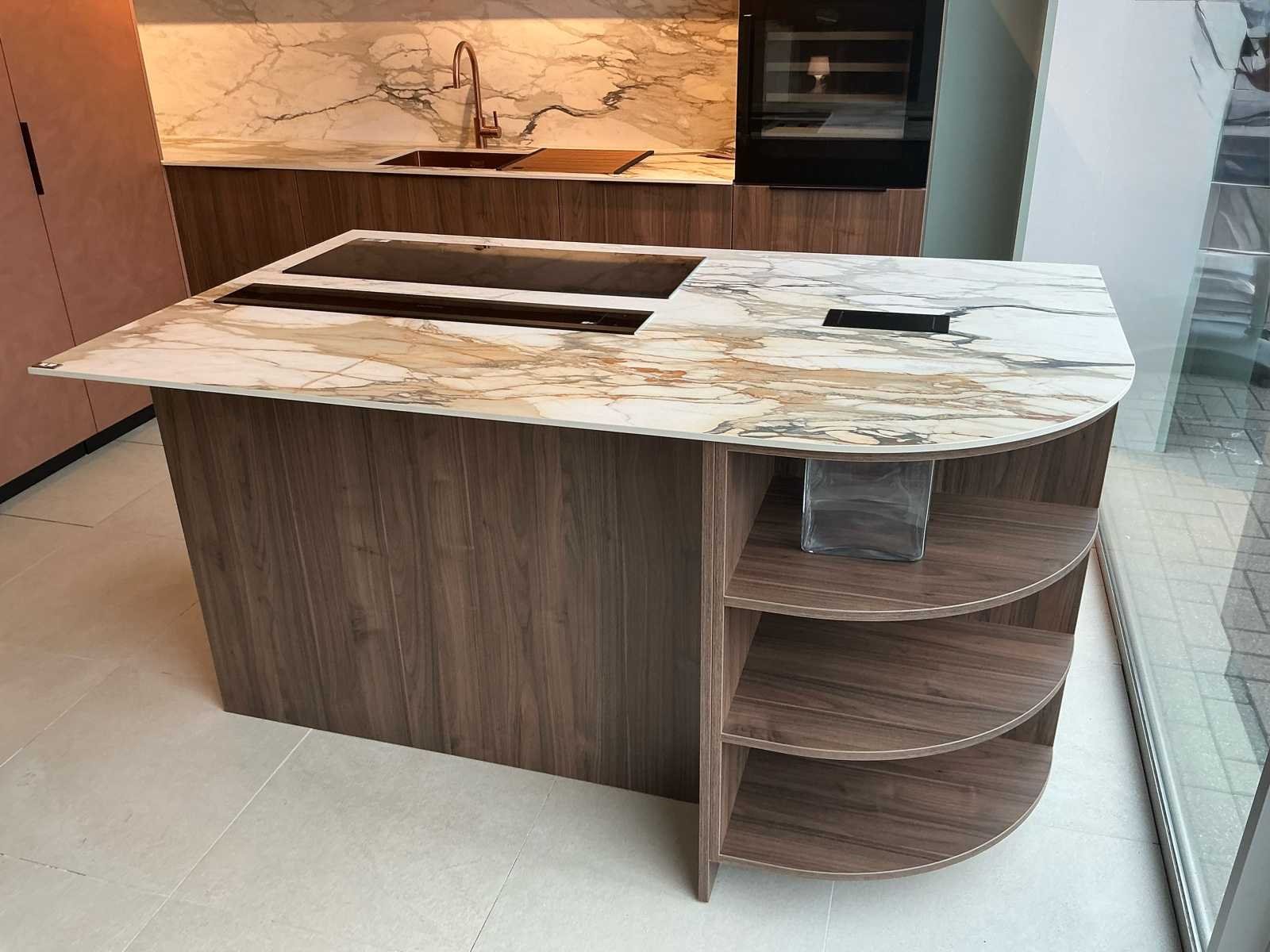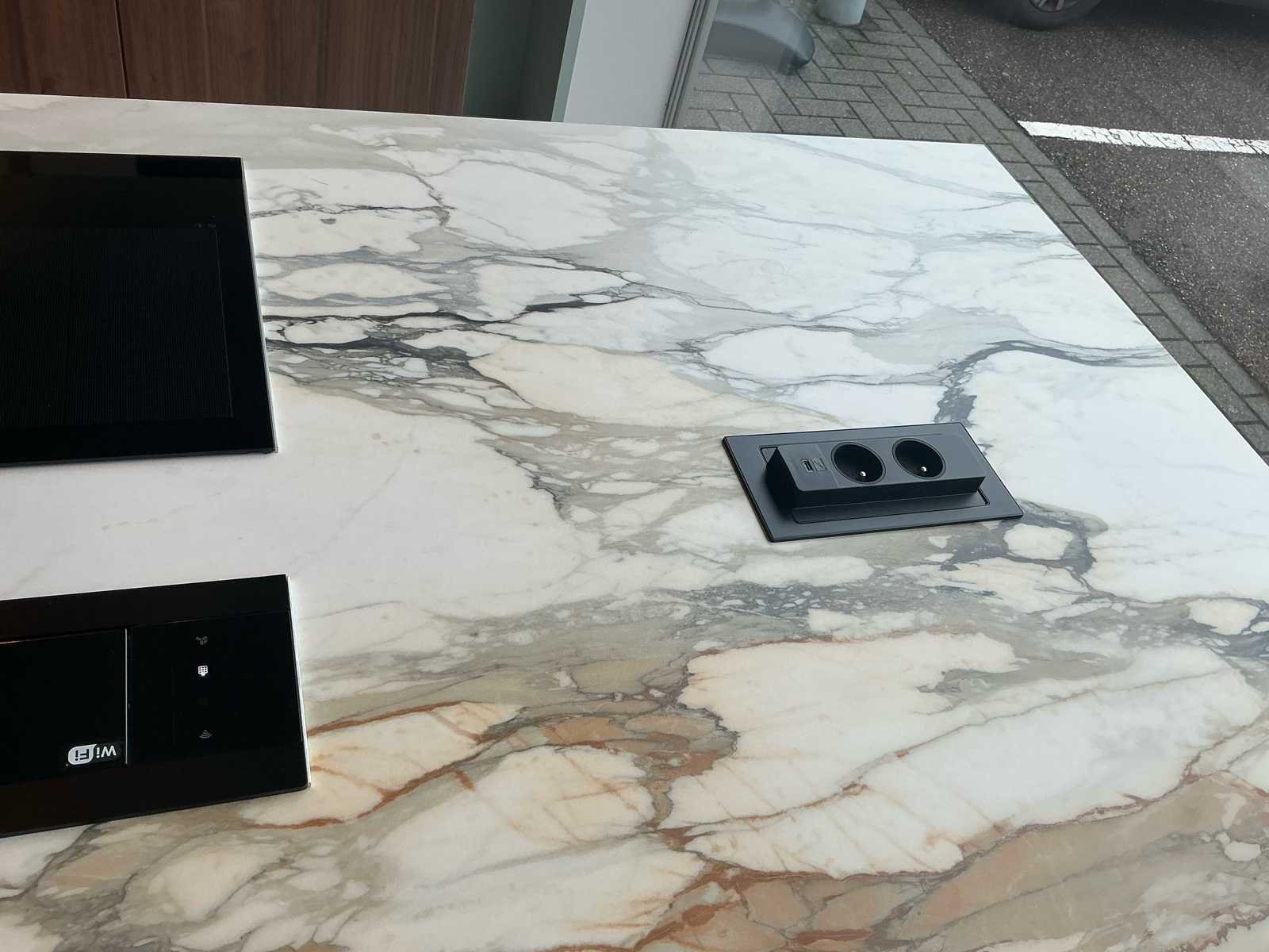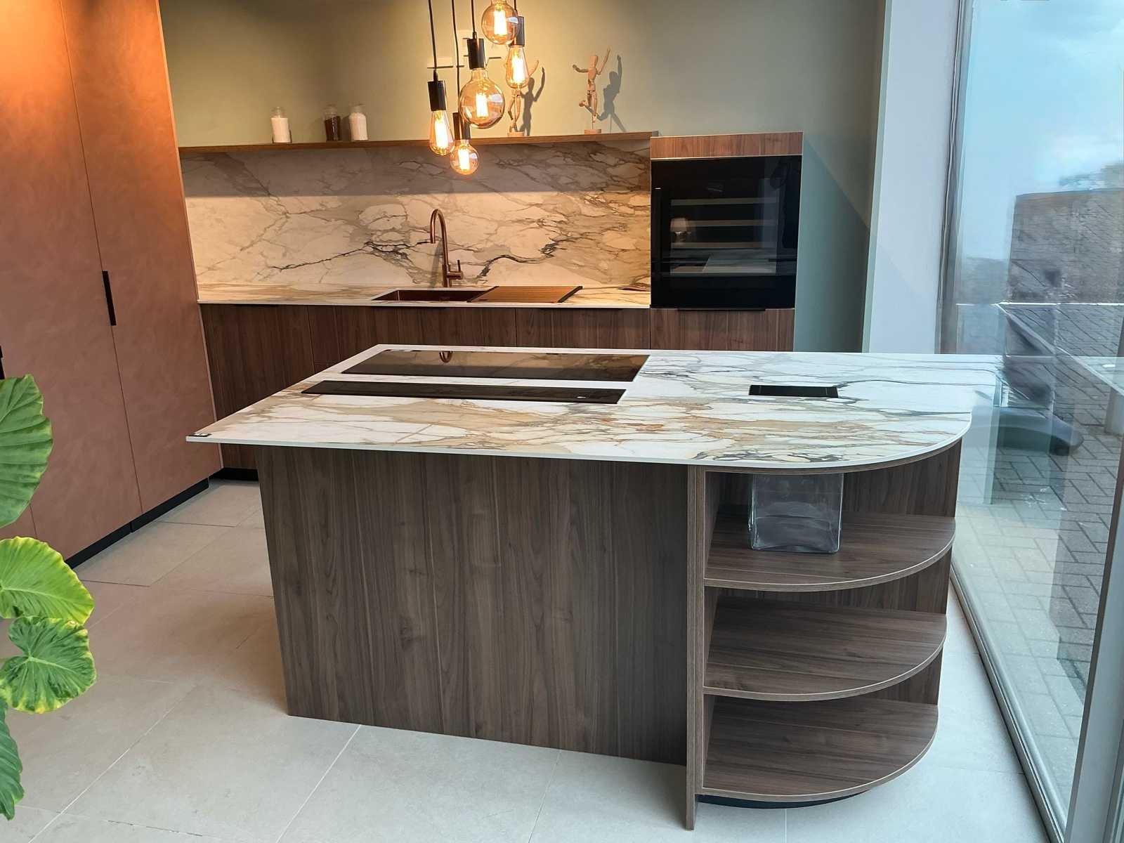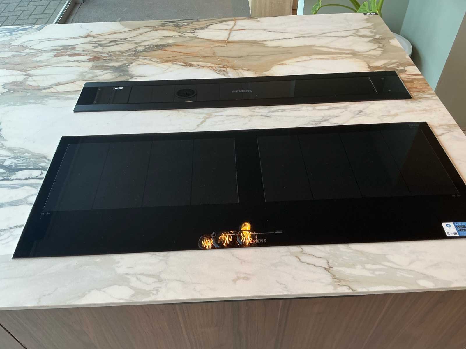 Kookeiland L. 1m80cm B. 1m50cm. Met afgeronde hoek, kasten met oven en combi microgolfoven B. 2m40cm H. 2m32cm, afwasmachine Siemens slechts 2 x gebruikt bij open deurdagen, 2 doorloop deuren, wijnkoeler Autova avintage, keramisch werktablet van 12 mm. Merk: The Top Model: The Top Werkblad hoogte: Keramischcm