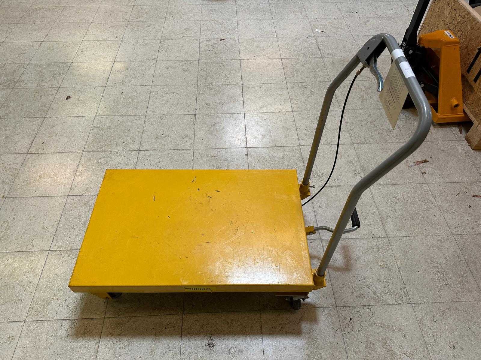 Hydraulische schaarheftafel Draagvermogen: 300 kg (aangeduid op zijkant) Verrijdbaar met 4 wielen Handbediende pomp met voetpedaal Werkend (op foto's zichtbaar in geheven positie) Gebruikerssporen: krassen op blad, lichte slijtage Merk: HBM Product type: Hydraulische verrijdbare heftafel Kleur: Geel / Grijs Materiaal: Metaal