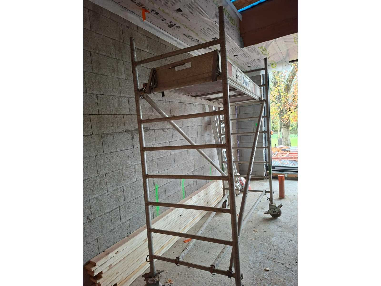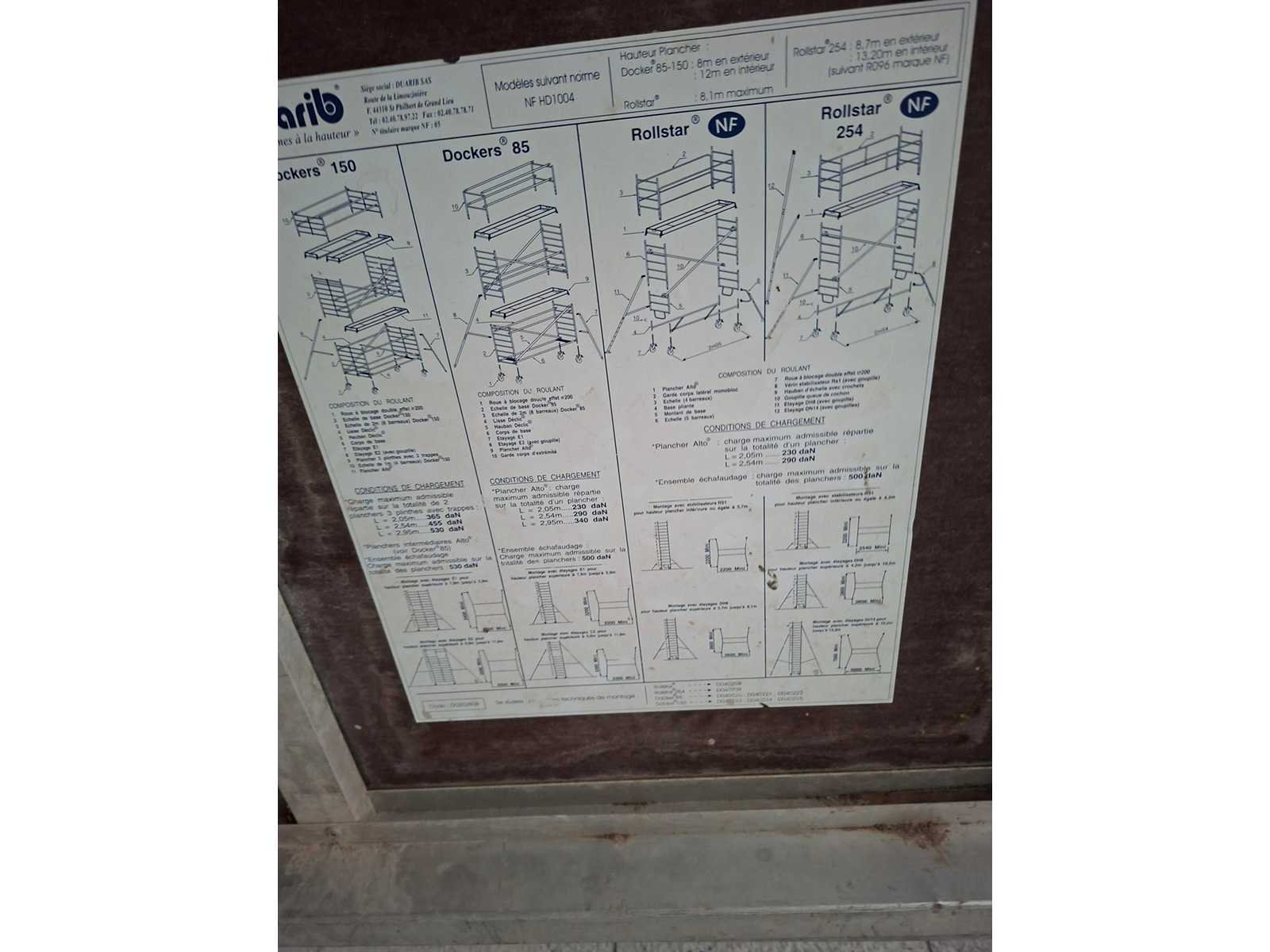 DUARIB Rollstar Rolling Steiger – Hoogte 2,50 m – Breedte 2,00 m – Diepte 0,80 m DUARIB professioneel aluminium walssteiger, Rollstar-reeks, voldoet aan de NF HD 1004-standaard. Complete set inclusief de hoofdstructuur, een aluminium/houten bovenblad, vangrails en extra stangen. Non Merk: Duarib Type: Rollstar 254 Afmeting l: 2000mm Afmeting b: 800mm Afmeting h: 2500mm