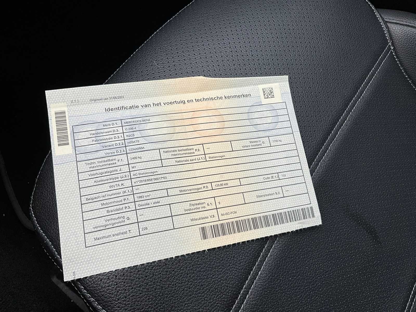 Merk: Mercedes-Benz Model: C200d Bouwjaar: 2022 Cilinderinhoud: 1993cc Vermogen (kW): 120kW Brandstof: Diesel Chassisnummer: W1K2062031F053896 Datum eerste toelating: 31/05/2022 Aantal zitplaatsen: 5 Kleur: Blauw Transmissie: Automtisch Emissieklasse: 6d-ISDC-FCM Nationaliteit documenten: België Gelijkvormigheidsattest aanwezig: true Start en rijdt: Ja Airconditioning: true Navigatie: true LED-koplampen: true Inschrijvingsbewijs - deel 1 : Aanwezig Inschrijvingsbewijs - deel 2: Aanwezig
