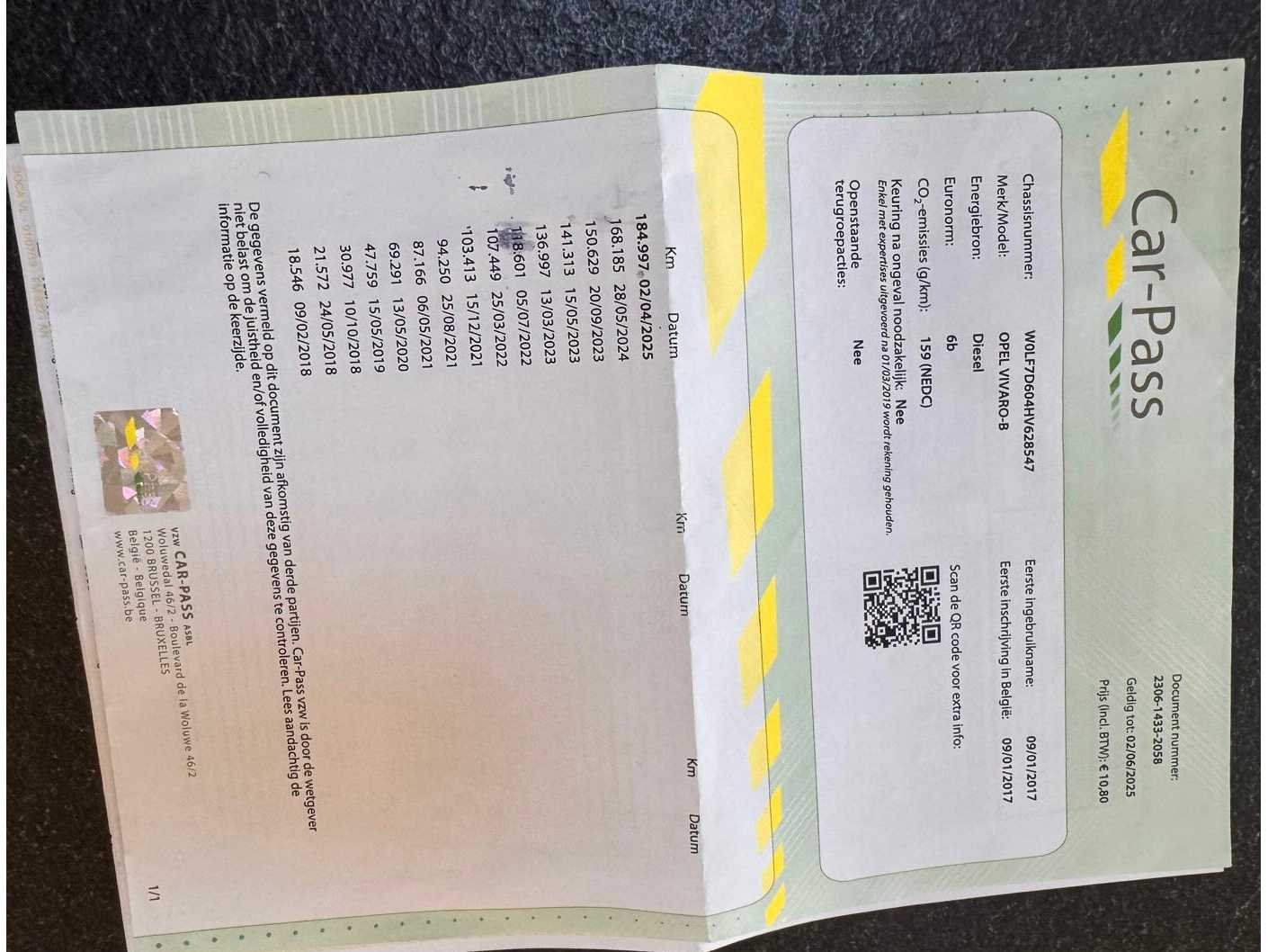 !!! ADBLUE is uitgeschreven !!! Merk: Opel Model: Vivaro Bouwjaar: 2017 Cilinderinhoud: 1598cc Vermogen (kW): 92kW Brandstof: diesel Chassisnummer: W0LF7D604HV628547 Datum eerste toelating: 09/01/2017 Aantal zitplaatsen: 5 Kleur: Grijs Transmissie: Handgeschakeld Emissieklasse: Euro 6b Aantal sleutels: 2 Nationaliteit documenten: België Start en rijdt: Ja Vavato voert geen technische keuring uit.: true