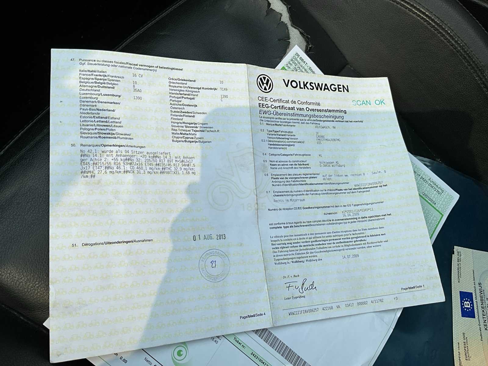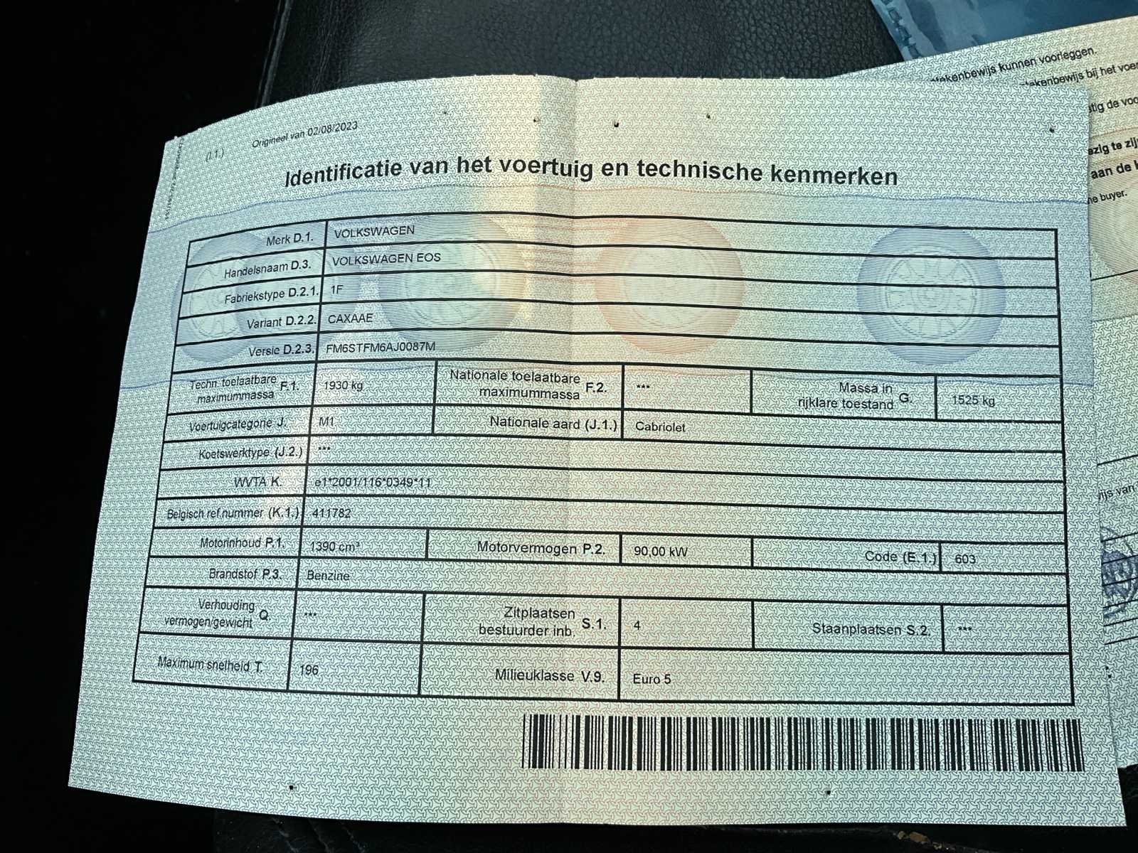 Merk: Volkswagen Model: Eos Bouwjaar: 2009 Afgelezen kilometerstand: 102957km Cilinderinhoud: 1390cc Vermogen (kW): 90kW Brandstof: benzine Chassisnummer: WVWZZZ1FZAV006257 Datum eerste toelating: 03/08/2009 Transmissie: Handgeschakeld Nationaliteit documenten: Belgisch Start en rijdt: Ja startinformatie : Start en rijdt Inschrijvingsbewijs - deel 1 : Aanwezig Inschrijvingsbewijs - deel 2: Aanwezig
