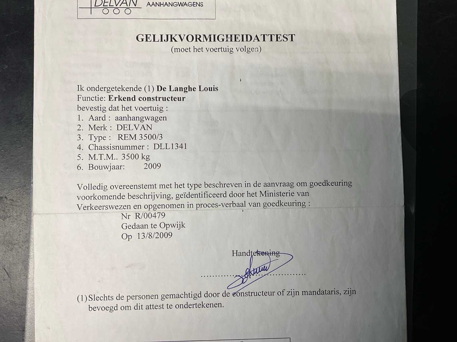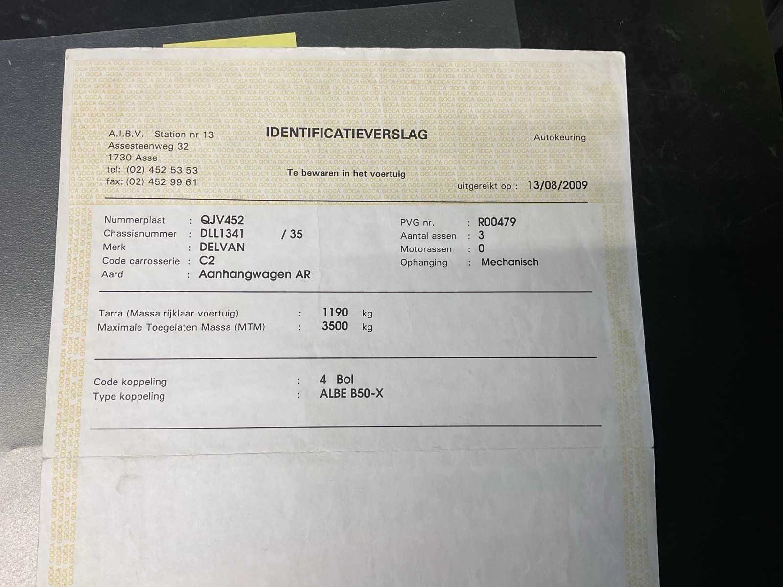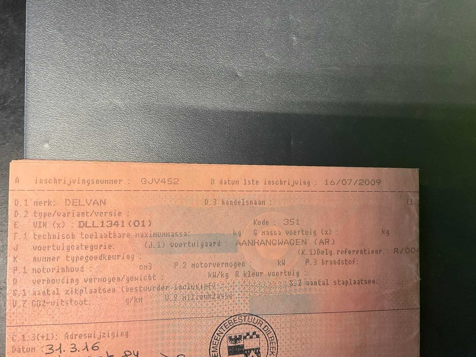 Chassis lichtjes krom . Merk: Delvan Type: REM3500/3 Bouwjaar: 2009 Chassisnummer: DLL1341 Aantal assen: 3 Laadbak afmeting l: 400cm Laadbak afmeting b: 200cm Ledig gewicht: 1190kg Laadvermogen: 3500kg Datum eerste toelating: 16/07/2009 Nationaliteit documenten: België