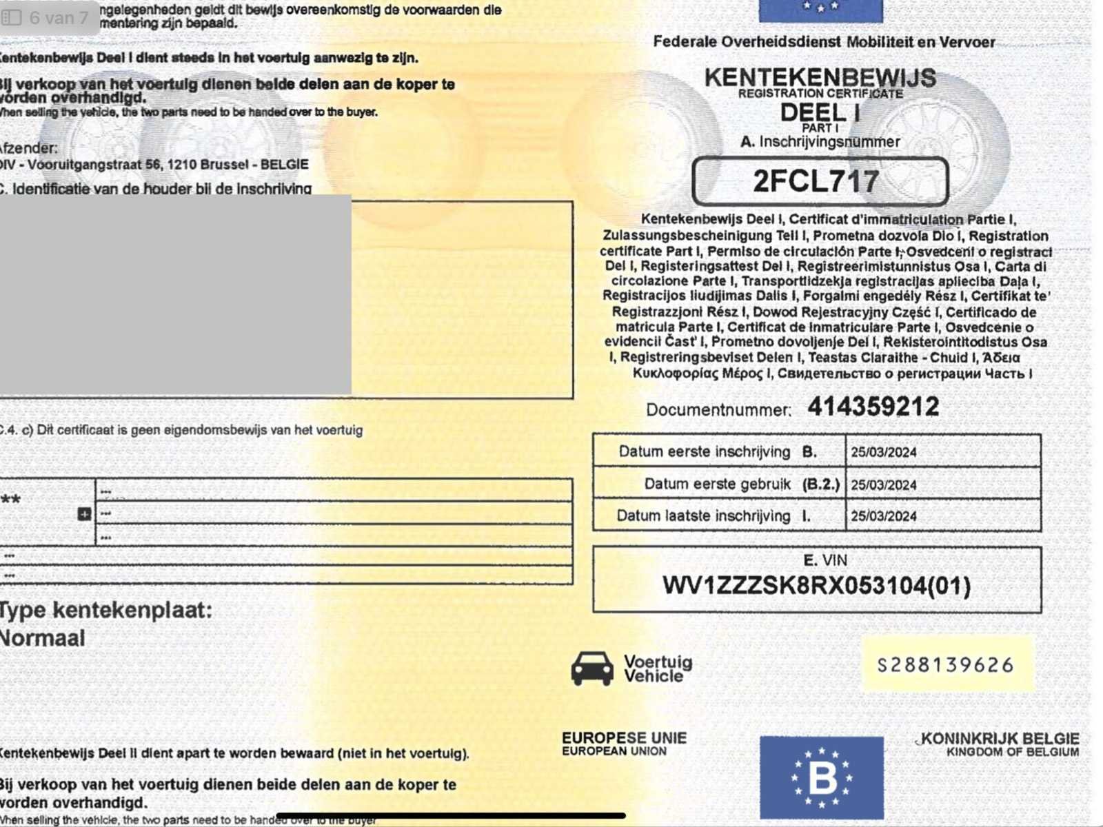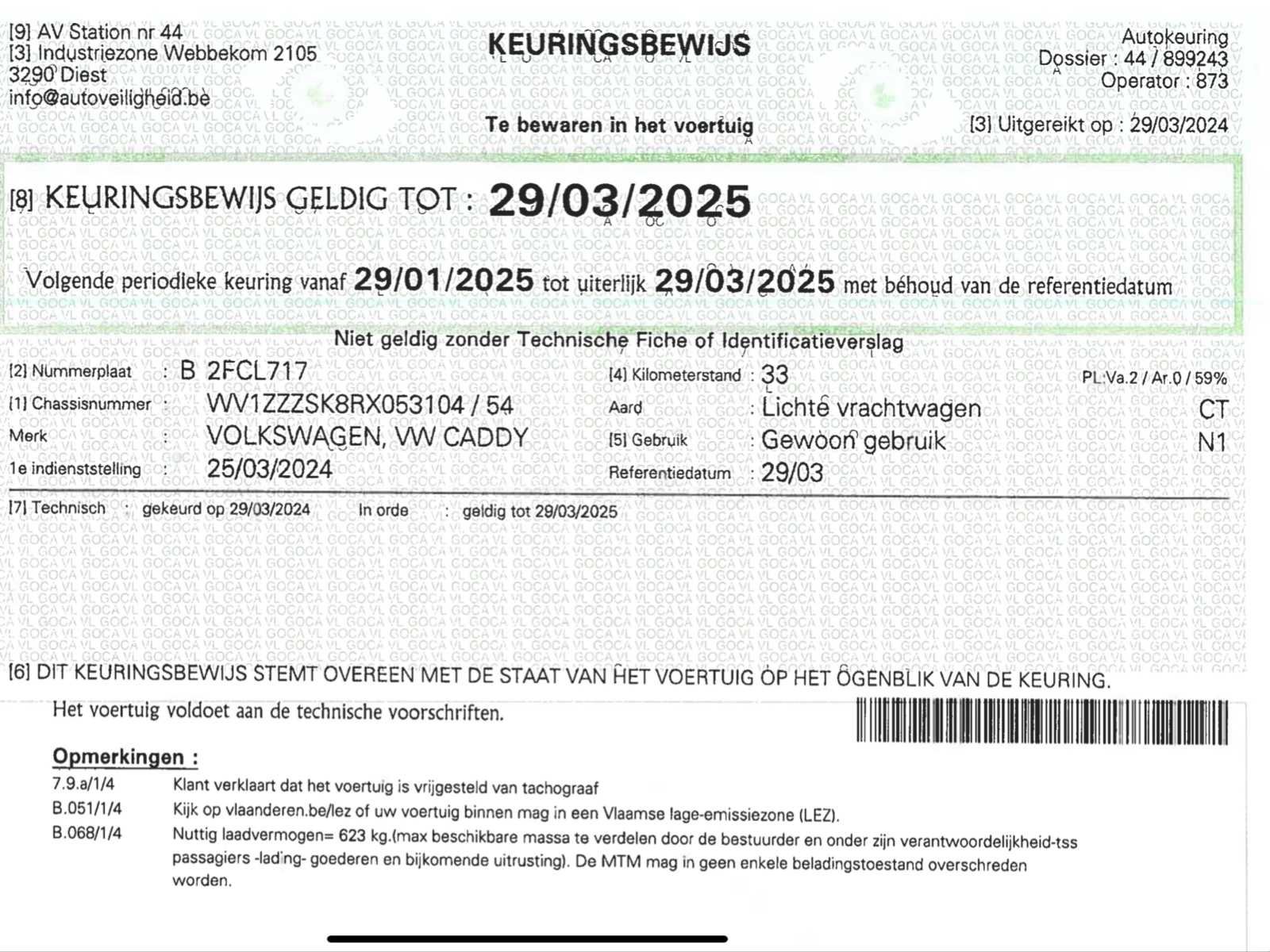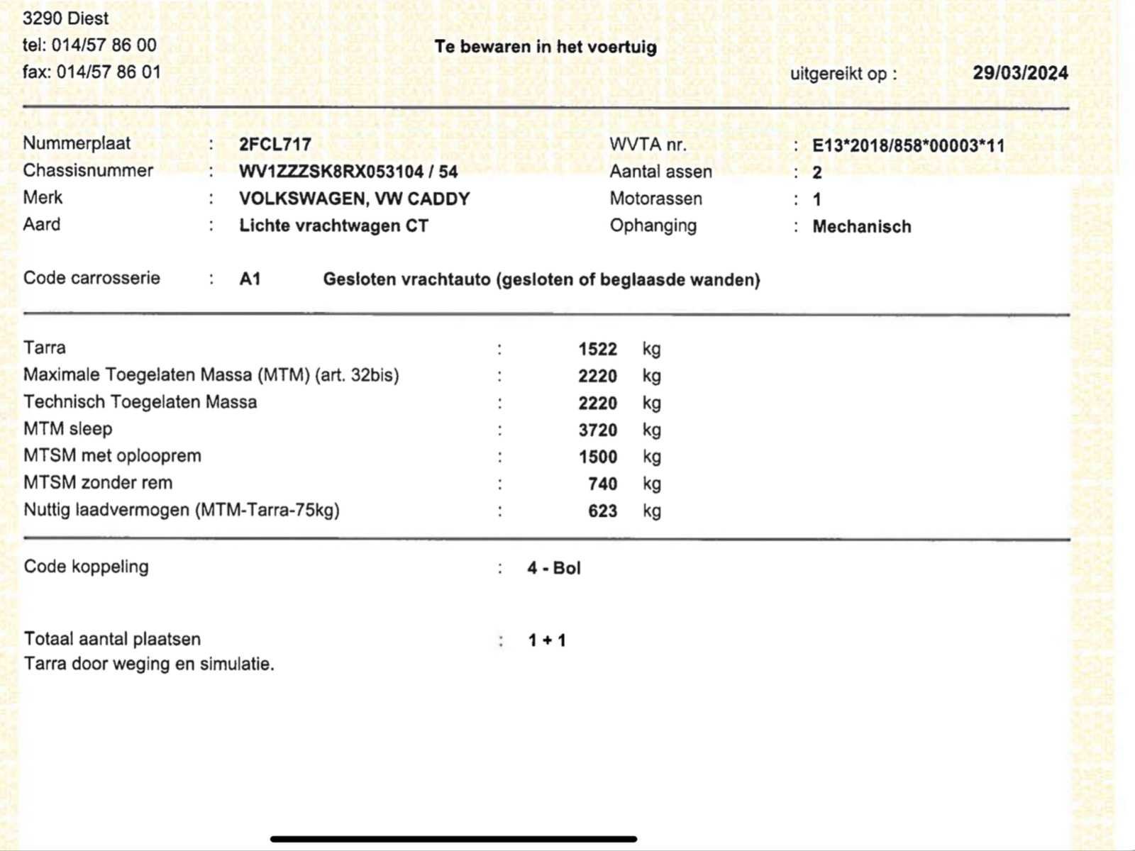 Slechts 54000km, navigatie, parkeersensoren, … lichte beschadigingen aan carrosserie (zie foto, hindert niet bij gebruik van de deur) Merk: VW Model: Caddy Type: lichte vracht - 54000km Bouwjaar: 2024 Afgelezen kilometerstand: 54108km Cilinderinhoud: 1968cc Vermogen (kW): 75kW Brandstof: diesel Chassisnummer: WV1ZZZSK8RX053104 Laadvermogen: 623kg Datum eerste toelating: 25/3/2024 Kleur: wit Transmissie: handgeschakeld Emissieklasse: Euro 6d Aantal deuren: 5 Ledig gewicht: 1510kg Nationaliteit documenten: B Gelijkvormigheidsattest aanwezig: true Start en rijdt: ja Zichtbare schade: ja Vavato voert geen technische keuring uit.: true Airconditioning: true Inschrijvingsbewijs - deel 1 : aanwezig Inschrijvingsbewijs - deel 2: aanwezig