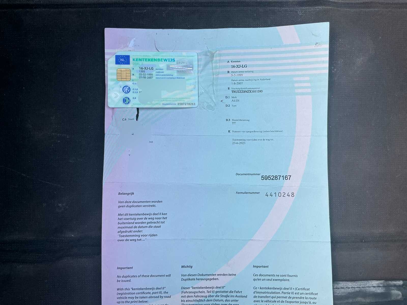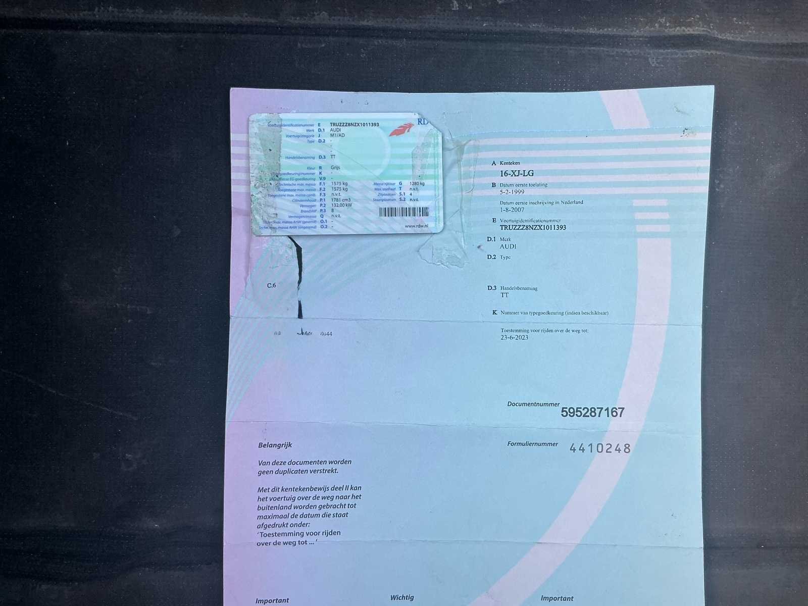 Voertuig is nog niet in België ingeschreven<gr>inclusief 4 velgen Kenteken: 16-XJ-LG Merk: Audi Model: TT Coupé Bouwjaar: 1999 Afgelezen kilometerstand: 139329km Cilinderinhoud: 1781cc Vermogen (kW): 132kW Brandstof: Benzine Chassisnummer: TRUZZZ8NZX1011393 Datum eerste toelating (NL): 01/08/2007 Aantal zitplaatsen: 4 Transmissie: Handgeschakeld Aantal sleutels: 2 Start en rijdt: Ja Vavato voert geen technische keuring uit.: true