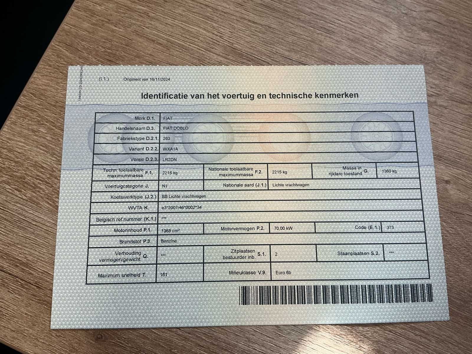 Kenteken: 2GEN933 Merk: Fiat Model: Doblo Bouwjaar: 2018 Afgelezen kilometerstand: 103937km Cilinderinhoud: 1368cc Vermogen (kW): 70kW Brandstof: Benzine Chassisnummer: ZFA26300006L91195 Datum eerste toelating: 19/10/2018 Aantal zitplaatsen: 2 Transmissie: Handgeschakeld Emissieklasse: Euro 6b Nationaliteit documenten: Belgische Start en rijdt: Ja Keuringsrapport geldig tot: 06/11/2025 Vavato voert geen technische keuring uit.: true Inschrijvingsbewijs - deel 1 : Aanwezig Inschrijvingsbewijs - deel 2: Aanwezig