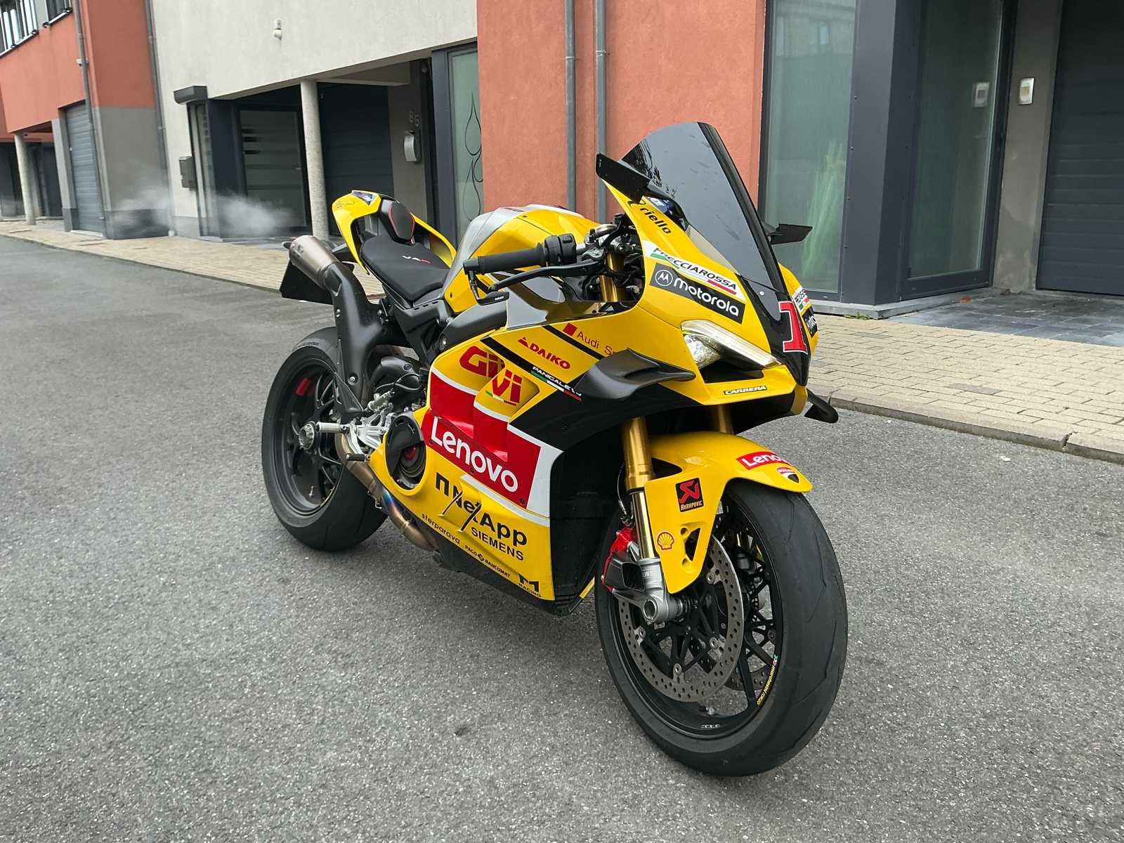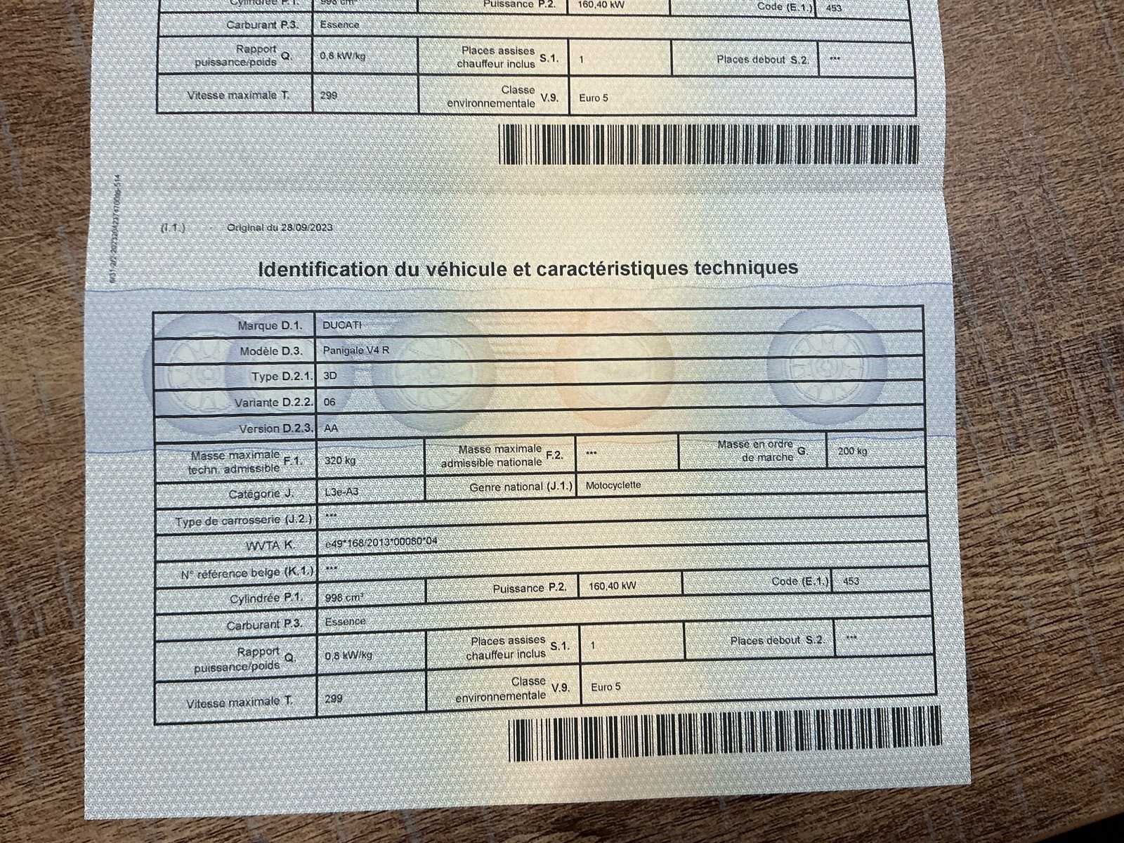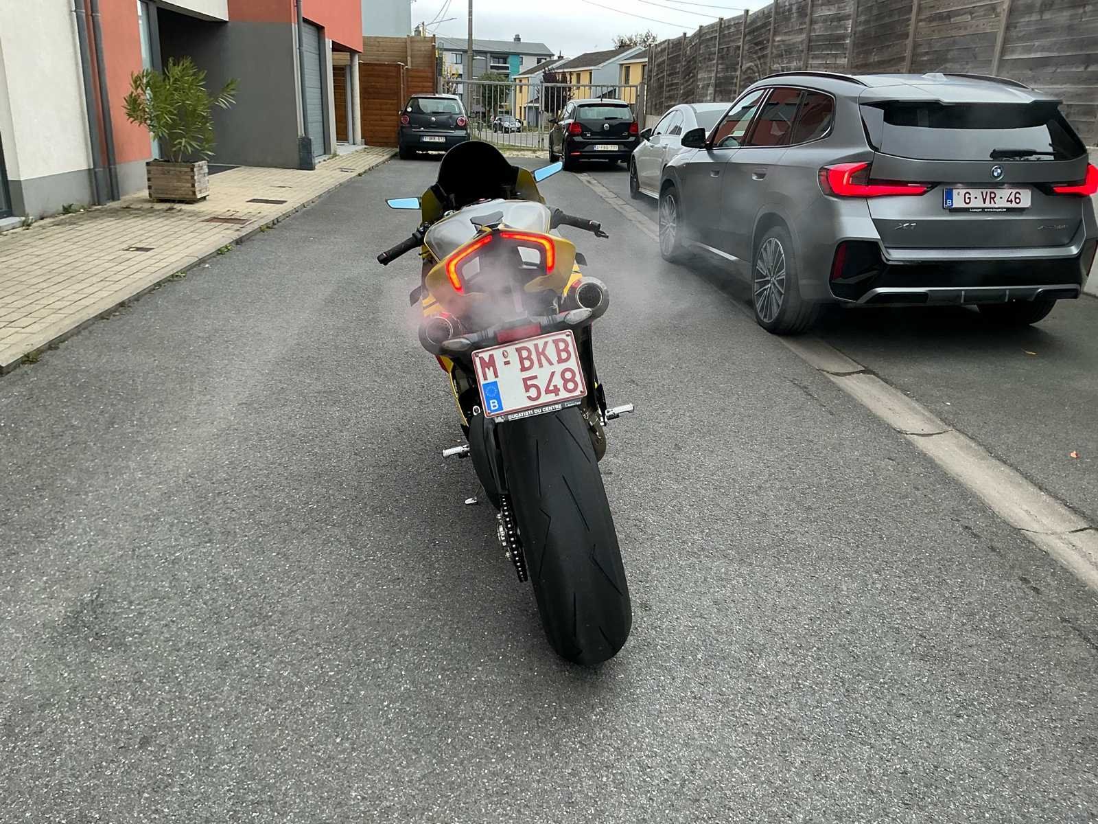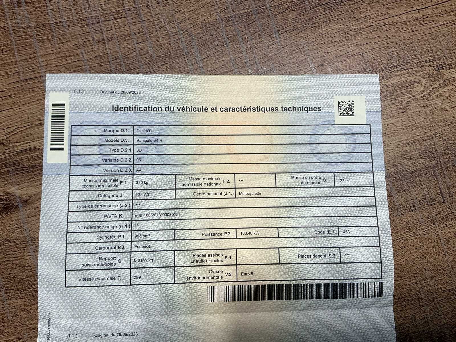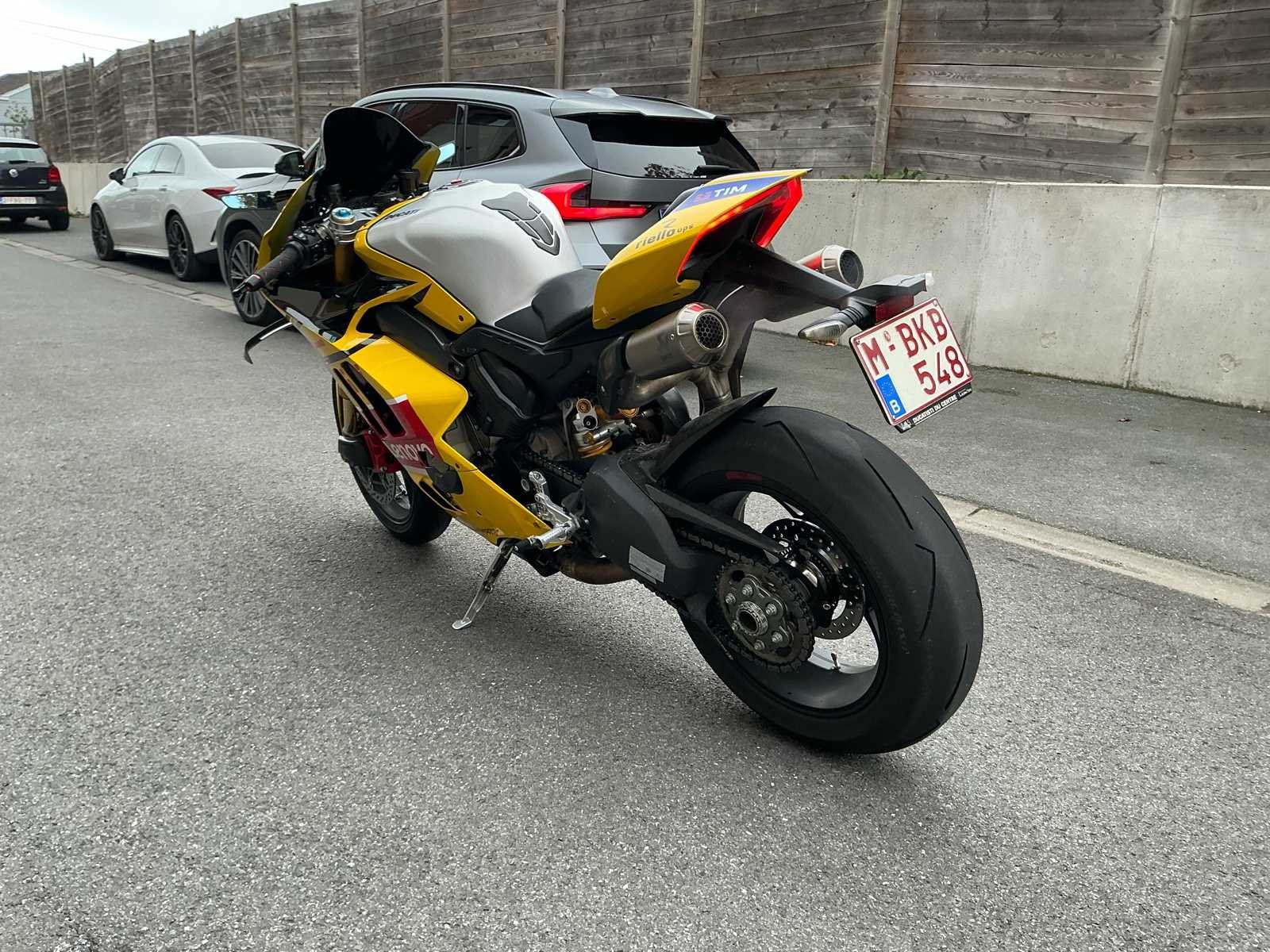 Orginele Kuipen ook aanwezig. De Ducati Panigale V4 R is het ultieme circuitgerichte model binnen de Panigale-reeks – rechtstreeks afgeleid van Ducati’s WSBK-racemotor. Met een 998 cc Desmosedici Stradale R-motor levert deze machine 218 pk in standaardvorm, en tot 240 pk met de optionele racing-uitlaat. De V4 R is gebouwd voor pure prestaties: een lichter motorblok, titanium onderdelen, en een geavanceerde aerodynamische kuip met carbon-winglets. Dankzij het lage gewicht (167 kg droog) en het Öhlins NPX25/30-onderstel, behoort de V4 R tot de absolute top van de hedendaagse superbikes. Merk: Ducati Model: Panigale V4 R Brandstof: Benzine Chassisnummer: ZDM3D06AARB007429 Cilinderinhoud: 998cc Datum eerste toelating: 28/09/2023 Gewicht: 200kg Vermogen (kW): 160kW Kleur: Geel Afgelezen kilometerstand: 6191km Transmissie: Manueel Nationaliteit documenten: Belgisch