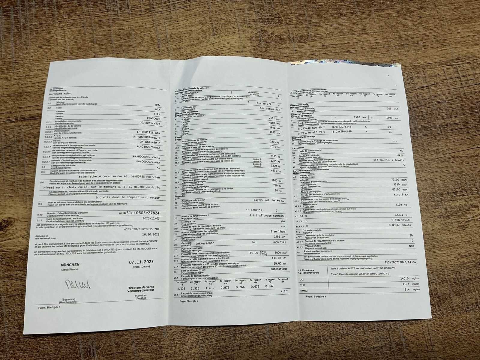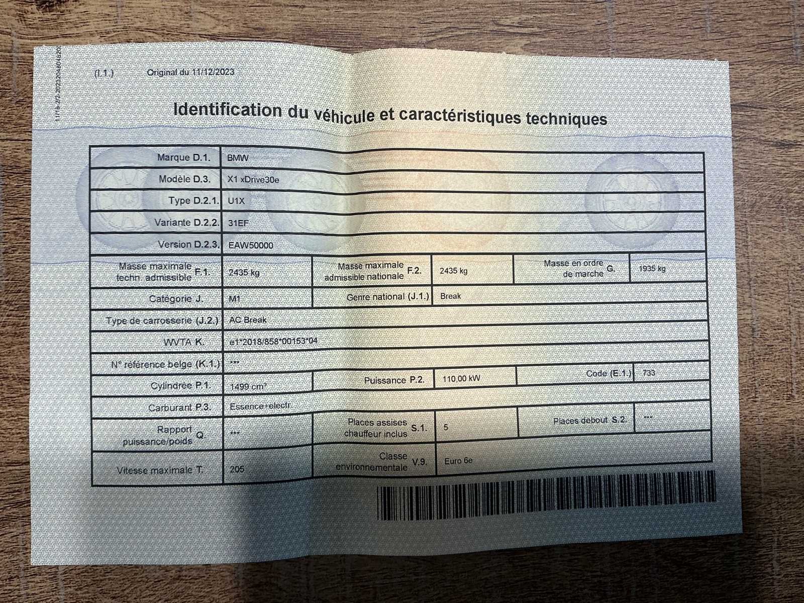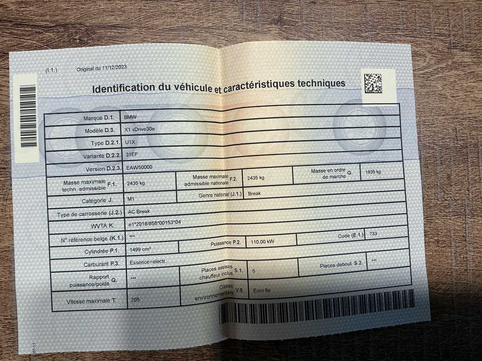De wagen bevindt zich in topstaat en zit bomvol opties, De wagen heeft ook nog 3 jaar garantie. Deze BMW X1 xDrive30e is een compacte SUV met vierwielaandrijving (xDrive) en plug-in hybride aandrijving. De wagen combineert een 1.5 liter benzinemotor met een elektromotor, wat zorgt voor een evenwicht tussen vermogen en brandstofefficiëntie. De auto biedt plaats voor 5 inzittenden en behoort tot de Euro 6e emissieklasse, wat hem milieuvriendelijker maakt. De automatische transmissie en elektrische ondersteuning zorgen voor een comfortabele rijervaring, zowel in stadsverkeer als op de snelweg. Merk: Bmw Model: X1 xDrive 30e Type: SUV Bouwjaar: 2023 Afgelezen kilometerstand: 42782km Cilinderinhoud: 1499cc Vermogen (kW): 110kW Brandstof: Benzine+Electrisch Chassisnummer: WBA31EF0605Y27824 Datum eerste toelating: 20/11/2023 Aandrijving: 4WD Aantal zitplaatsen: 5 Kleur: Matgrijs Transmissie: Automaat Emissieklasse: Euro 6e Aantal deuren: 5 Nationaliteit documenten: Belgische Gelijkvormigheidsattest aanwezig: true Vavato voert geen technische keuring uit.: true Airconditioning: true Navigatie: true LED-koplampen: true Leder bekleed: true Vierwielaandrijving 4x4: true Inschrijvingsbewijs - deel 1 : Aanwezig Inschrijvingsbewijs - deel 2: Aanwezig