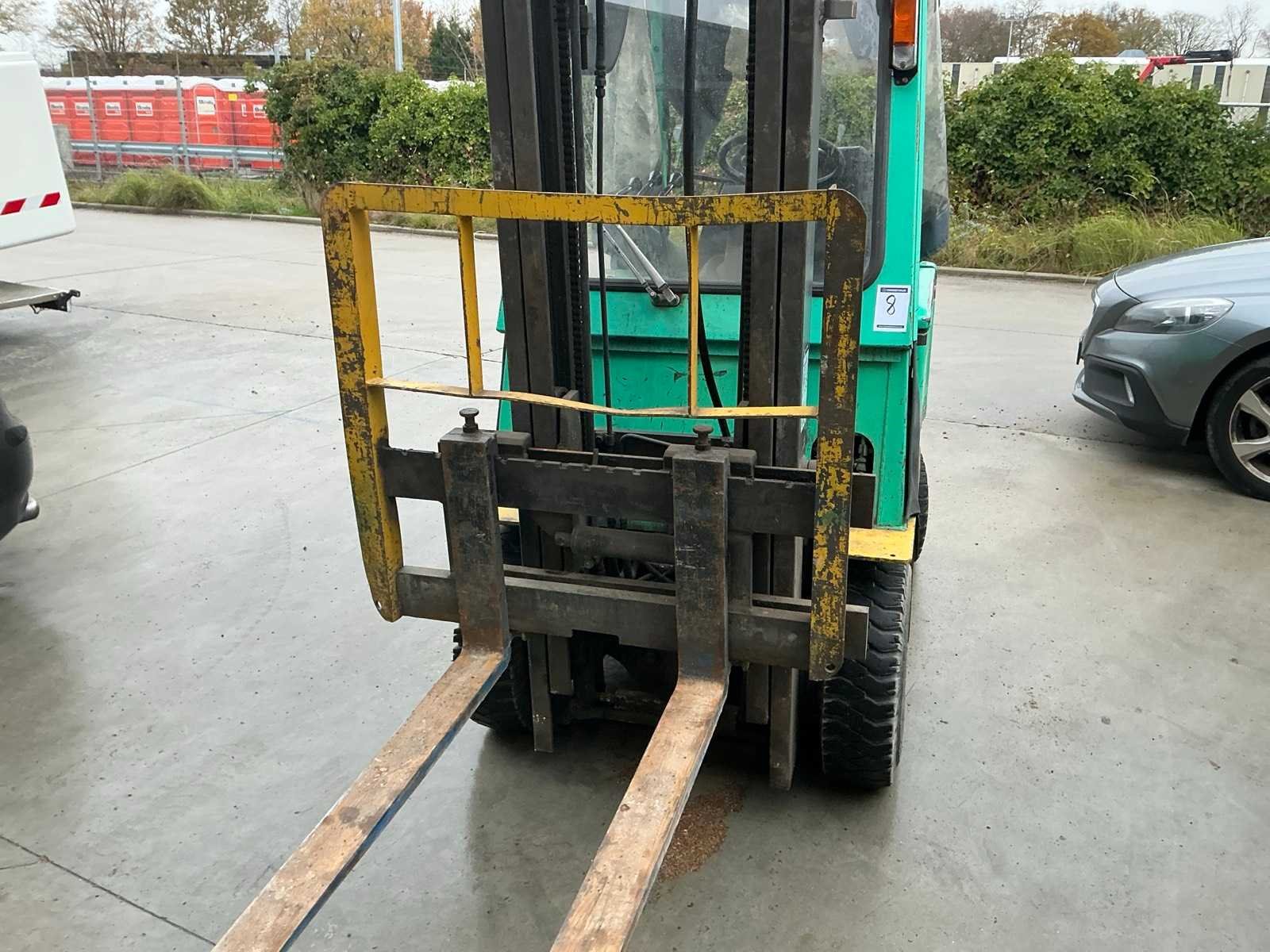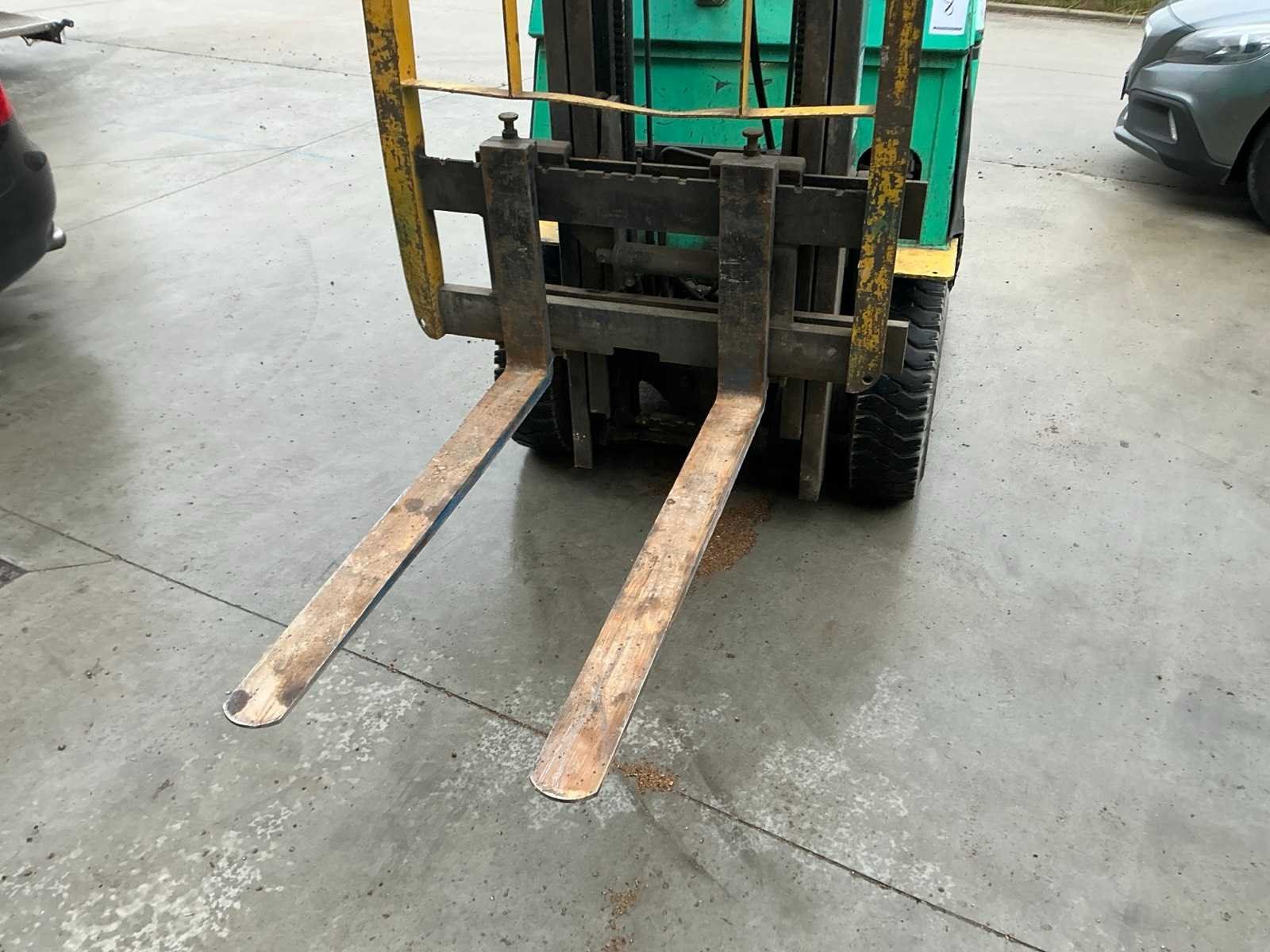 Merk: Mitsubishi Side-shift: true Type: FB15 Hefvermogen: 1500 Eigen gewicht: 2900 Mast: Duplex Totale afmeting Hoogte: 2100 Hefhoogte: 3000 Soort band: Luchtbanden Lepellengte: 1150 Brandstof: Elektrisch Totale afmeting L: 2100 Duplex mast: true Aantal wielen: 4 Luchtbanden: true Totale afmeting Breedte: 1100 Serienummer: FB1-50152 Accu lader: true Voorzien van semi gesloten cabine, oplader Energie Plus type RTC 48-80A Merk: Mitsubishi Type: FB15 Brandstof: Elektrisch Mast: Duplex Soort band: Luchtbanden Aantal wielen: 4 Afgelezen urenstand: 5391 Accu lader: true Duplex mast: true Eigen gewicht: 2100kg Lepellengte: 1060mm Max. hefhoogte: 3000mm Luchtbanden: true