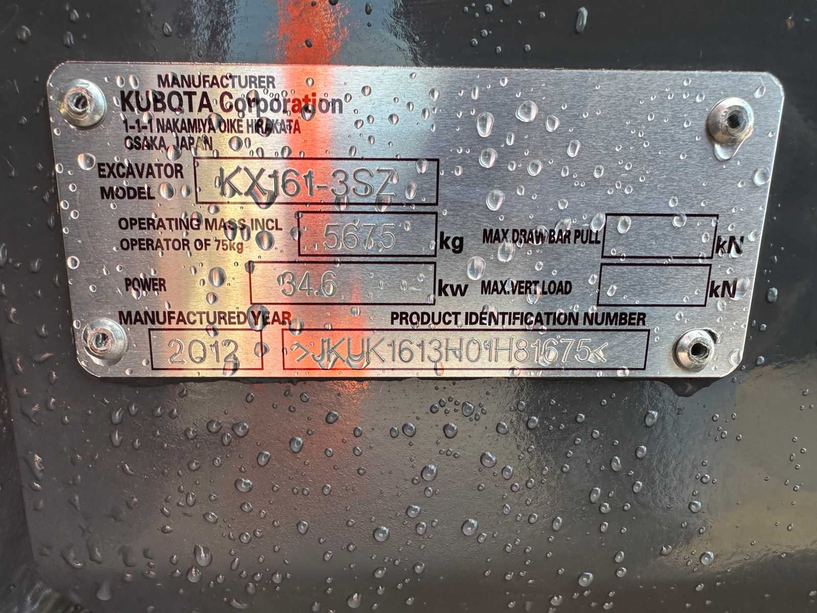 Hamerleidingen Mechanische snelwissel Tandenbak Duwblad Stalen rupsen met rubber pads Geen documenten Merk: Kubota Type: KX161-3SZ Bouwjaar: 2012 Serienummer: H81675 Merk motor: Kubota V2403 Motorvermogen (kW): 34.6kW Aantal cilinders: 4 Brandstof: Diesel Graafbak afm. b: 650mm Rups breedte: 400mm Afgelezen urenstand: 4154 Eigen gewicht: 5675kg Totale afmeting L: 5600mm Totale afmeting Breedte: 2050mm Totale afmeting Hoogte: 2700mm GS Code: 8429521200