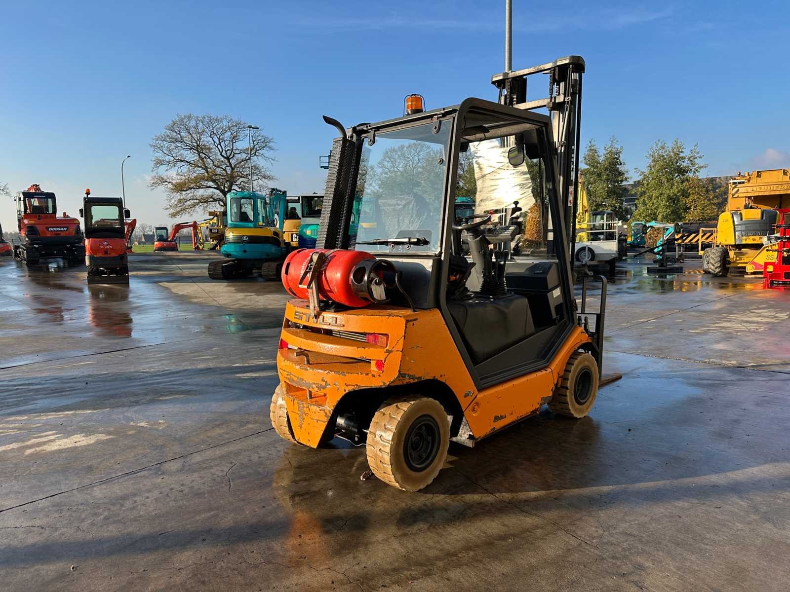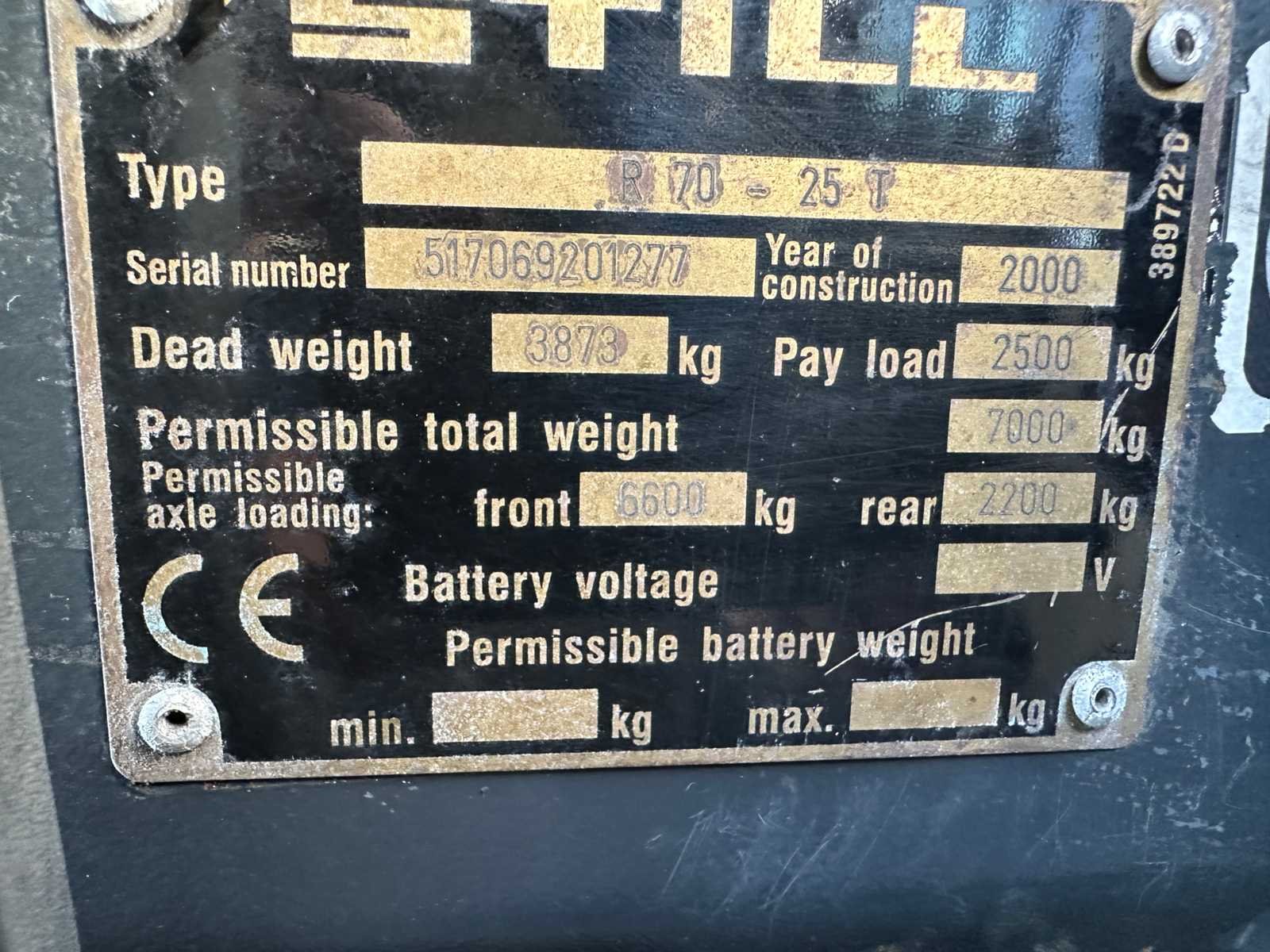 Side Shift Geen documenten Merk: Still Type: R70-25T Bouwjaar: 2000 Serienummer: 517069201277 Brandstof: LPG Aantal wielen: 4 Side-shift: true Duplex mast: true Eigen gewicht: 3873kg Hefvermogen: 2500kg Lepellengte: 1100mm Max. hefhoogte: 3320mm Vol rubber banden: true Totale afmeting L: 2520mm Totale afmeting Breedte: 1200mm Totale afmeting Hoogte: 2100mm LPG: true