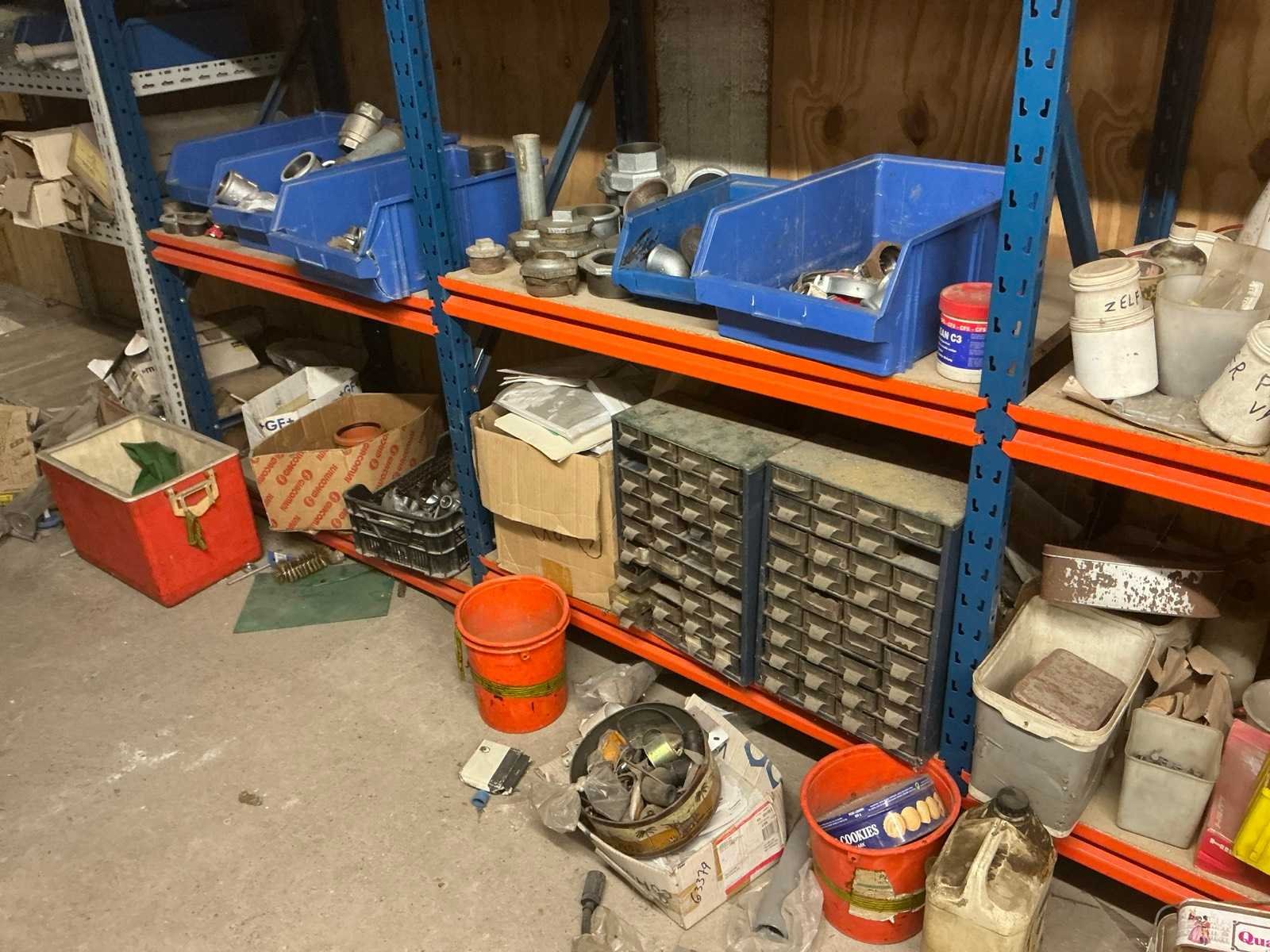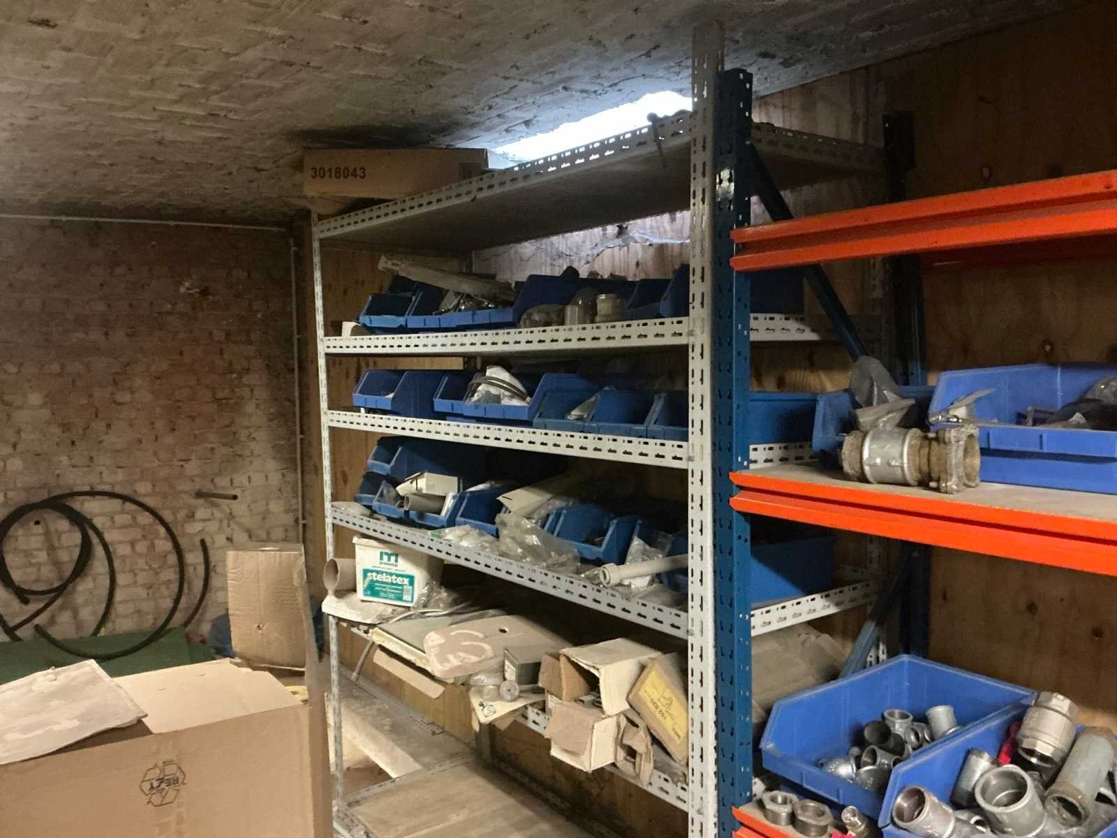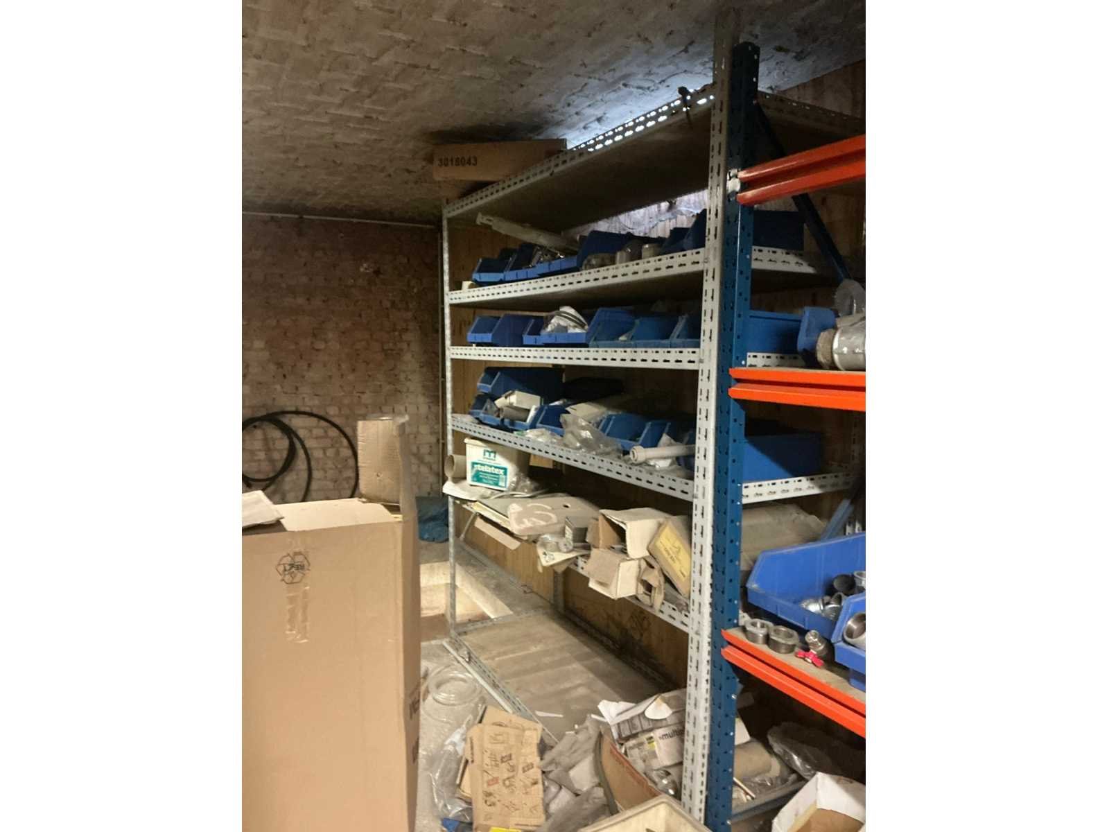 Zich bevindend op het eerste verdiep Compleet met opbergrek met inhoud, met afmetingen ca. 182 x 63 x 220cm. Met inhoud (zie foto’s ter specificatie). Door koper te demonteren. Aantal staanders: 4 Aantal liggers: 24 Totale afmeting L: 940cm Totale afmeting Breedte: 60cm Totale afmeting Hoogte: 180cm Lengte: 370cm Breedte: 60cm Hoogte: 215cm