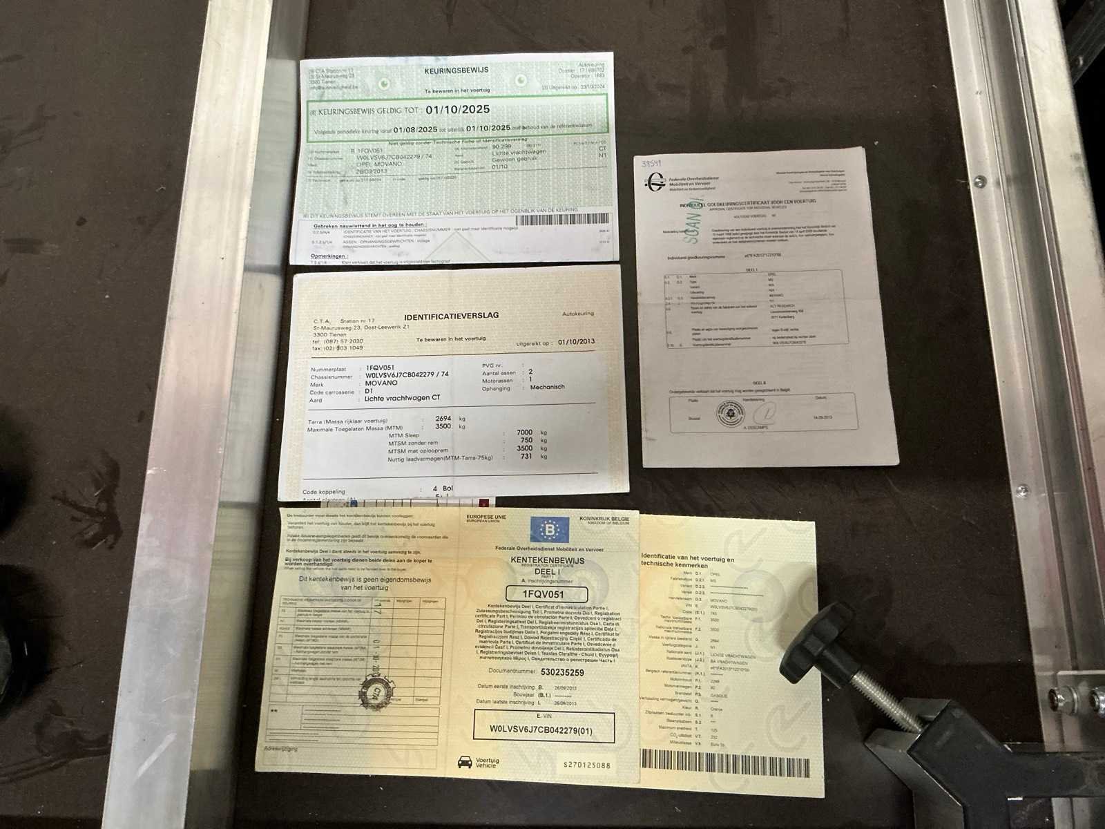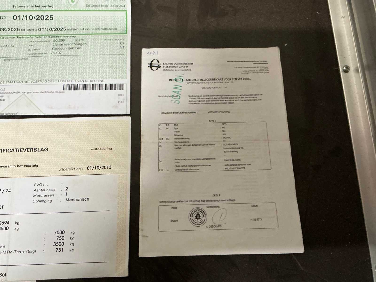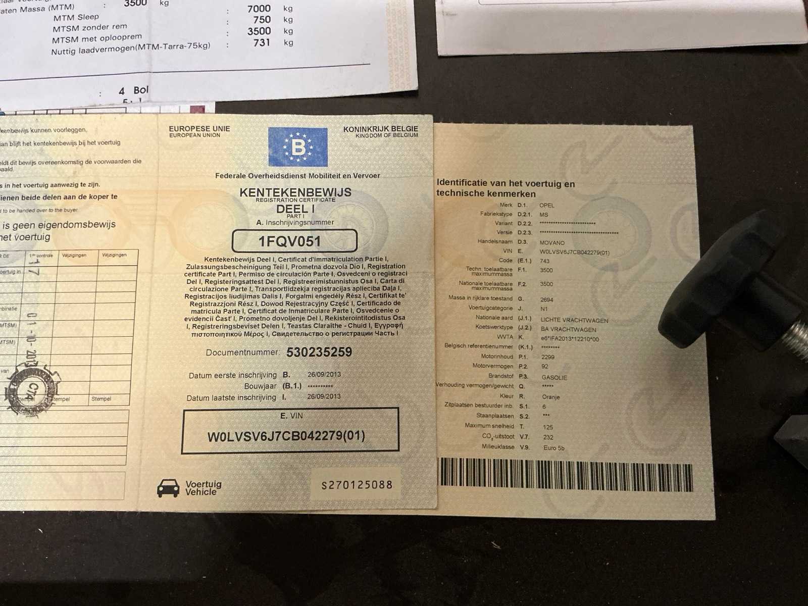 Voorzien van hydraulische kantelbare laadbak Merk: Opel Model: Movano Bouwjaar: 2013 Afgelezen kilometerstand: 93190km Cilinderinhoud: 2299cc Vermogen (kW): 92kW Brandstof: diesel Chassisnummer: W0LVSV6J7CB042279 Datum eerste toelating: 26/09/2013 Transmissie: Handgeschakeld Emissieklasse: Euro 5b Aantal sleutels: 2 Nationaliteit documenten: België Gelijkvormigheidsattest aanwezig: true Start en rijdt: Ja Keuringsrapport geldig tot: 01/10/2025 Andere boorddocumenten: ID verslag Vavato voert geen technische keuring uit.: true Inschrijvingsbewijs - deel 1 : Aanwezig Inschrijvingsbewijs - deel 2: Aanwezig