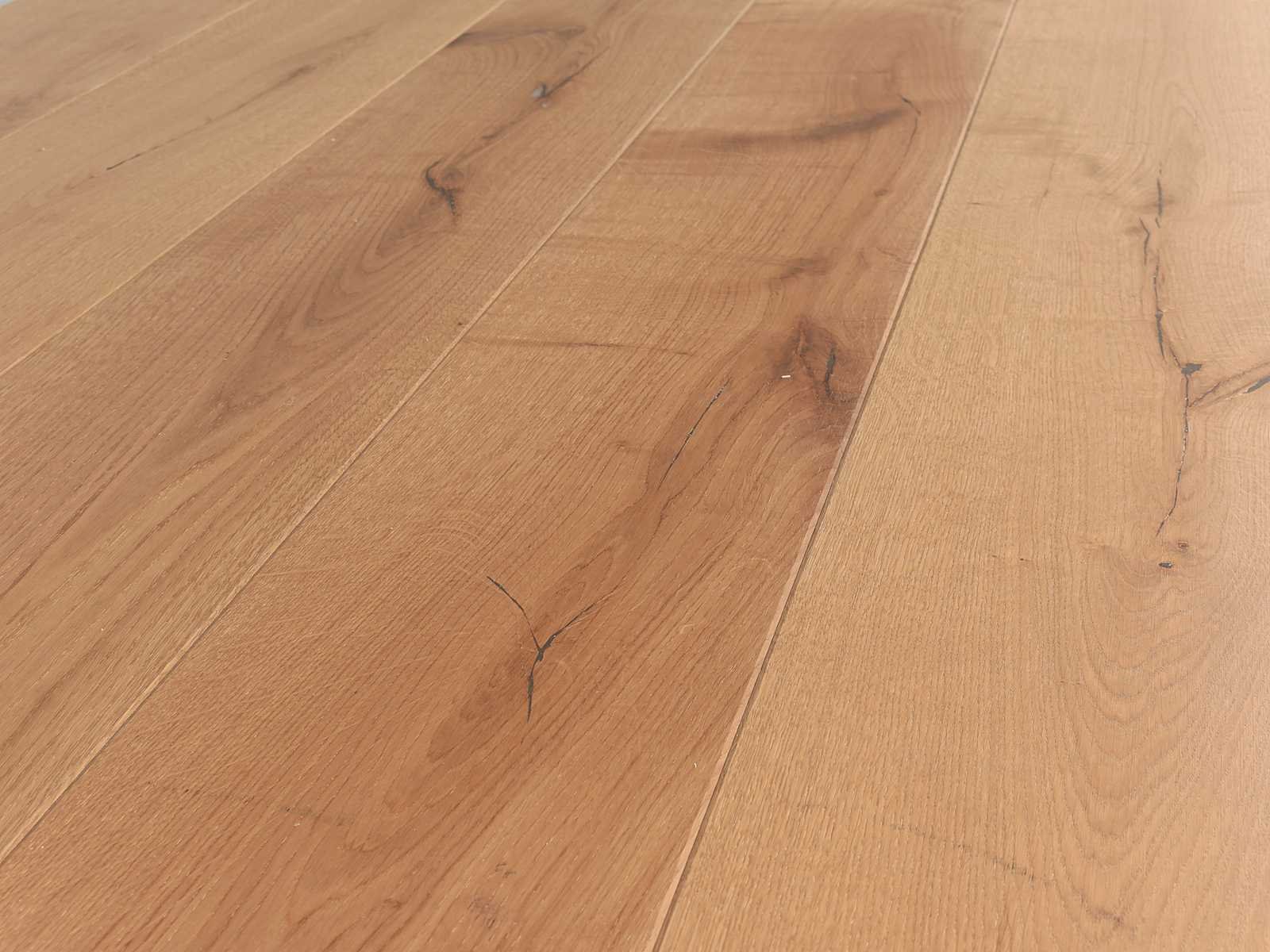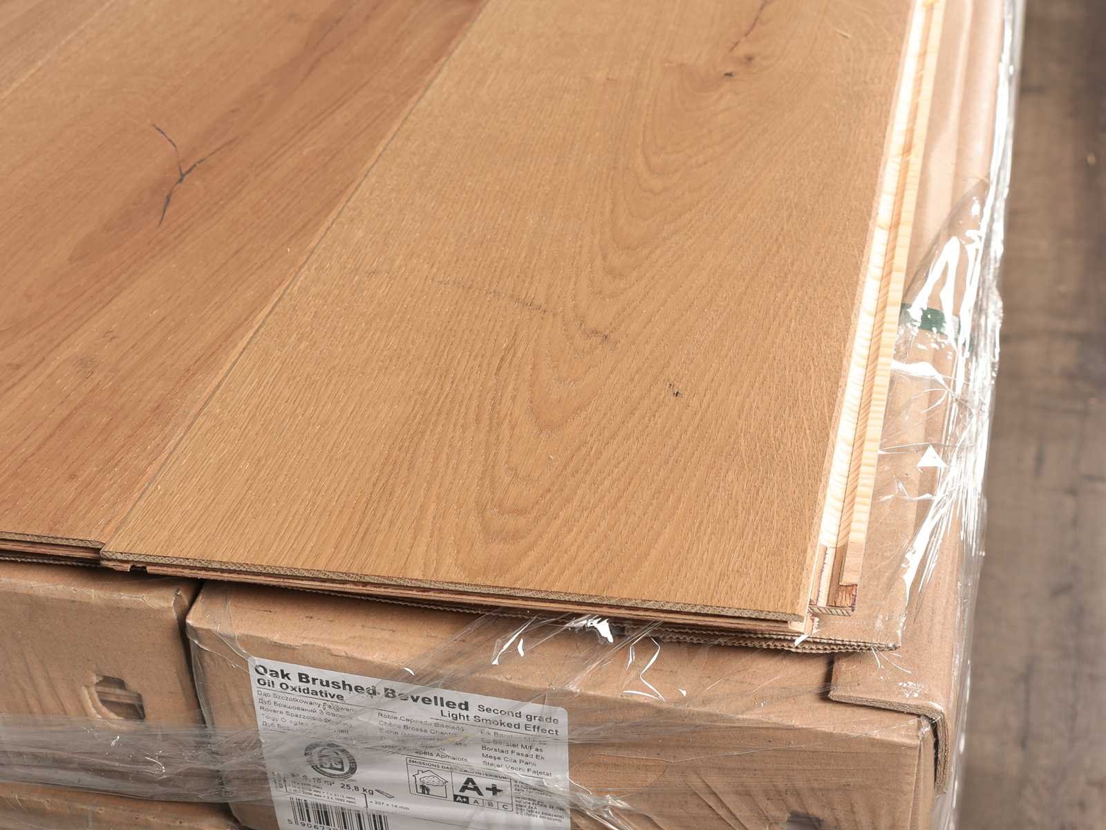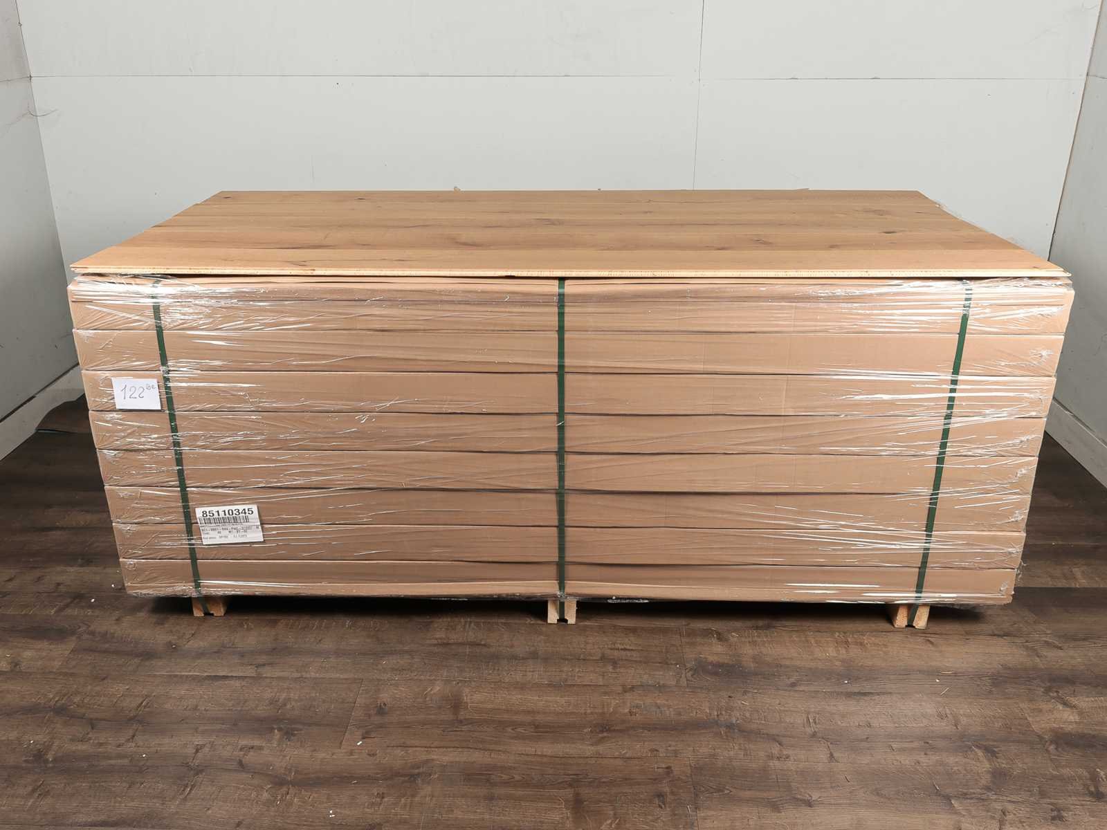 Gemakkelijk te leggen wegens 5G clicksysteem, geschikt voor alle soorten vloer en koelverwarmingen, kwaliteits parketvloer, vloer is van hoogwaardig Europees eiken hout, kant en klaar behandeld, dikte 14 mm, toplaag 3 mm, 39 pakken a 3,18 m2 Merk: Ambiance Product type: Parket Oppervlakte: 124m² Geschikt voor vloerverwarming: Ja V-groef: Ja Afwerking: Geolied, geoxideerd, geborsteld, met v-groef Aantal m² per verpakking: 3.18m² Kleur: Light smoked effect 354 Gewicht: 1015kg Lengte: 2200mm Breedte: 207mm Materiaal: Eiken multiplank