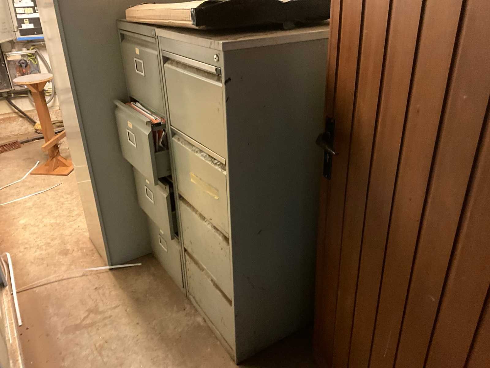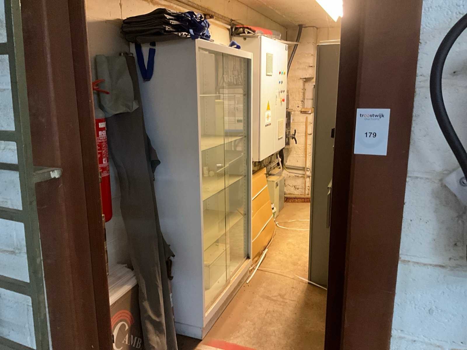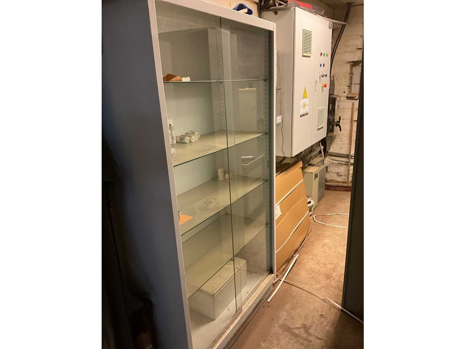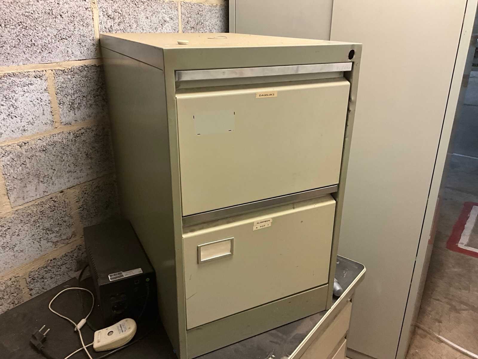 Waaronder 2 ladekasten met elk 4 schuiflades, vitrinekast met EHBO materiaal, draagbed, divers promo materiaal, metalen dossierkast, bureau,