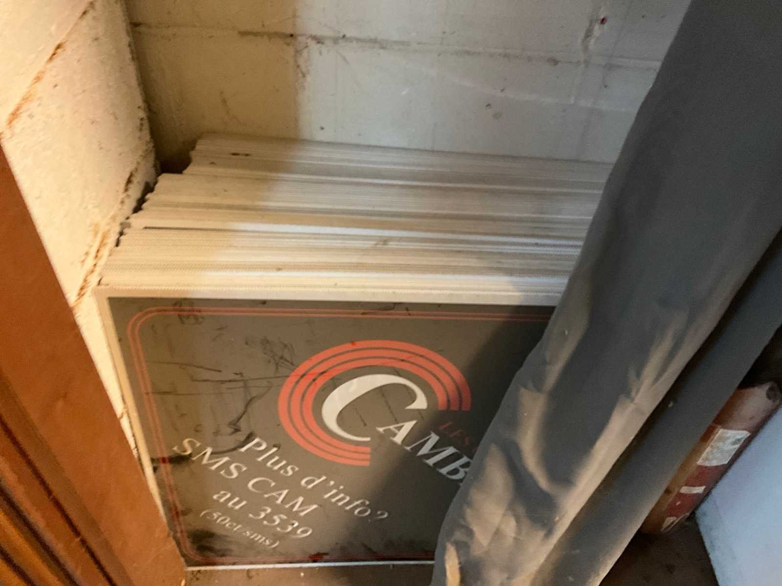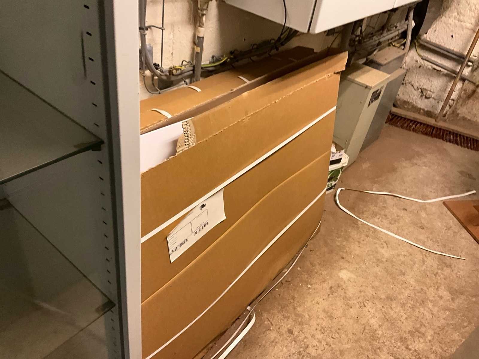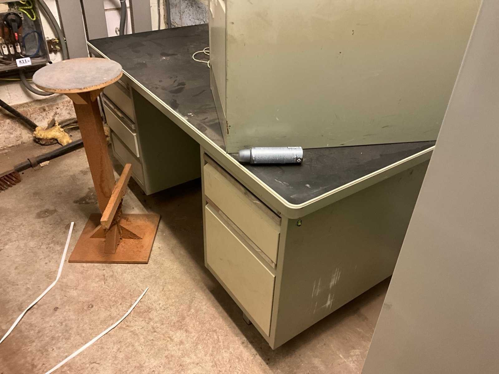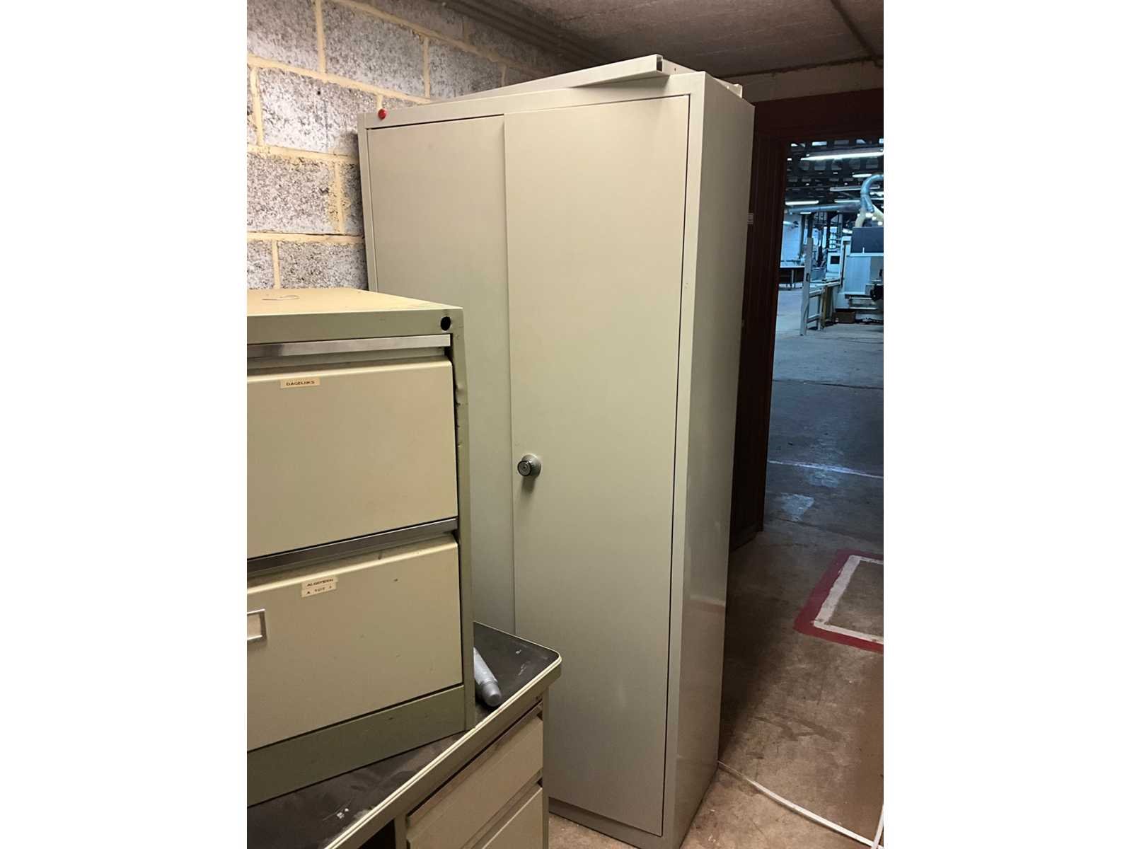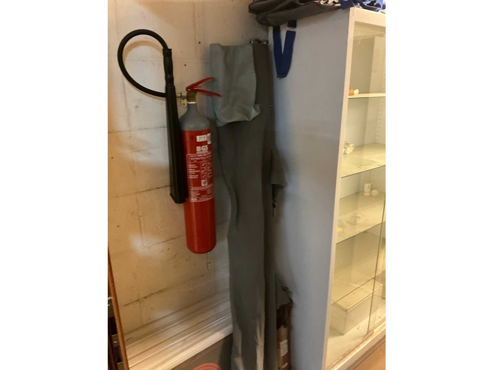 Waaronder 2 ladekasten met elk 4 schuiflades, vitrinekast met EHBO materiaal, draagbed, divers promo materiaal, metalen dossierkast, bureau,