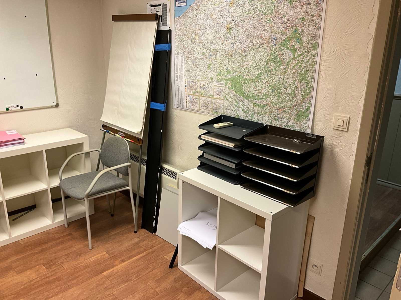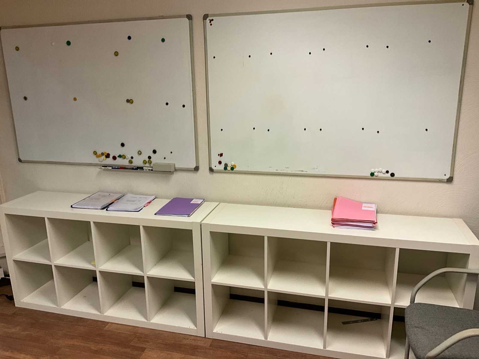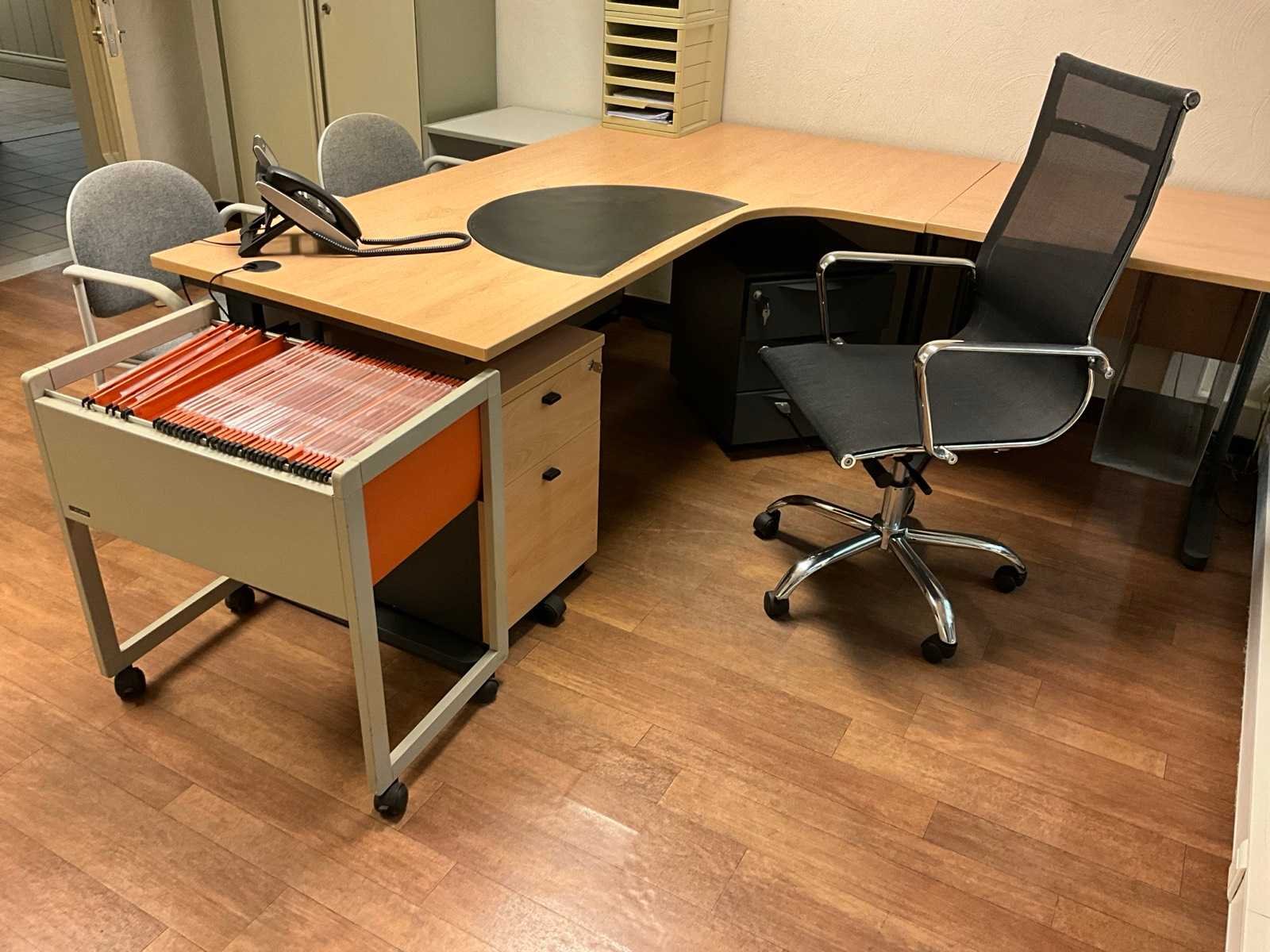 Volledige inhoud van kantoorruimte, waaronder bestaande uit: Een fineer houten hoekbureau voorzien van metalen onderstel ca 200 x 200cm, 1 chrome typistestoel voorzien van stoffen bekleding, 3 bijzetstoelen voorzien van stoffen bekleding, 2 diverse ladenblokken, 2 Kallax kasten 2x4 vakken, 1 Kallax kast voorzien van 2x2 vakken 2 magnetische whiteboards ca 150 x 100cm, 1 metalen dossierkast voorzien van 2 deuren - hoog model, 1 verrijdbaar hangdossierrekje, 1 elektrische papierversnipperaar, 2 diverse metalen organizers Bisley en 1 flipchart Junénilia, Uitgezonderd telefoontoestel en router, Afgifte volgens aanwijzing Model: Volledig resterende inhoud