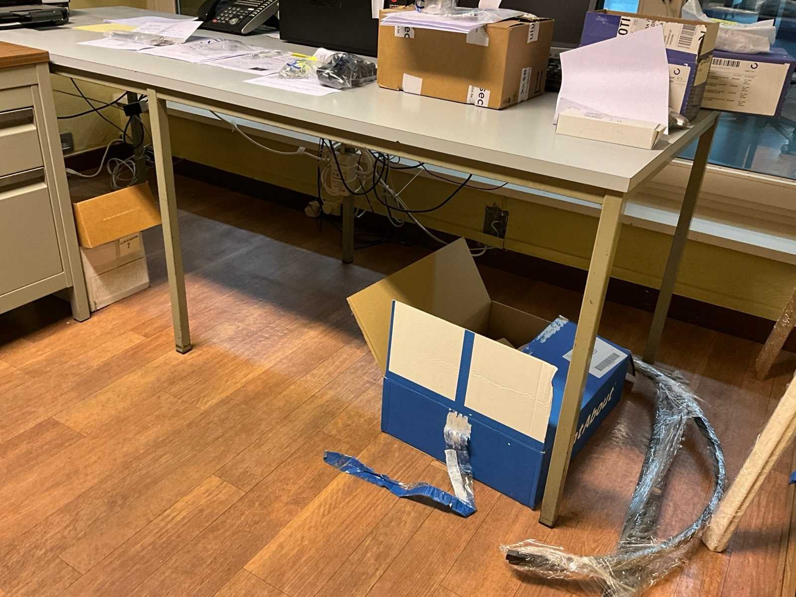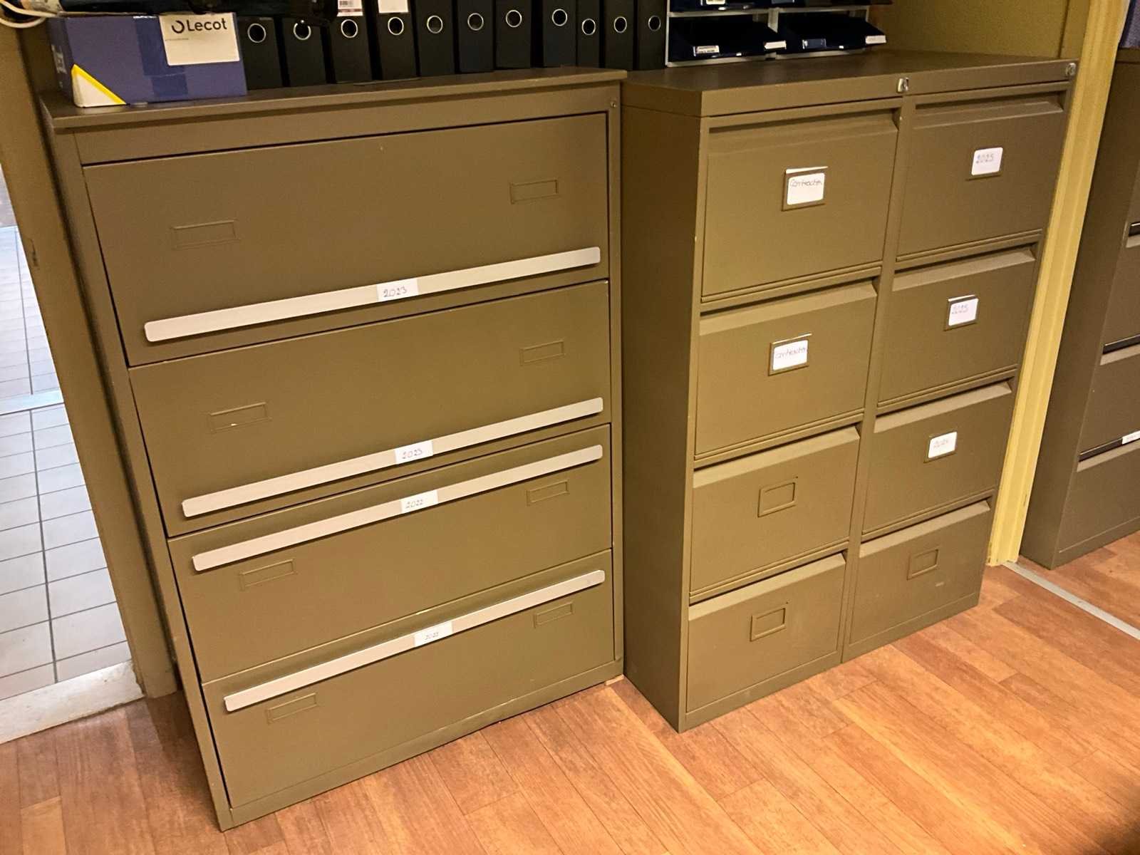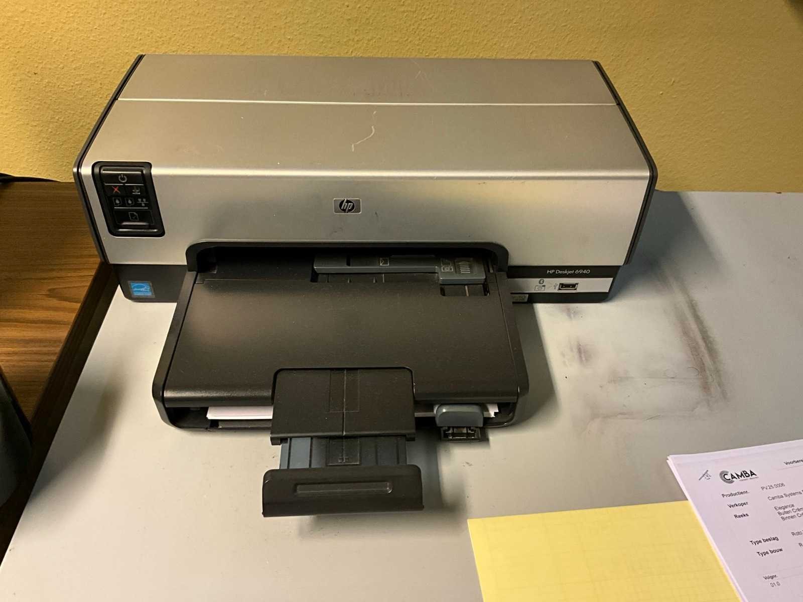 Volledige inhoud van kantoorruimte, waaronder bestaande uit: een metalen bureau voorzien van een fineerhout bovenblad en twee vaste lade blokken, ca 150 x 75cm, 1 stoffen typistestoel, 1 fineer houten schrijftafel voorzien van metaal onderstel ca 220 x 80cm, 2 metalen ladenkasten voor hangdossiers ca 47 x 71 x 134cm, 1 metalen ladenkast voor hangdossiers ca 92 x 51 x 135cm, 1 all-in-one printer HP, 1 printer HP DeskJet 6940 en 1 17” tft-scherm Philips I75, Uitgezonderd telefoontoestel en server met toebehoren, Afgifte volgens aanwijzing Model: Volledig resterende inhoud