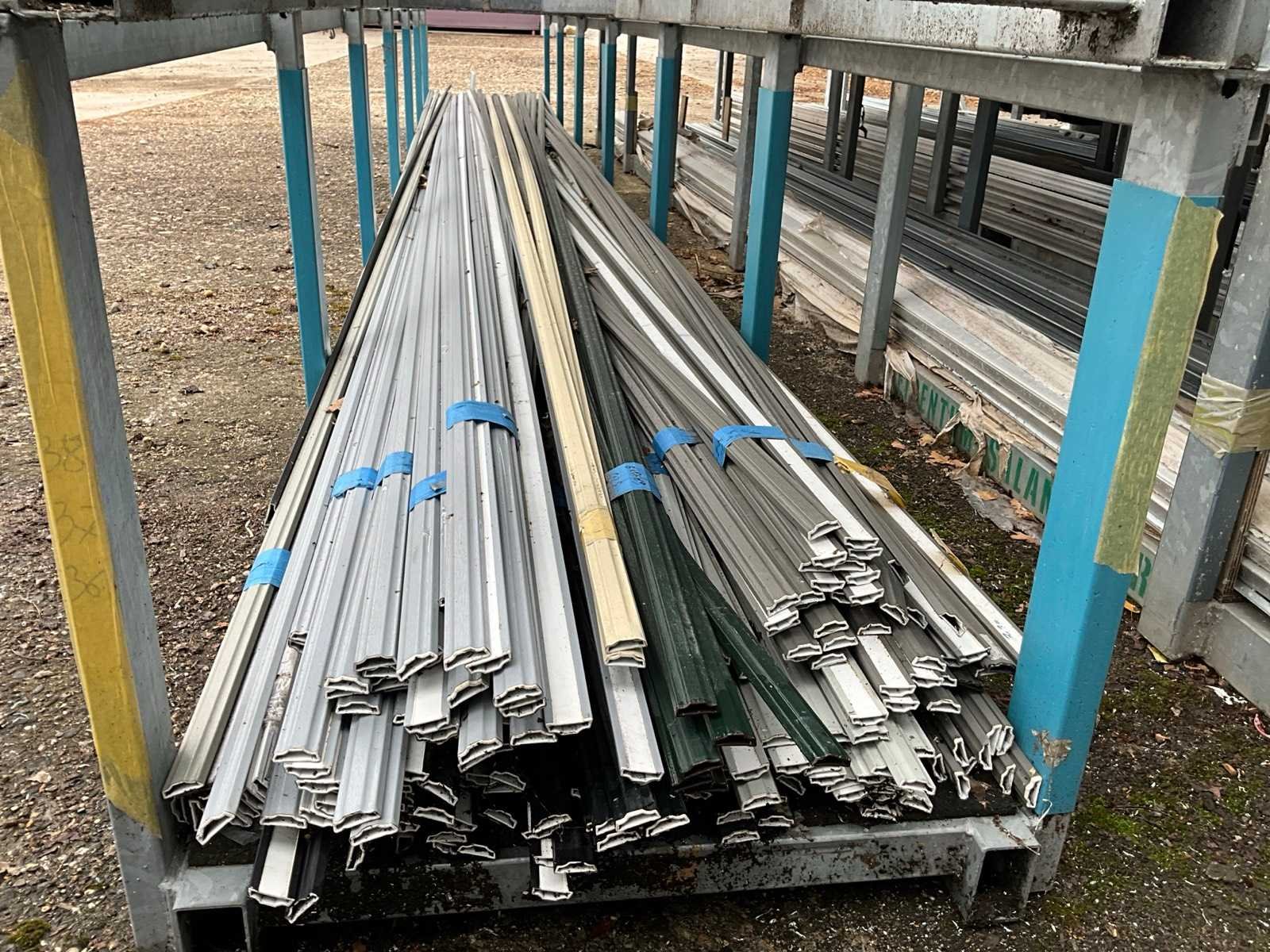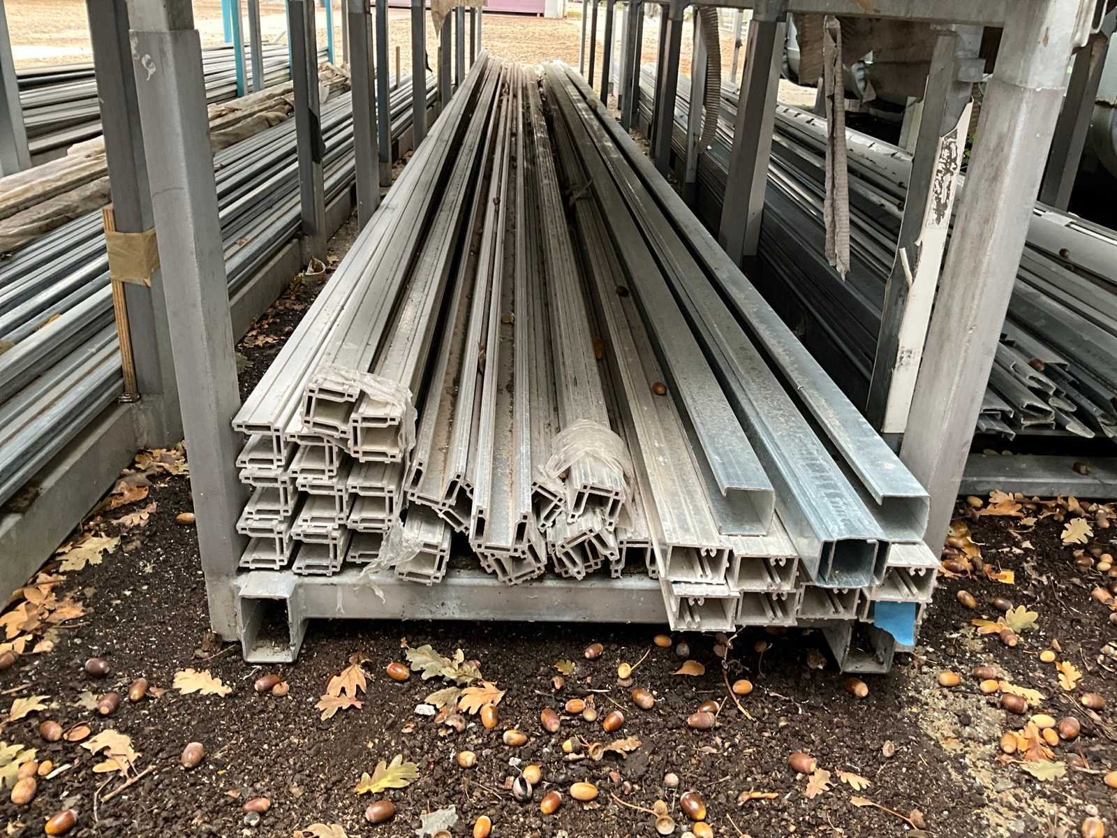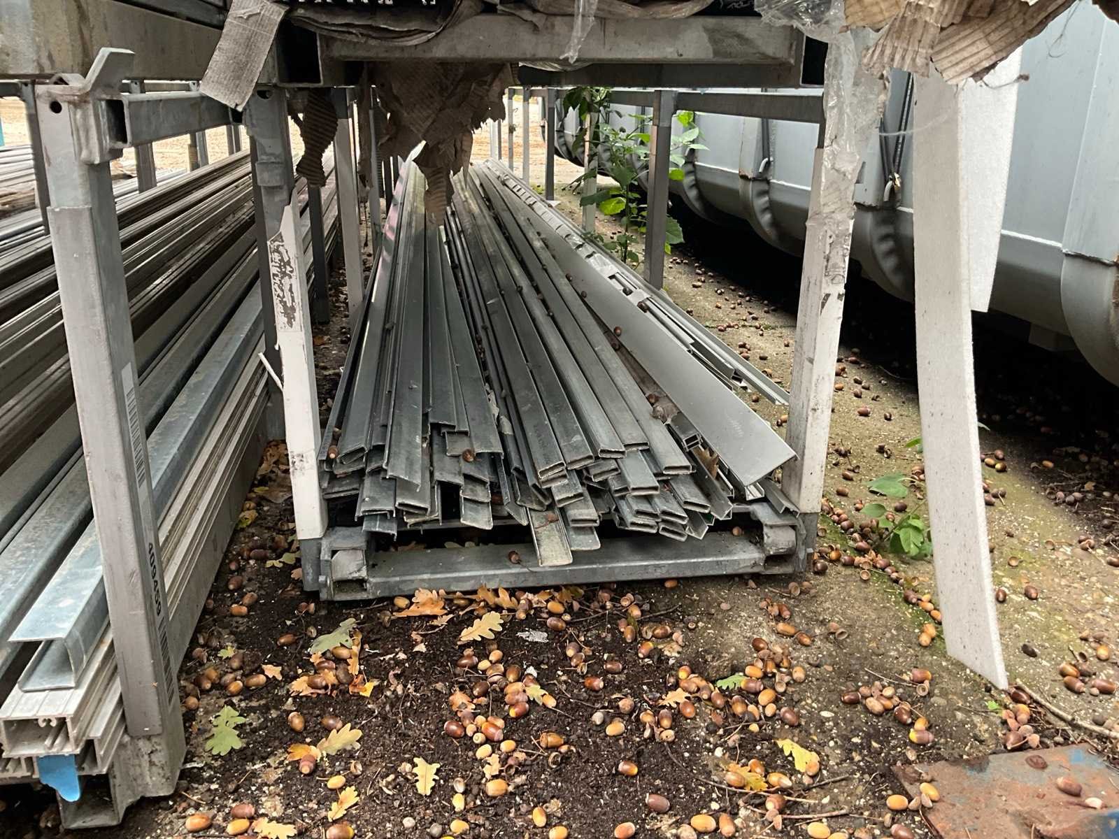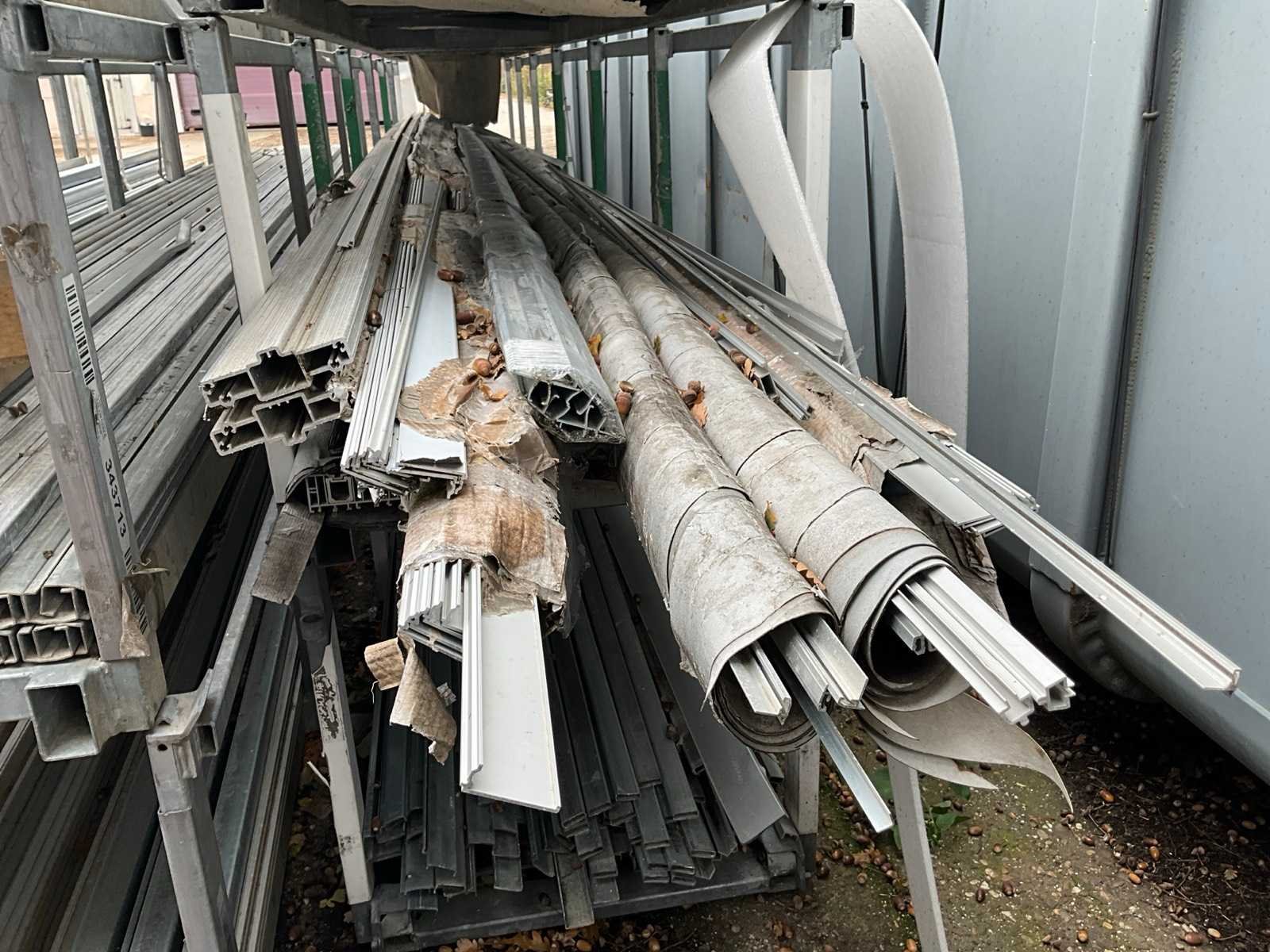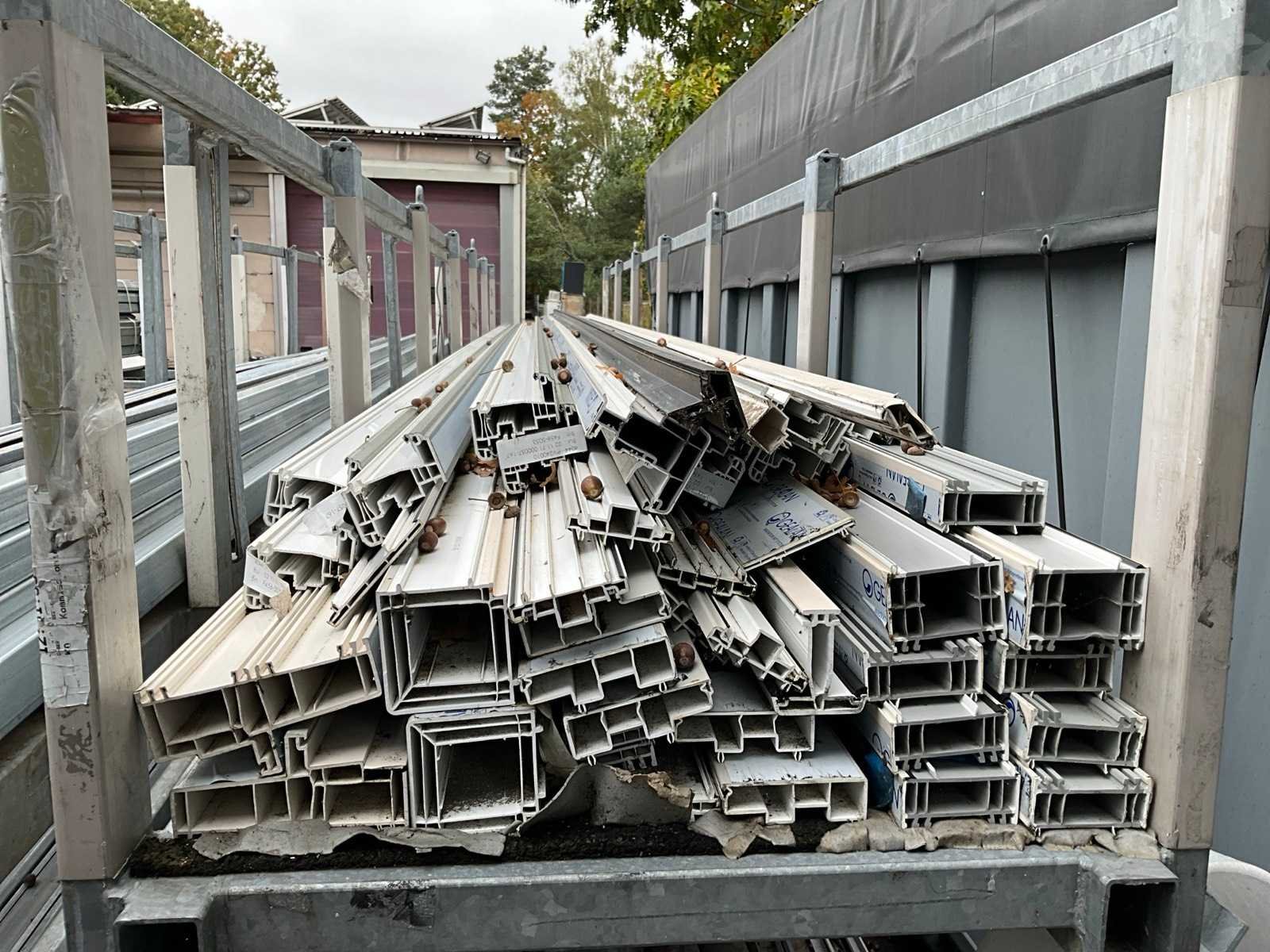 Zijnde kunststof en metalen profielen voor raam en deurproduktie, diverse afmetingen en uitvoeringen gestapeld in 11 langmateriaal containers