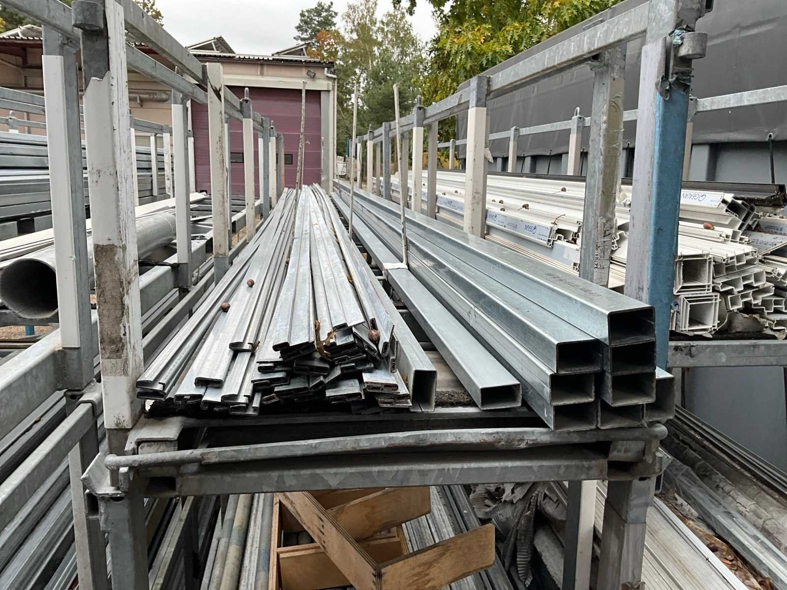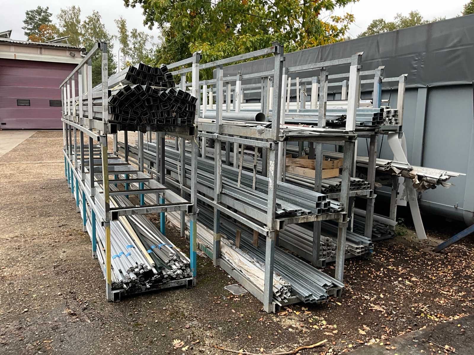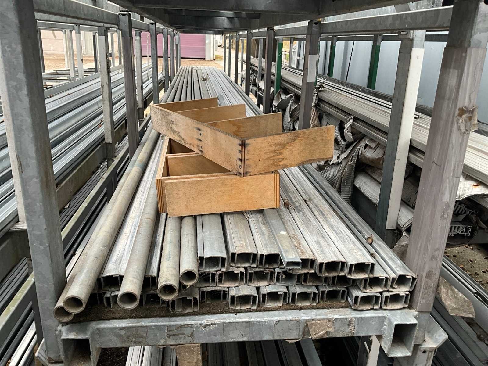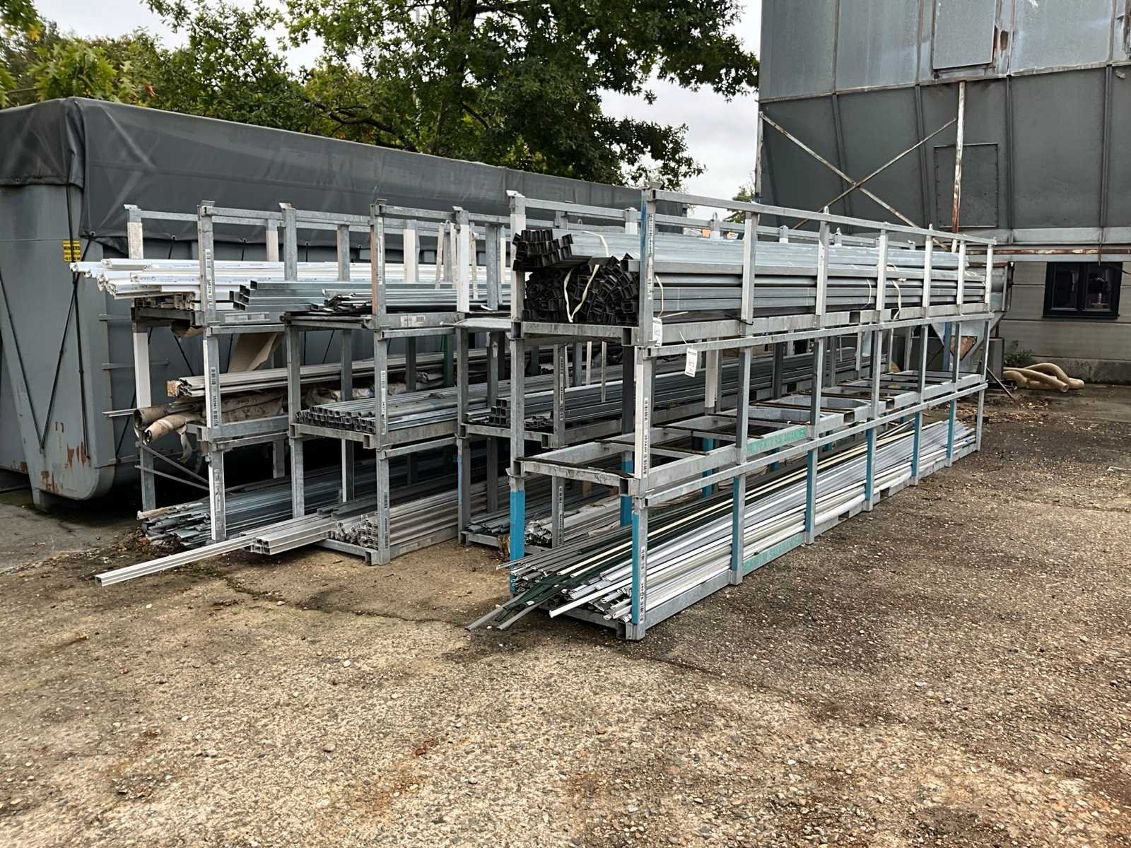 Zijnde kunststof en metalen profielen voor raam en deurproduktie, diverse afmetingen en uitvoeringen gestapeld in 11 langmateriaal containers