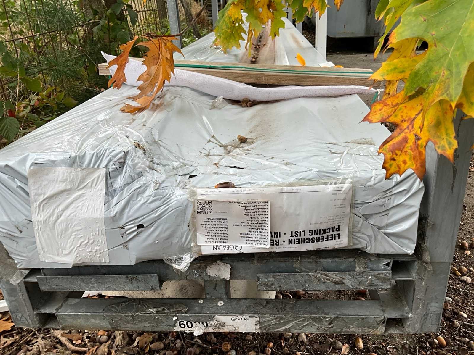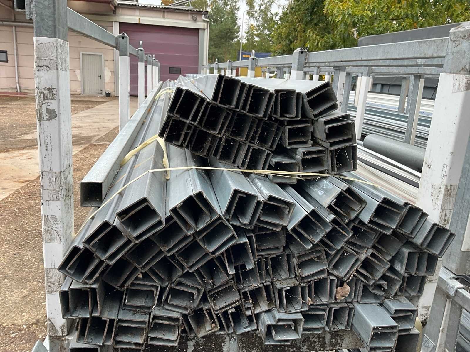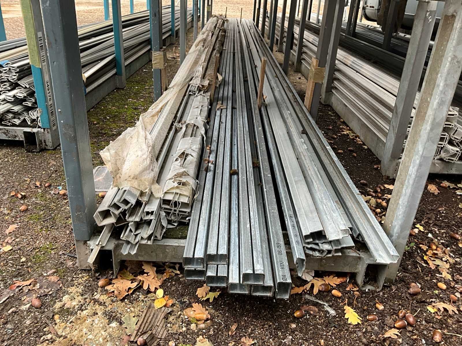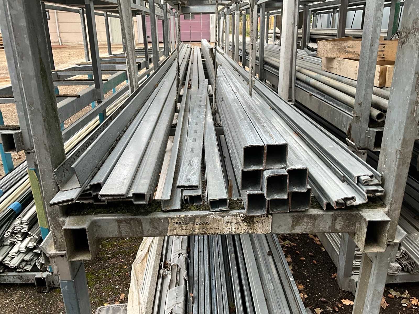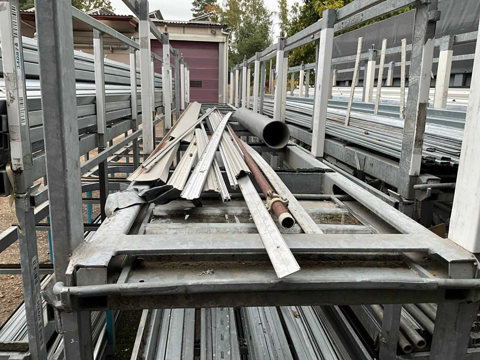 Zijnde kunststof en metalen profielen voor raam en deurproduktie, diverse afmetingen en uitvoeringen gestapeld in 11 langmateriaal containers