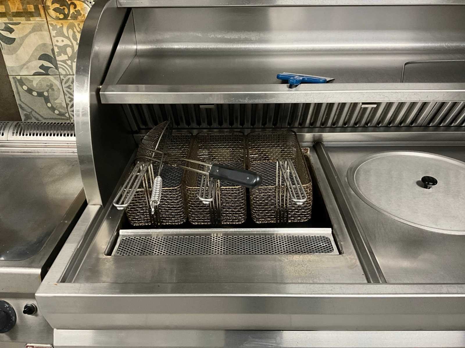 Voorzien van 3x bakzone rond + 1x bakzone met 3x mandje, 4x digitale instelling, afzuiging met buizen en motor inclusief, 3x afsluitdeksel diameter 46 cm, frituurvet reeds verwijderd Merk: Perfecta Bouwjaar: 2017 Type: PVR S3 Lengte: 100cm Breedte: 240cm Hoogte: 160cm Materiaal: RVS Aantal zones: 4 Vermogen (kW): 18 Spanning: 220 Gas: true