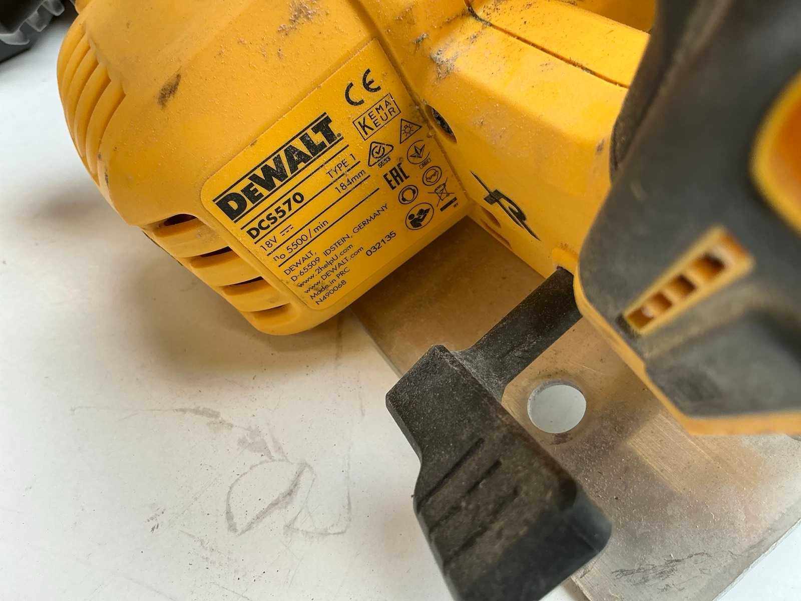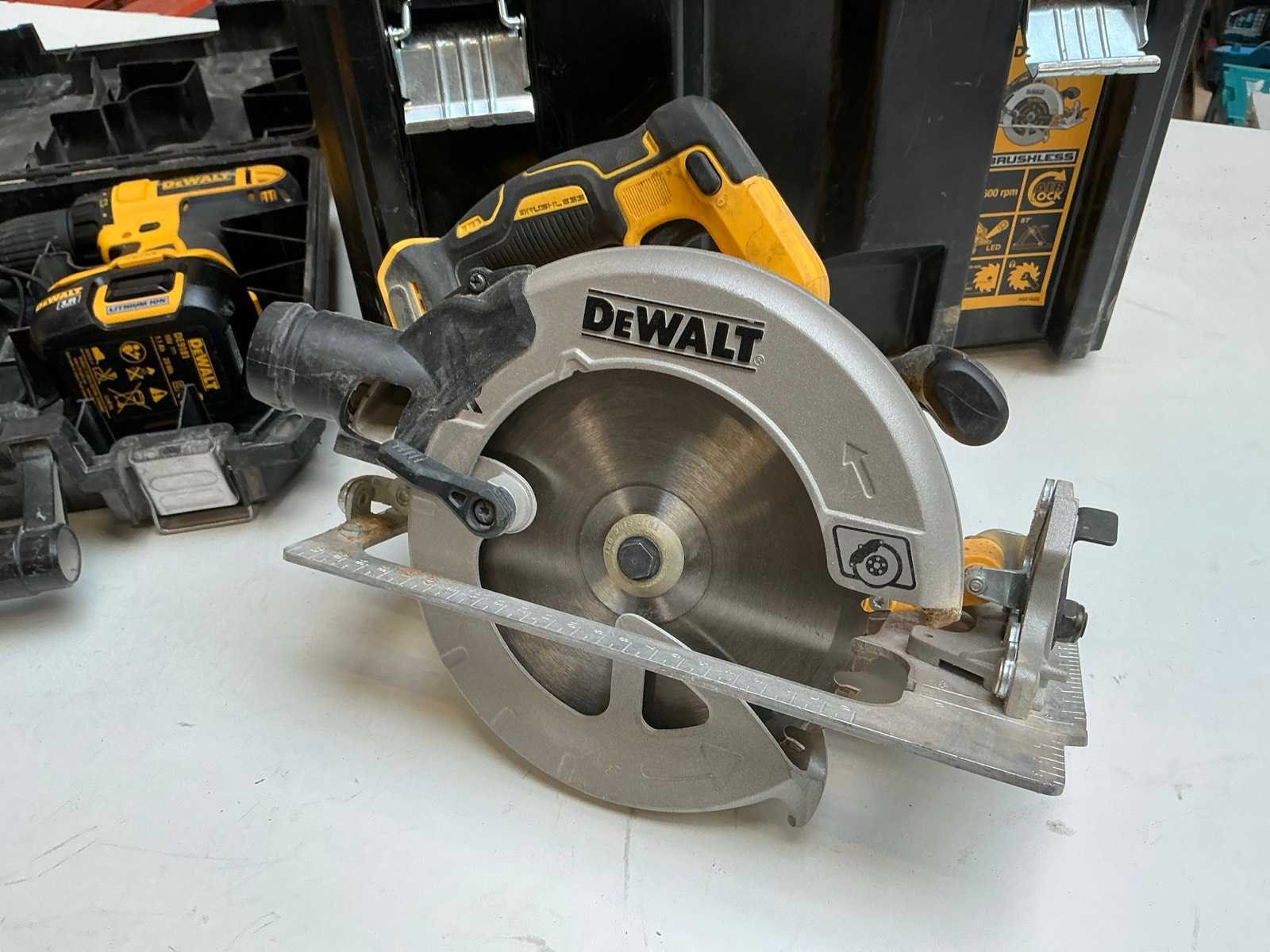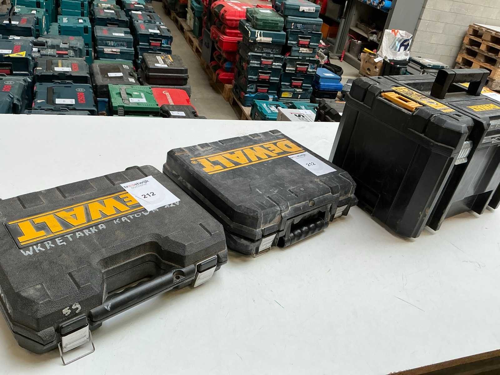 Zijnde: - DCS570 cirkelzaag Ø184mm, zonder accu/lader, s/n 032135 - DC722 schroefboormachine, met 2x18V-accu en lader, s/n 167462 - Haakse schroefmachine, met 1x12V-accu en lader, s/n 046191 Met koffer: true