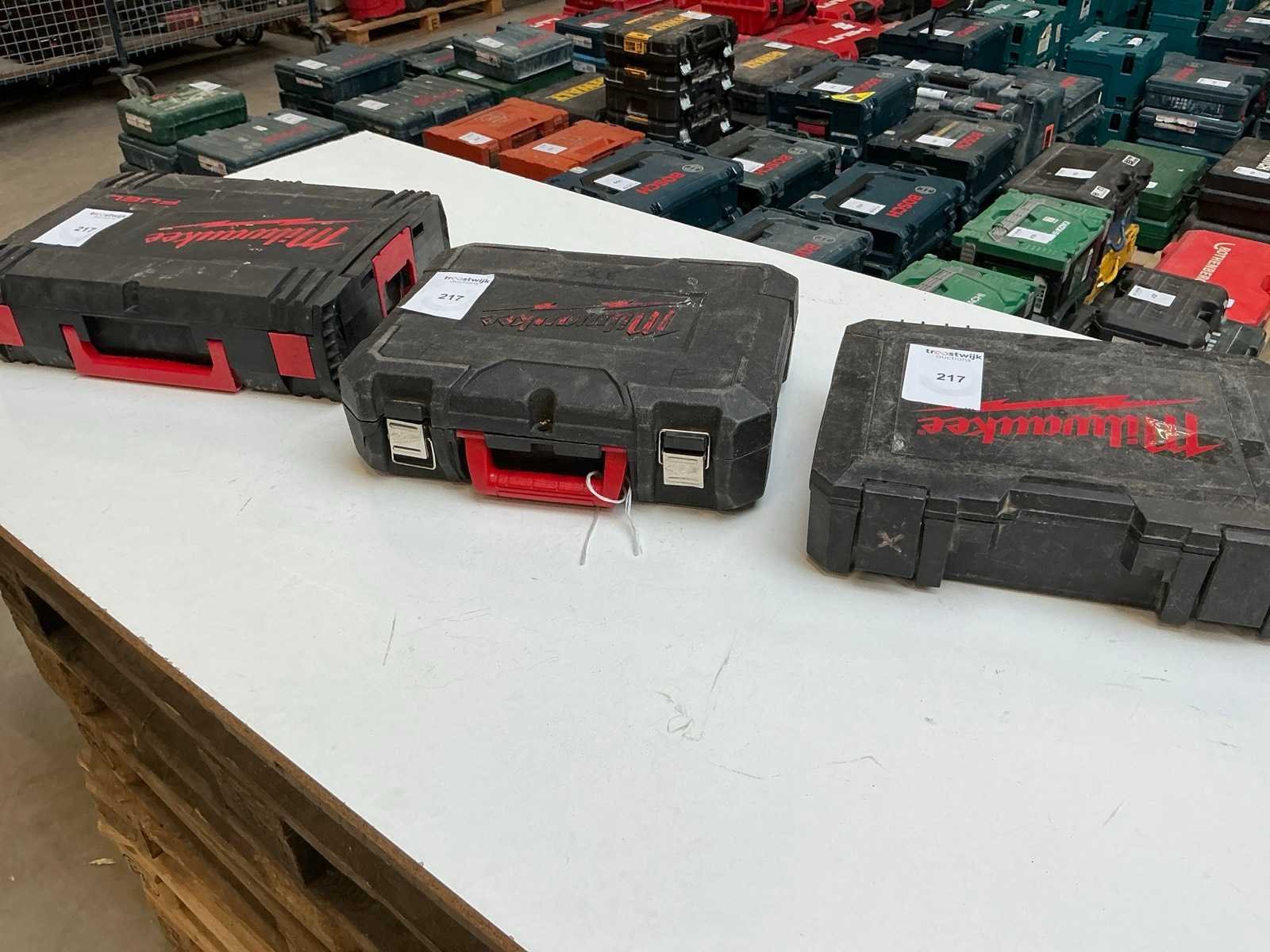 Zijnde: - V28 JSB decoupeerzaag, met 1x 28V-accu, geen lader, s/n 10535, in koffer - M18 FSG gipsplaat schroefmachine, met opzetstuk, met 2x 18V-accu en lader, in koffer - M18 BPD schroefboormachine, zonder accu en M18 BID schroefmachine, zonder accu; in totaal met 1 lader; samen in 1 koffer Merk: Milwaukee