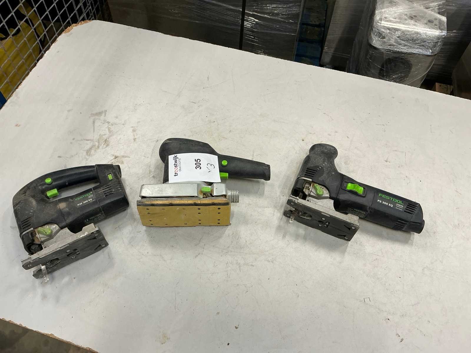<Br> - Decoupeerzaag type PS300EQ, S/N 13610982. - Decoupeerzaag type PSB300EQ, M. NR. 180171/2003. - Schuurmachine type RS300EQ, S/N 10429334. - zonder voedingskabels. Merk: Festool Aansluiting: 230V