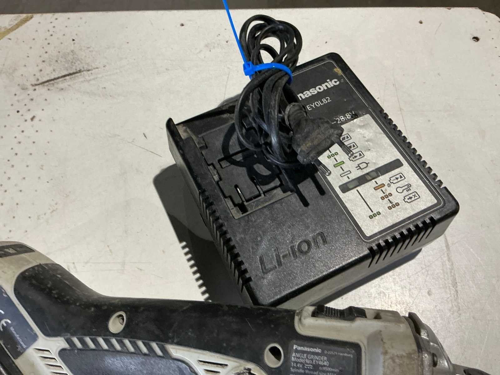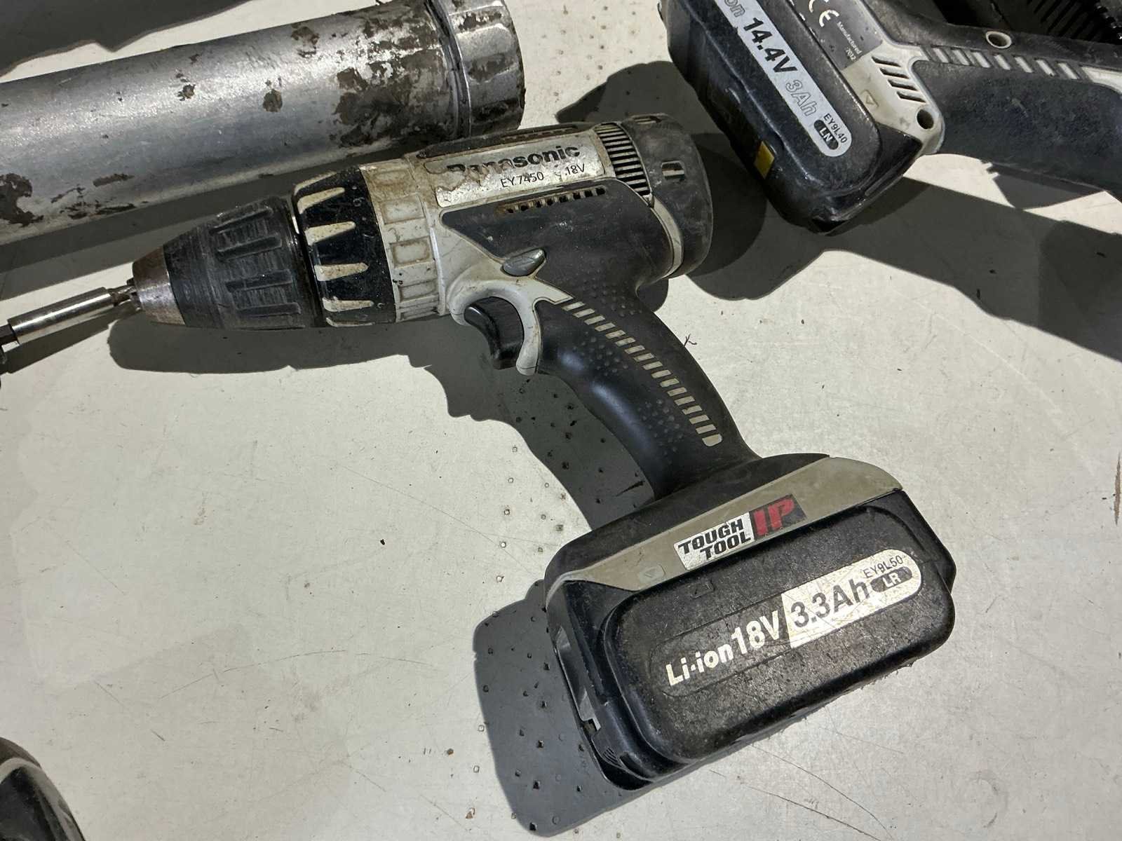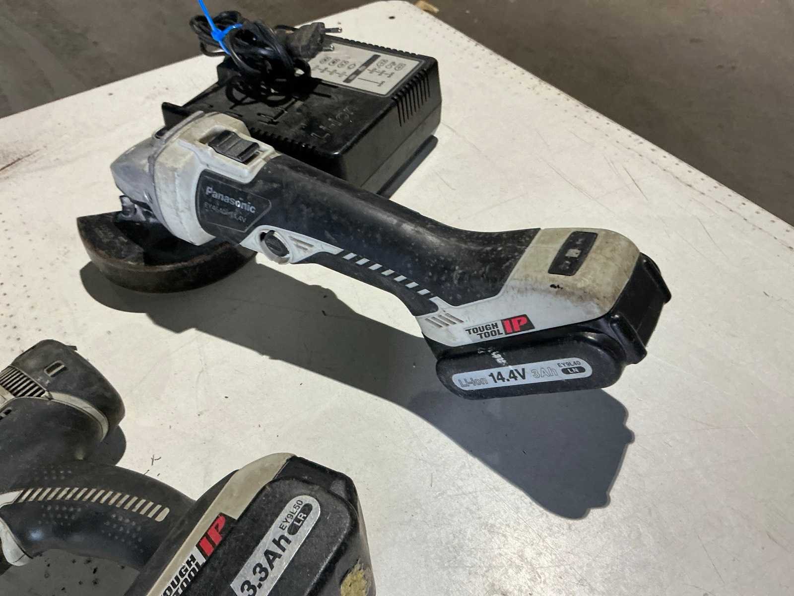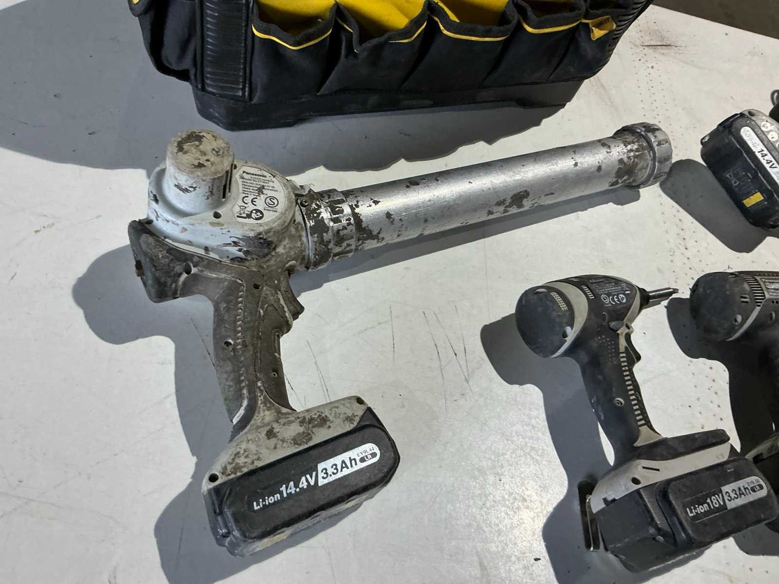 Zijnde 1 set bestaande uit 1x EY4640 haakse slijpmachine, s/n 1210; 1x EY7450 schroefboormachine; 1x EY7550 schroefboormachine; 1x EY3641 silicone pistool; in totaal met 2x 18V-accu, 2x 14,4V-accu, 1 lader; inclusief 1 DeWalt draagkoffer Merk: Panasonic