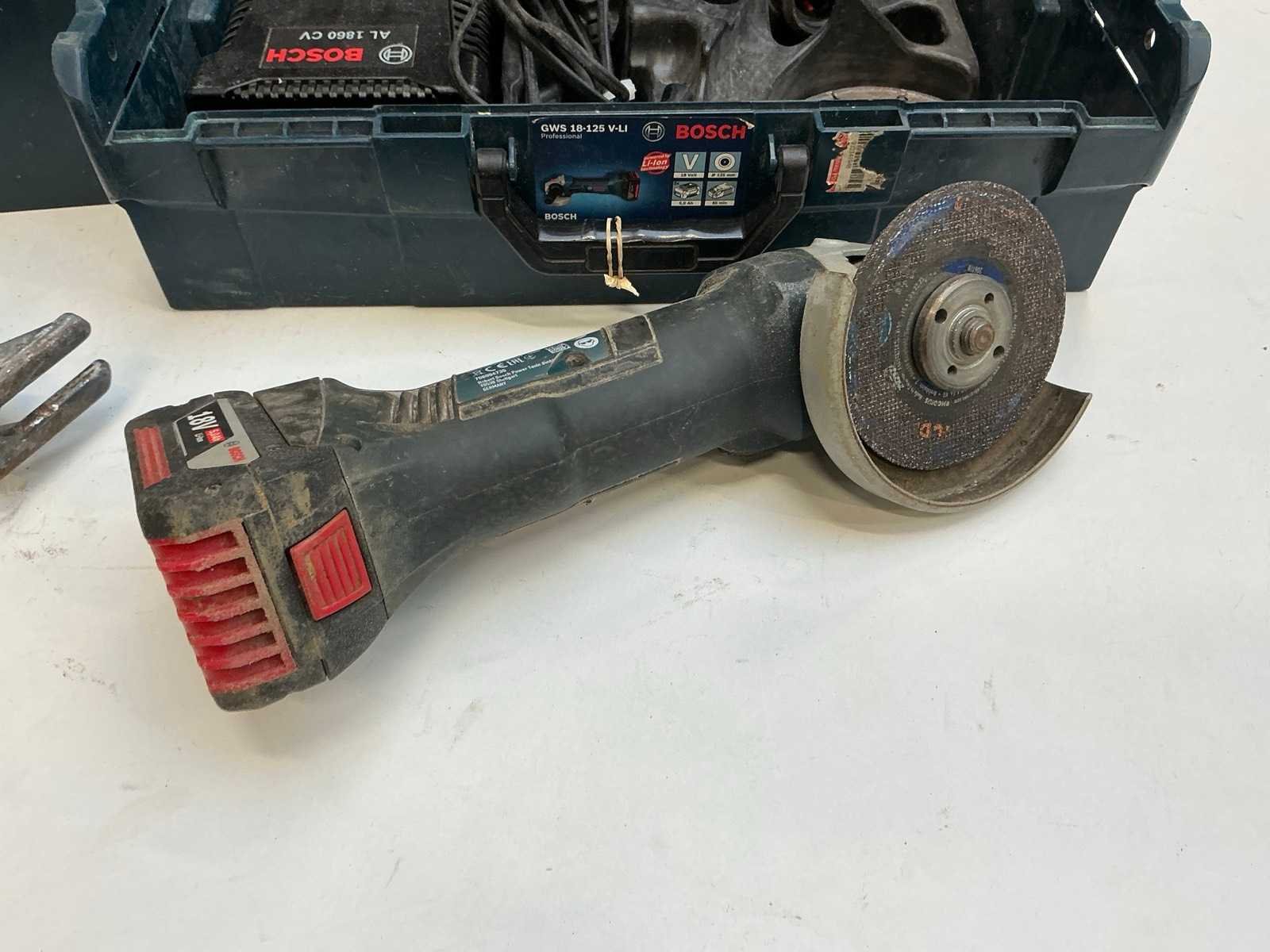 Zijnde: - GWS 18-125 V-LI haakse slijpmachine Ø125mm, met 1x 18V-accu en lader, s/n 708004735 - GSA 18 V-LI reciprozaag, met 1x 18V-accu en lader, s/n 710050165 - GSR 18 V-EC schroefboormachine, met 1x 18V-accu en lader, s/n 604006767 Merk: Bosch Met koffer: true